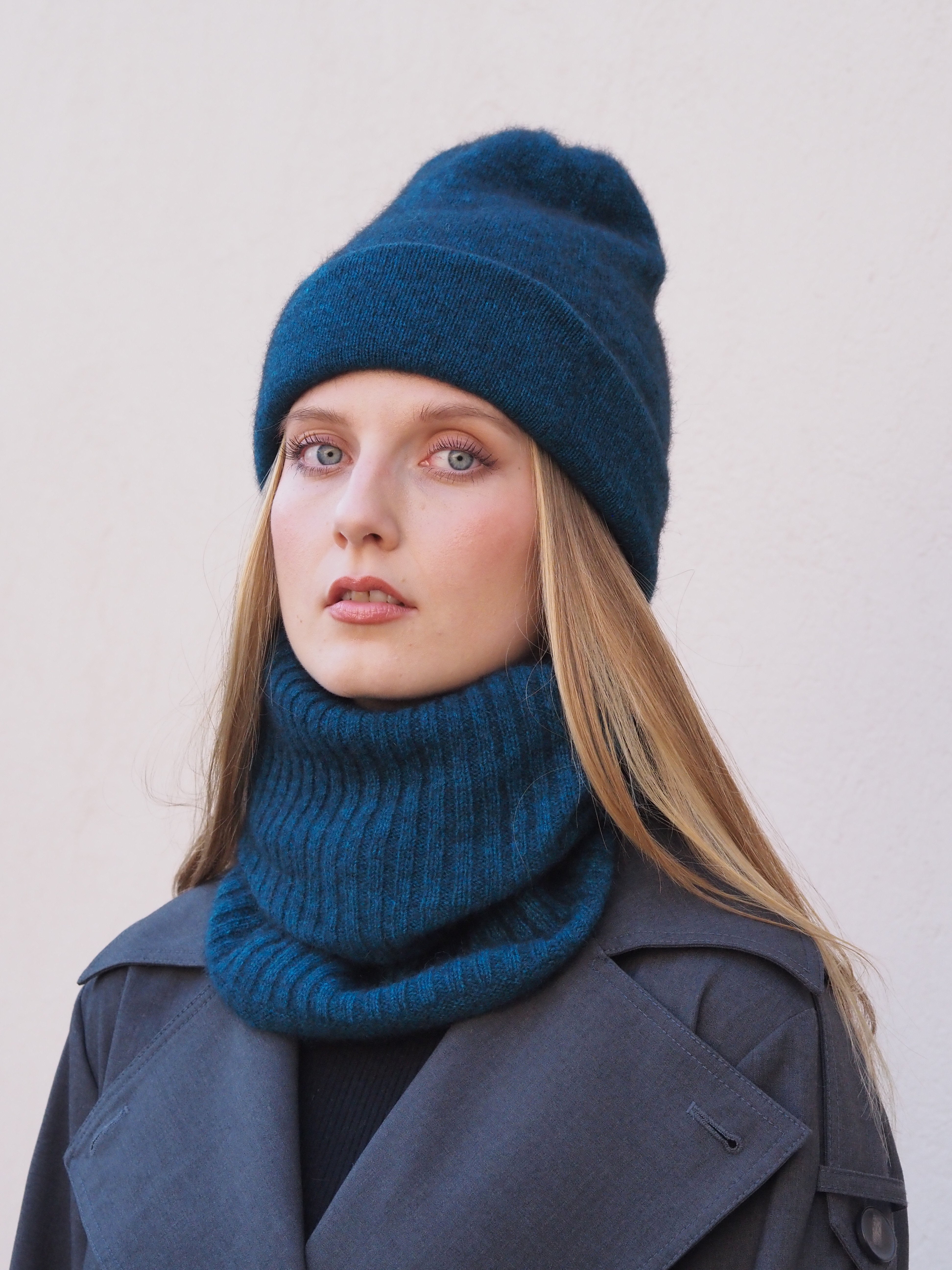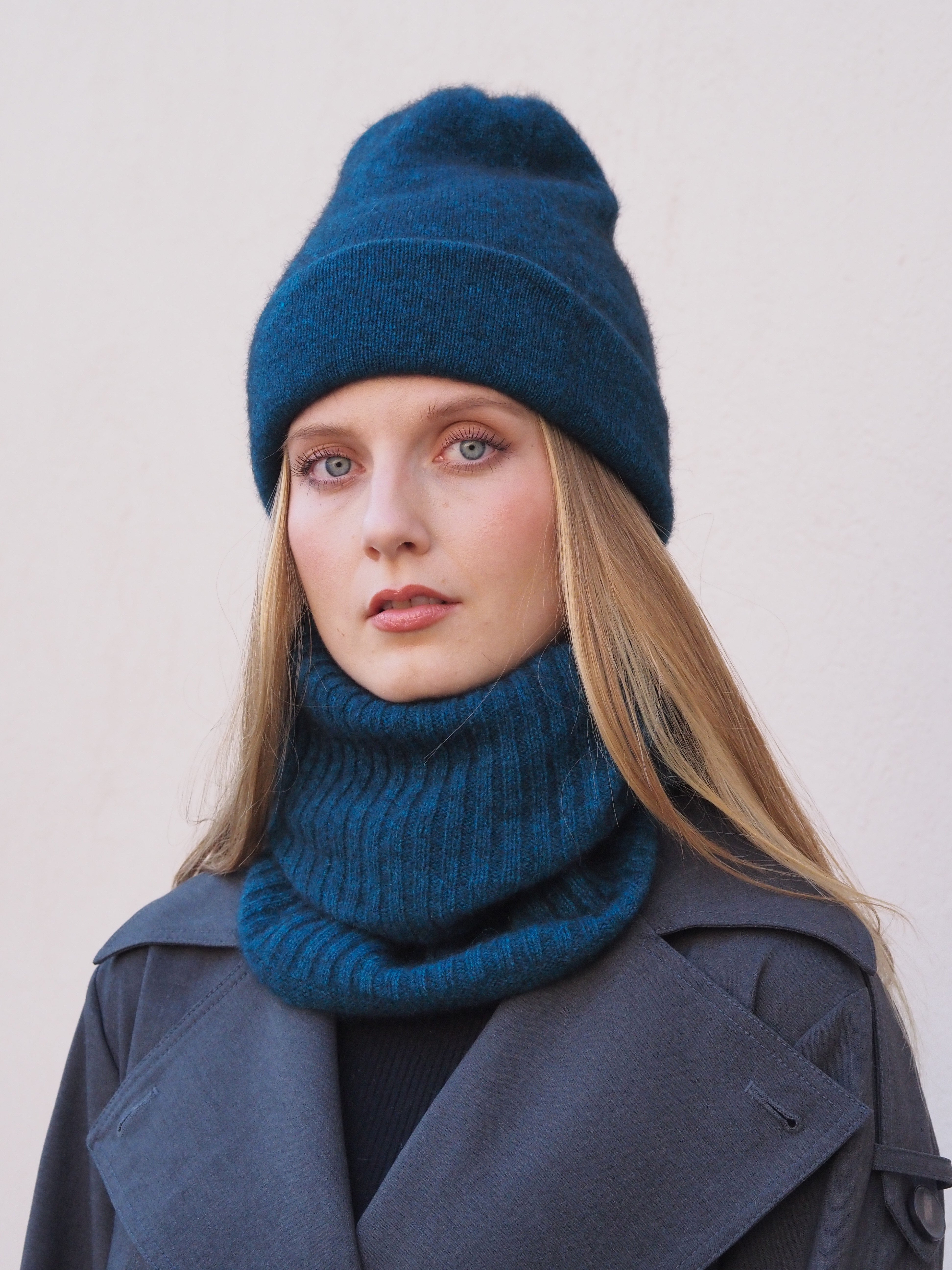 Petrolin sininen, merino-kettukusunkarvaneuleesta valmistettu sileäneuloksinen pipo. Joustava, unisex tuplapipo sopii koko perheelle. Pipo tulee korville nelinkertaisesti. Käännettä ei ole kiinnitetty millään tavalla, jolloin saat itse määritellä käänteen syvyyden. Ja koska pipossa ei ole saumoja, ei ole siis väliä mitenkä päin se päähän puetaan.