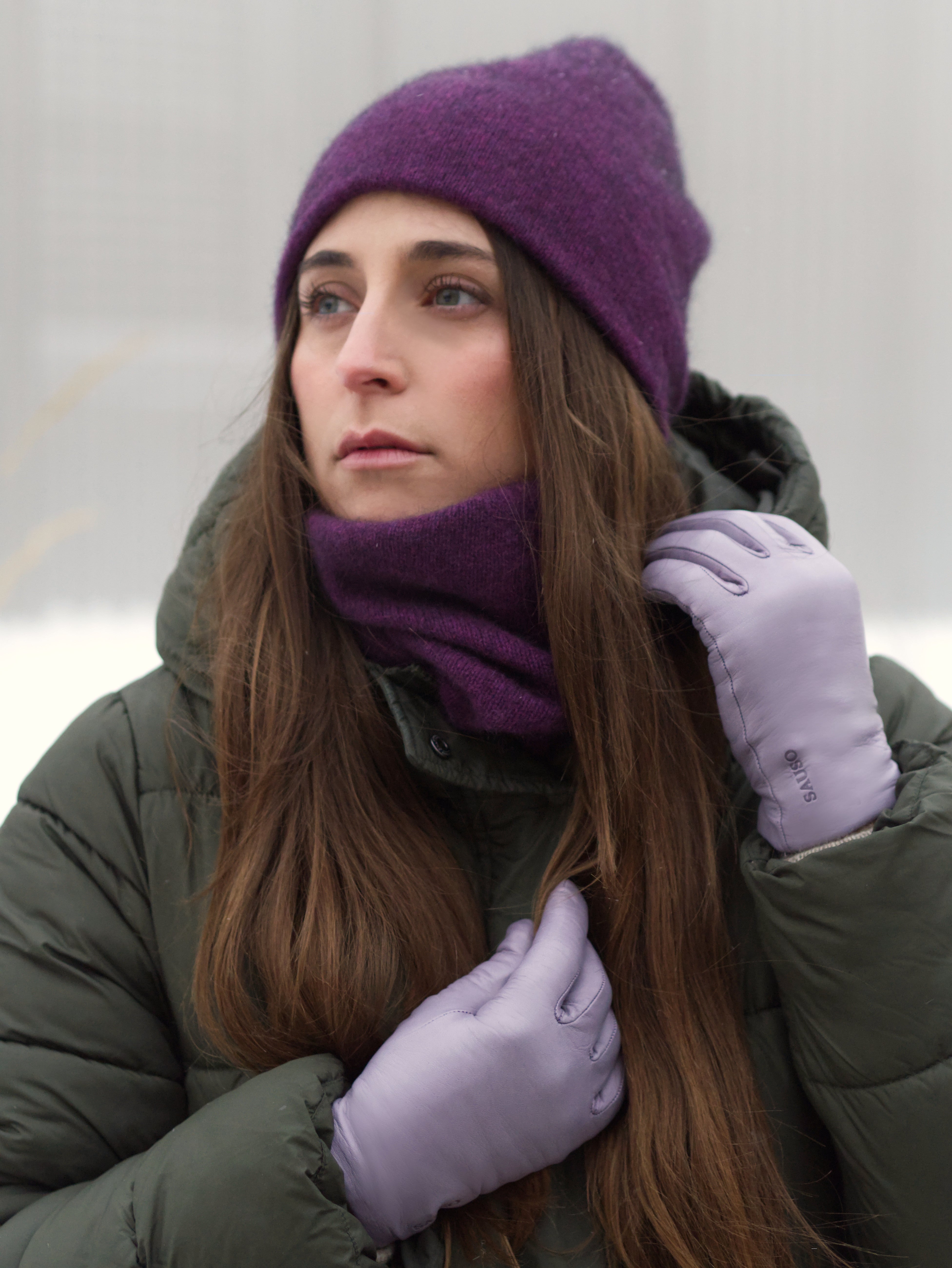 A purple smooth-knit beanie made from merino-silver fox fur knitwear. The stretchy beanie is suitable for the whole family.