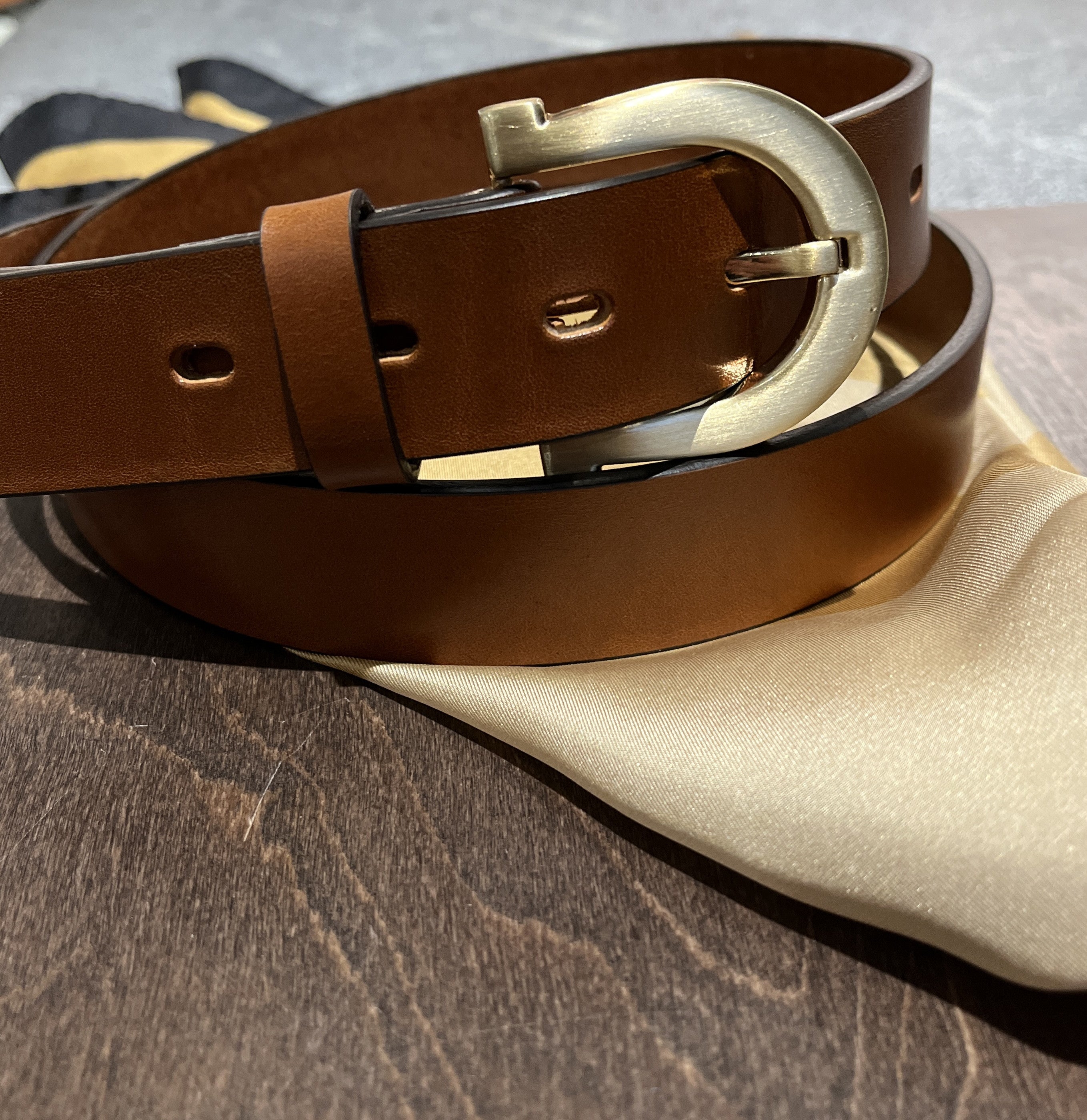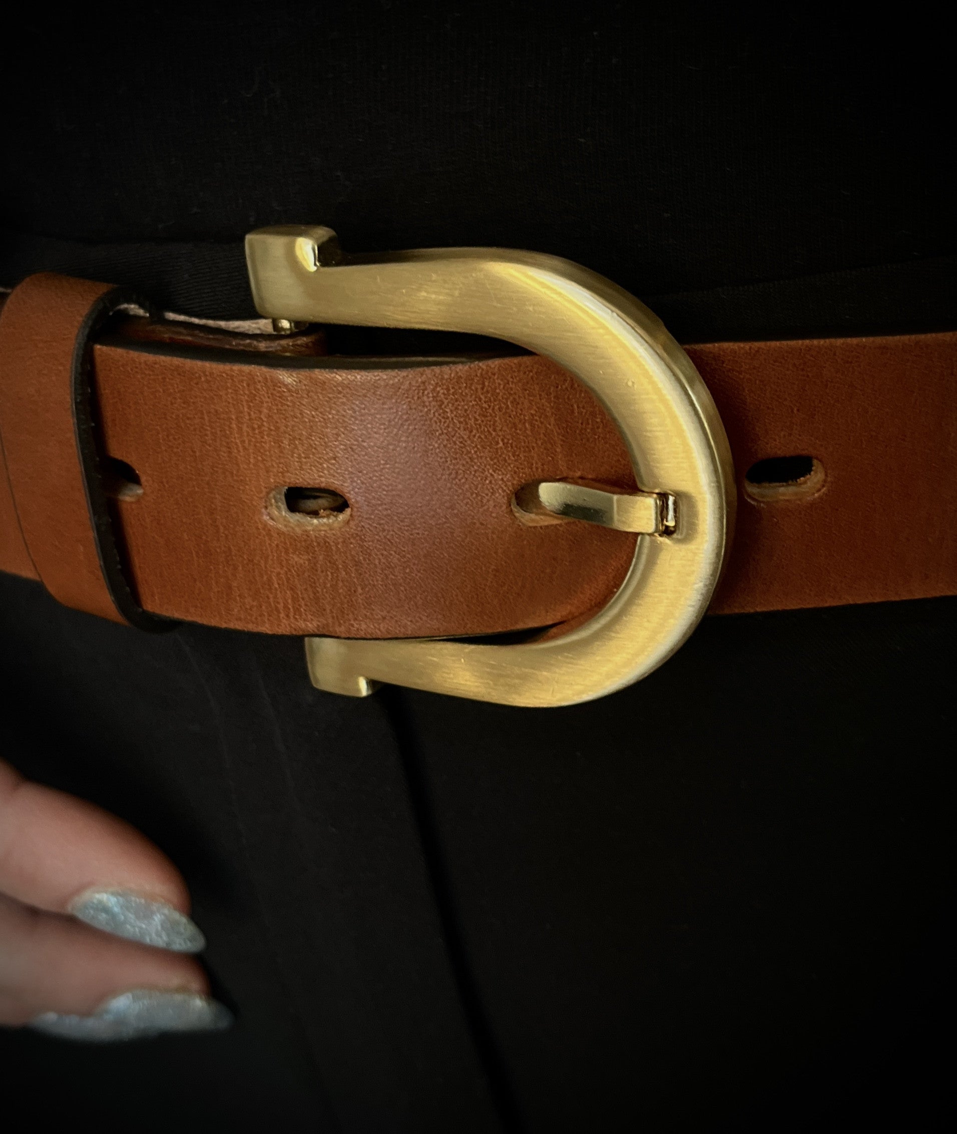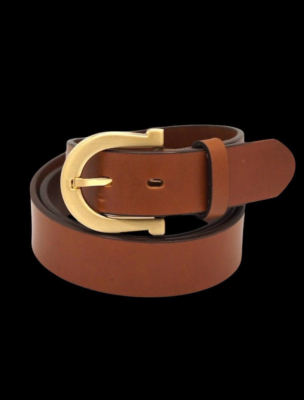 • Cognac brown leather belt with a golden-colored buckle.