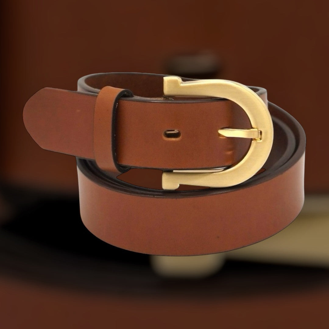 Suomessa vastuullisesti valmistettu konjakin ruskea, unisex nahkavyö sopii kaikkeen pukeutumiseen vuodesta toiseen. Valmistettu kasviparkitusta naudannahasta. Tyylikäs satiinikultainen solki.