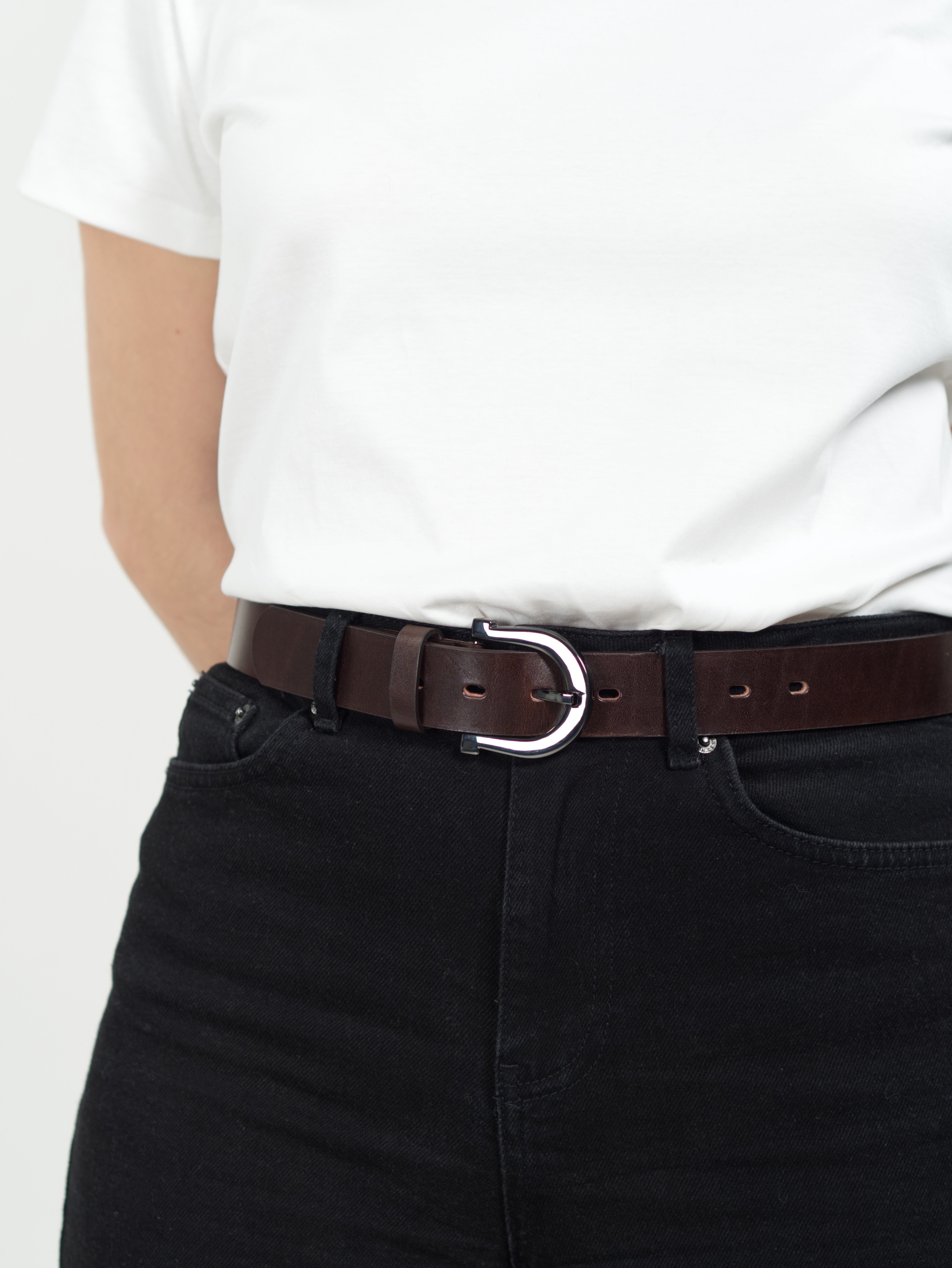Suomessa vastuullisesti valmistettu unisex, tummanruskea nahkavyö sopii kaikkeen pukeutumiseen vuodesta toiseen. Valmistettu kasviparkitusta naudannahasta. Vyön solki black/gunmetal, joka sopii kaiken värisiin koruihin ja laukkujen heloihin ja metalliosiin.