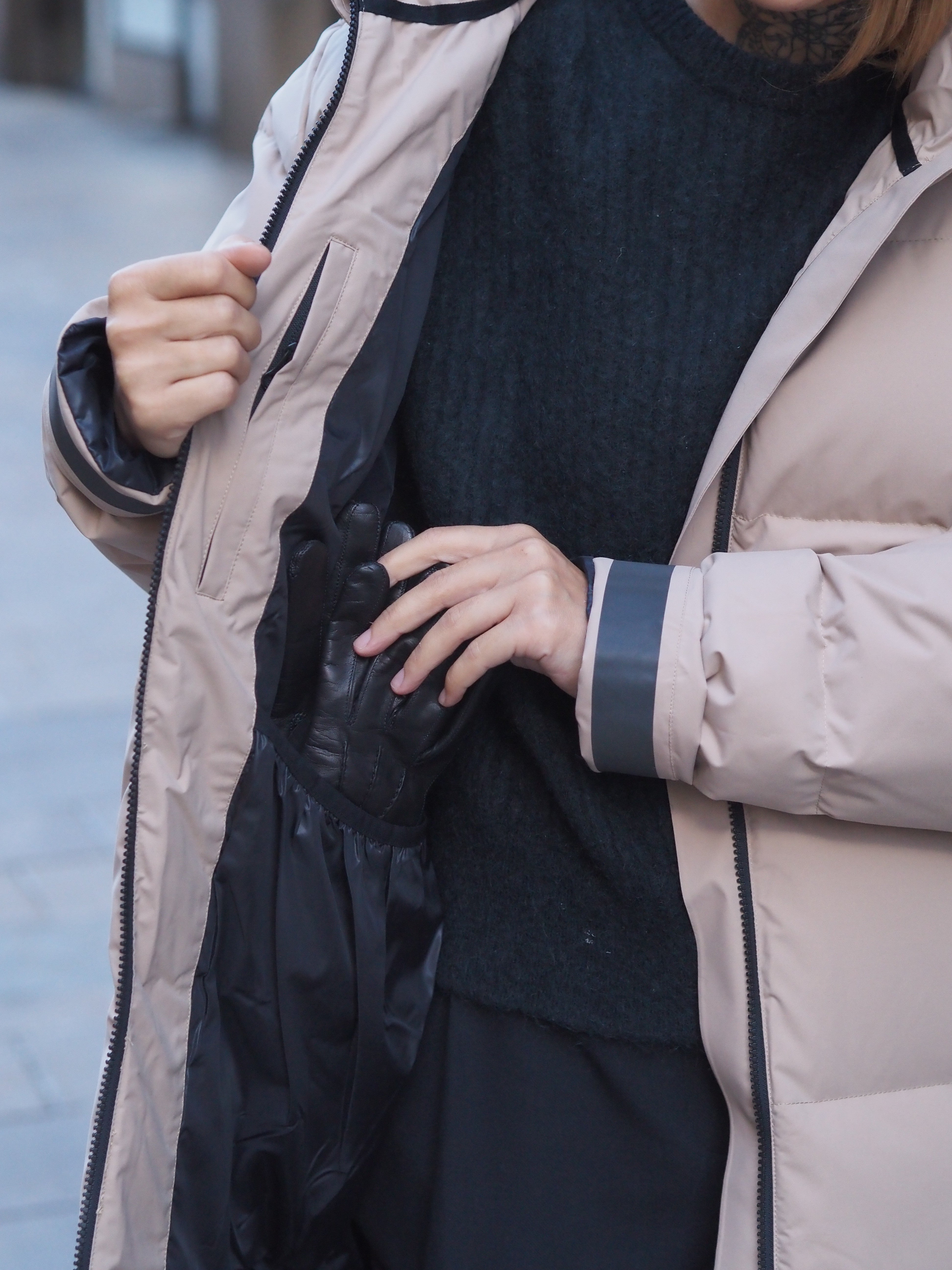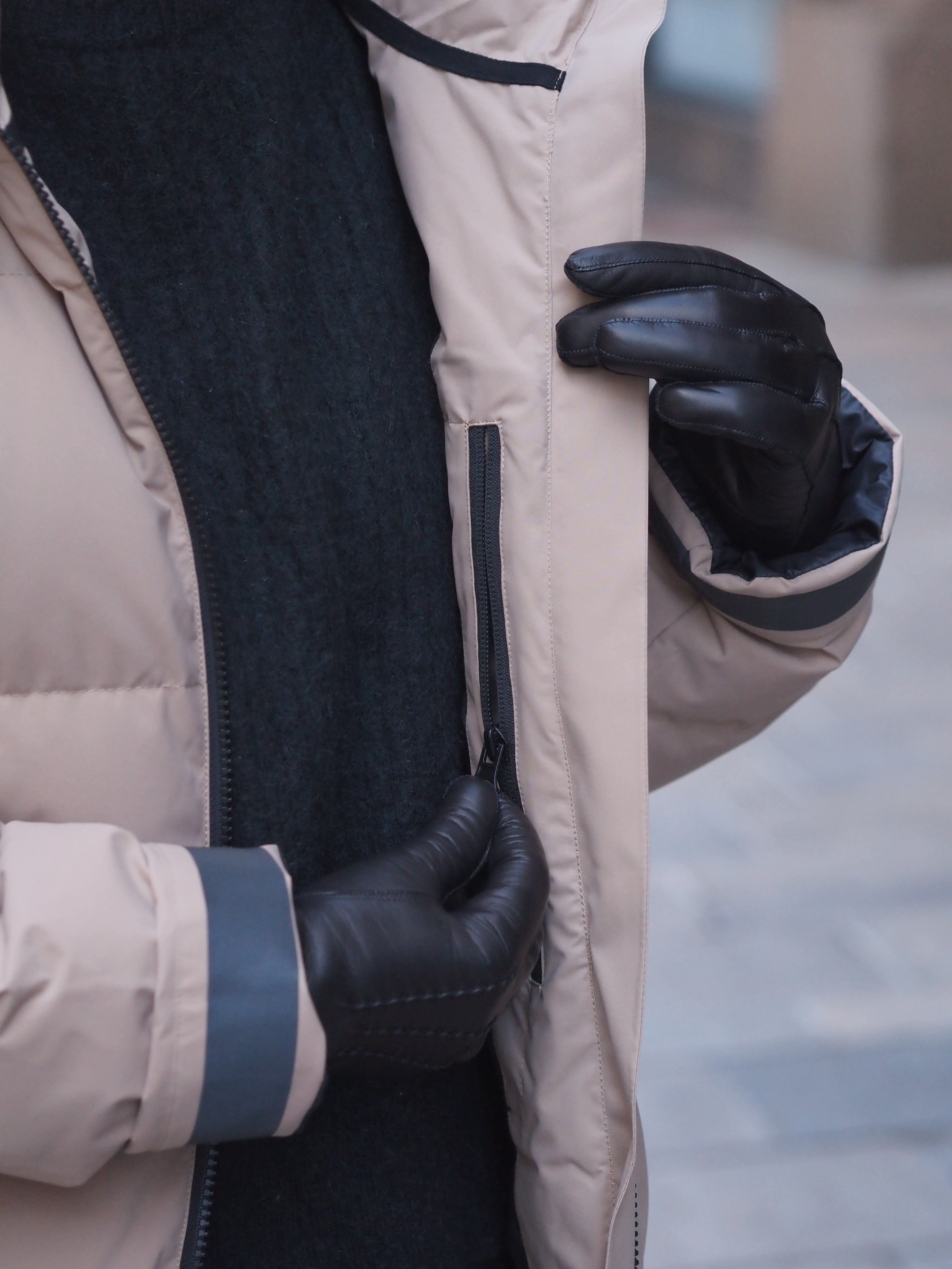 - Pue pestävä käsine käteesi. Älä upota käsineitä veteen, sillä luonnonkuituiset vuorimateriaalit saattavat kutistua, mikäli veden lämpötila on vahingossa liian korkea. Huomioithan myös, että turkisvuorisia tai muuten turkissomisteisia käsineitä ei voi pestä vedellä.
