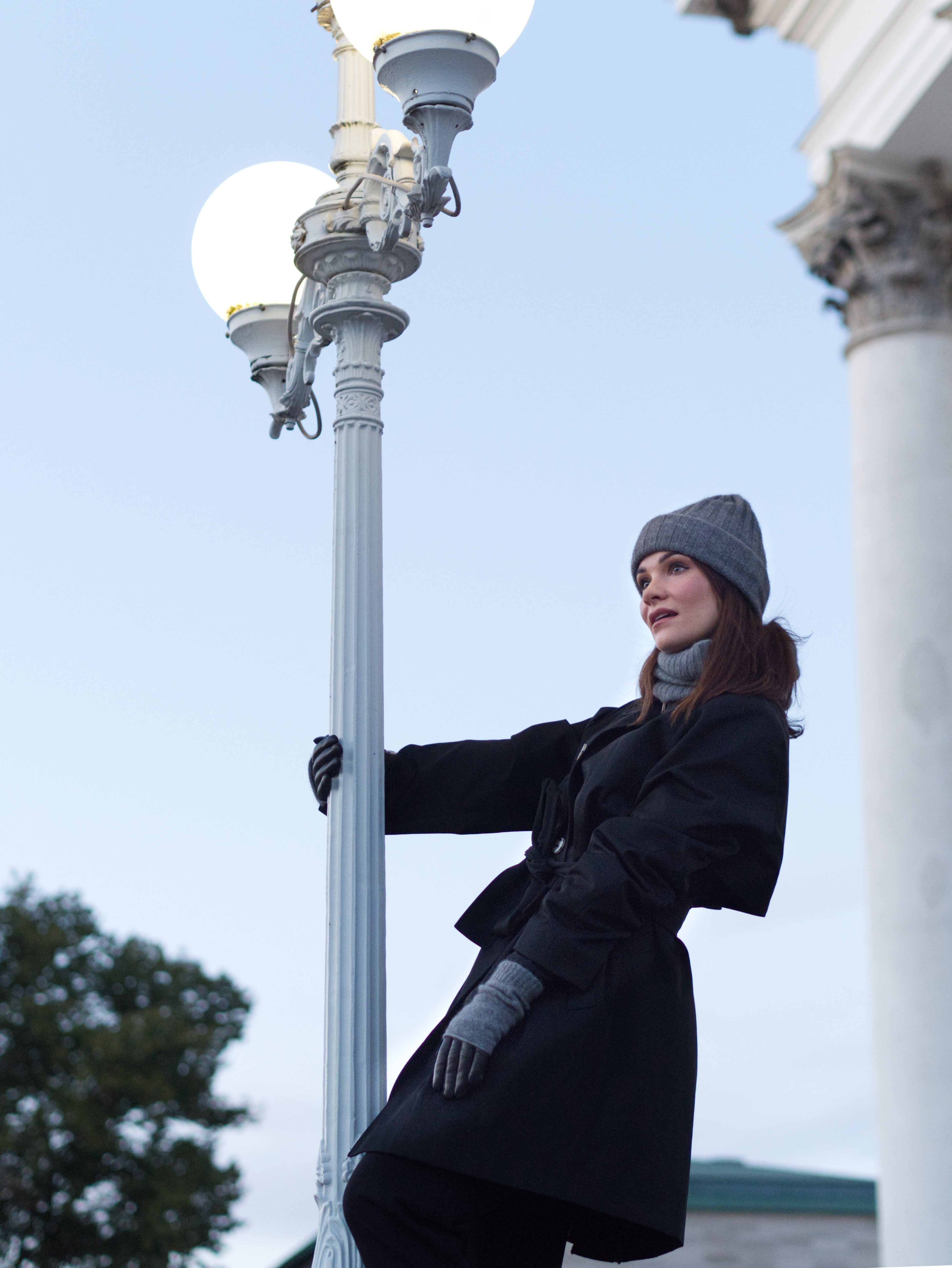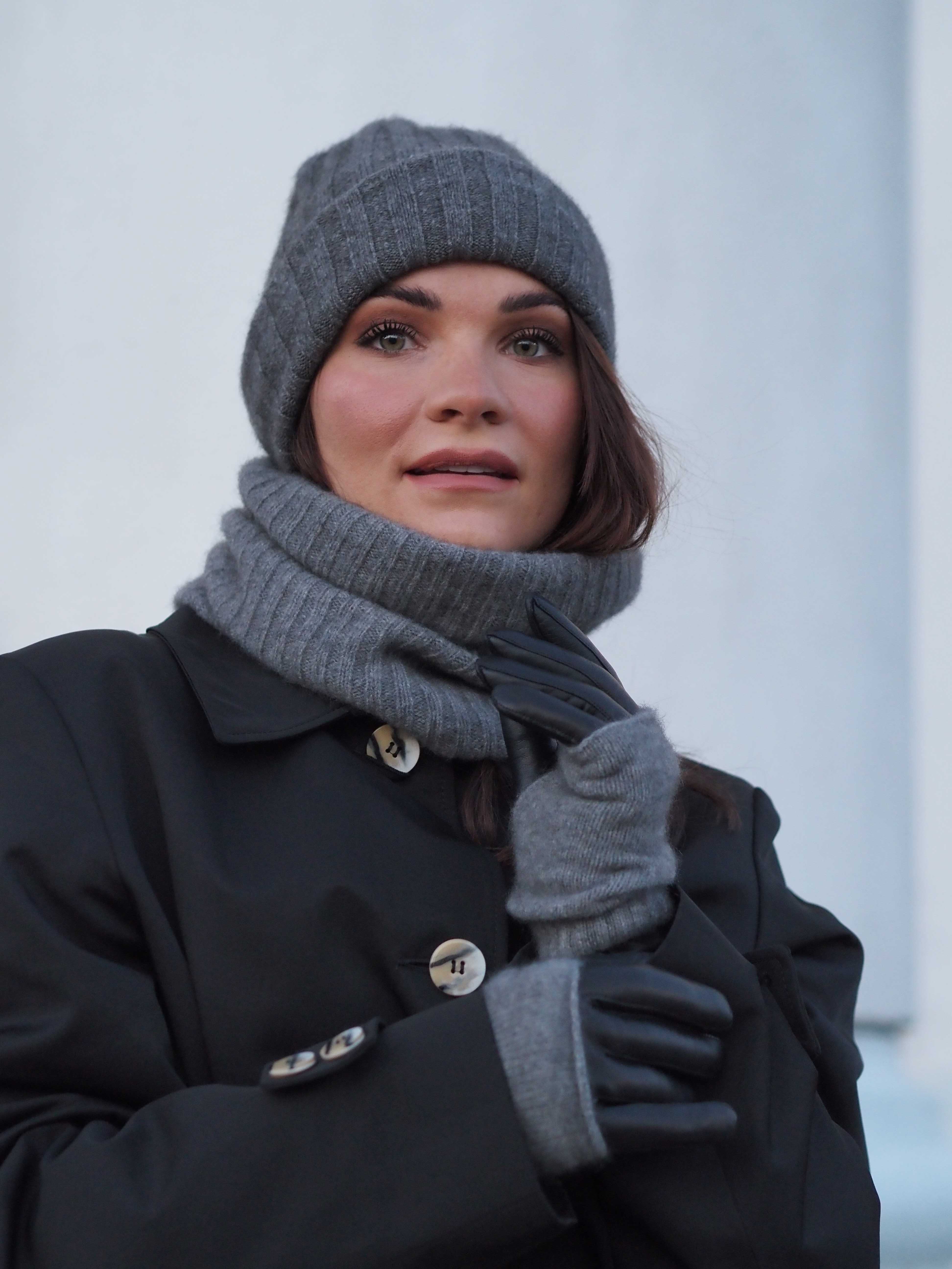 Kestävästä ja lämpimästä merino-kettukusunkarvaneuleesta neulotut harmaat kynsikkäät/kädenlämmittimet.