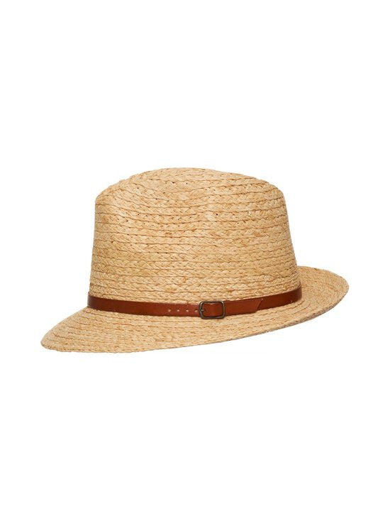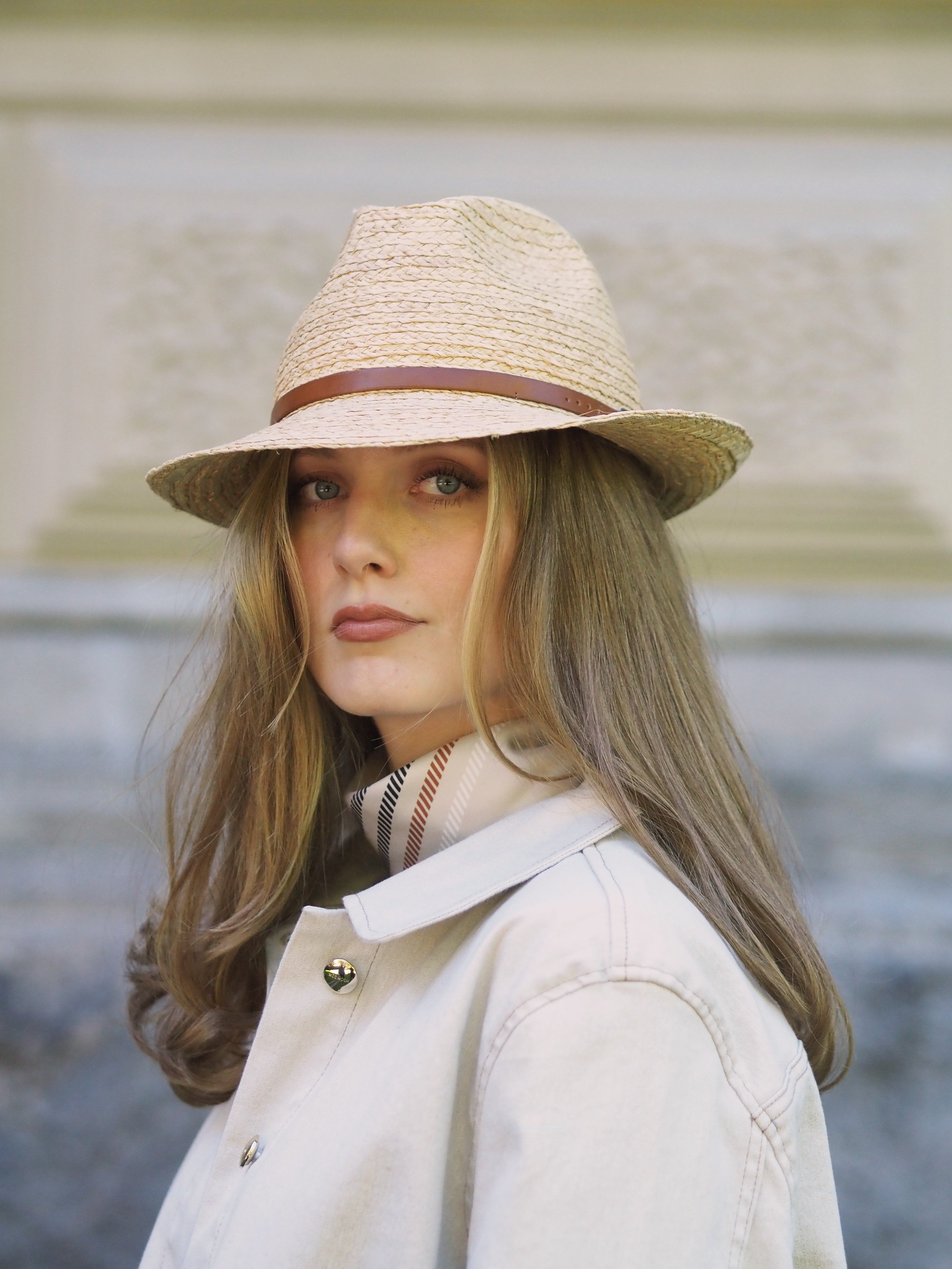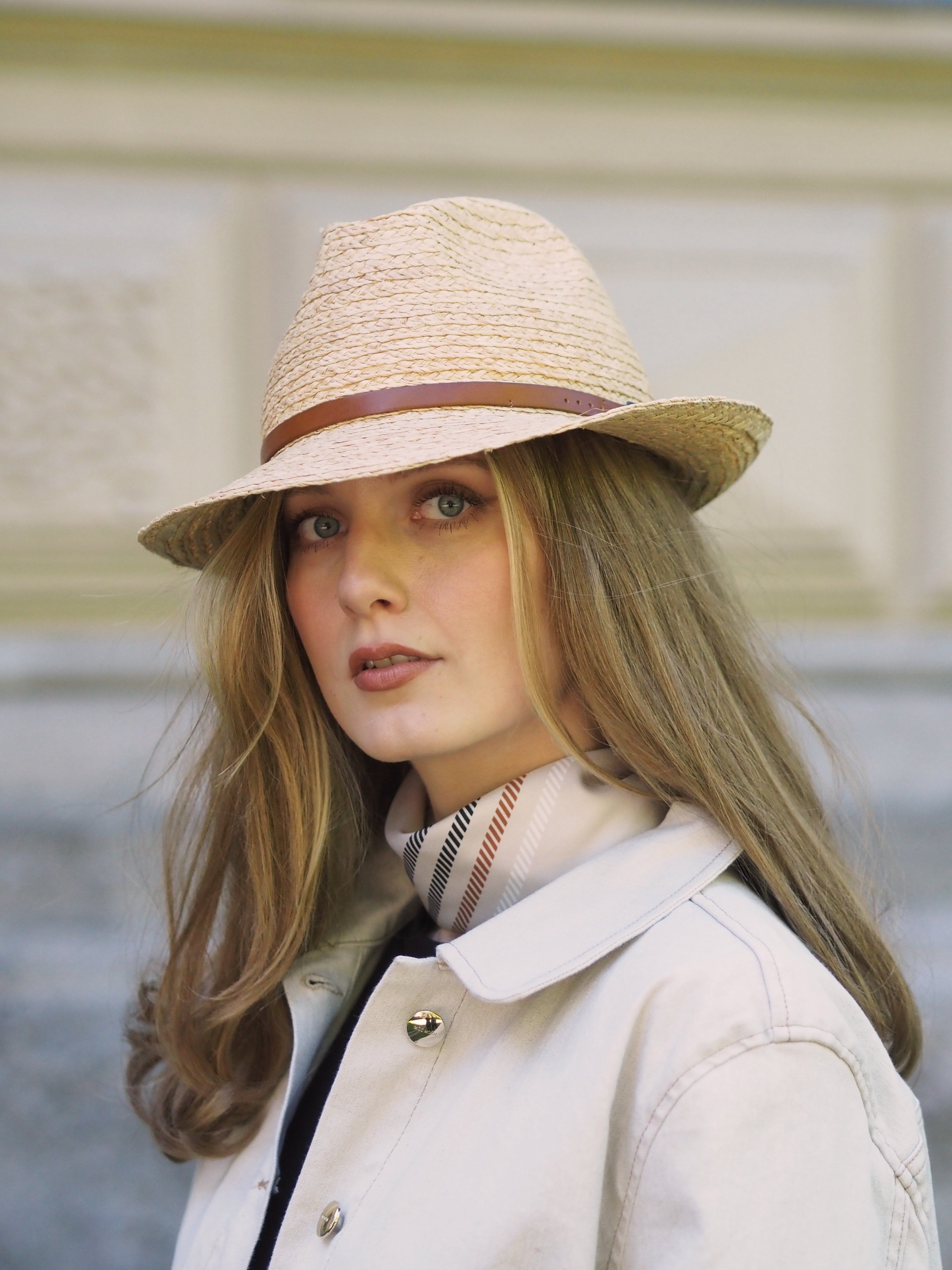 Valmistettu Italiassa. Nahkavyö koristetta voi vaihtaa. Sauson liikkeessä on eri värisiä nahka"vöitä" saatavilla. Naismallilla on Serena silkkihuivi beigenä, jossa samaa konjakin väriä, kuin hatun nahkavyössä.