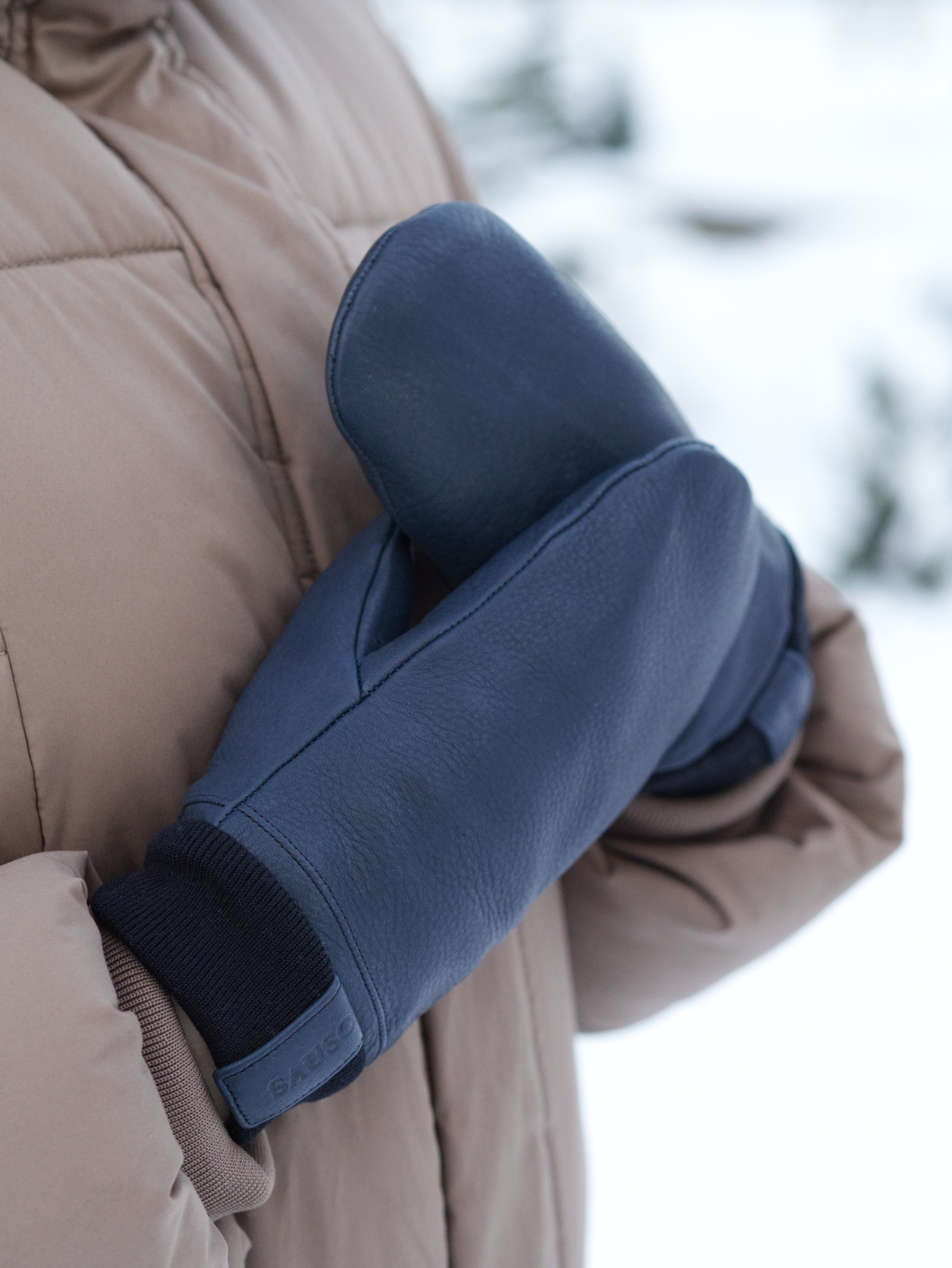 Children's warm leather mittens made from soft and durable reindeer leather. The soft sheepskin keeps little hands comfortably warm throughout the winter.