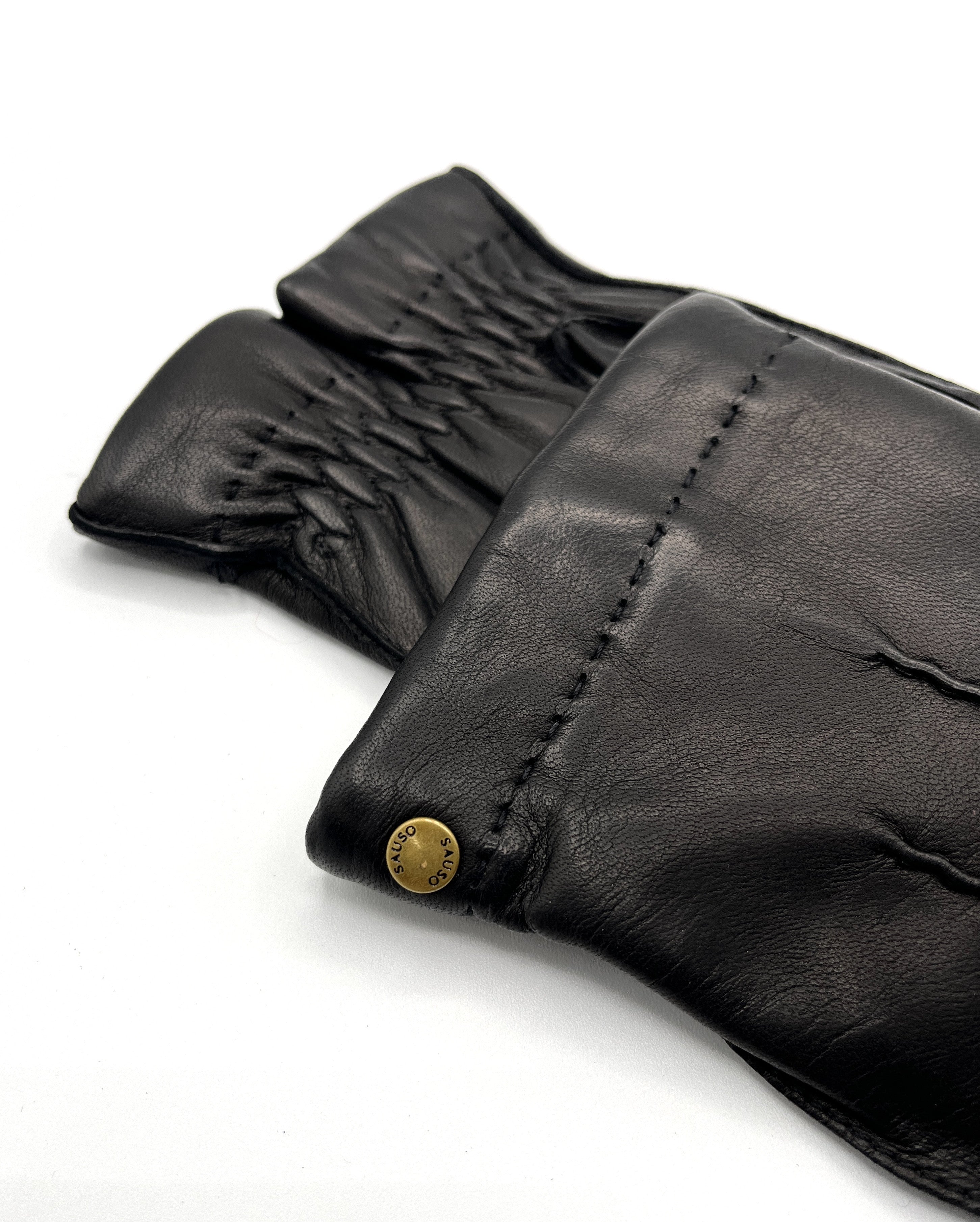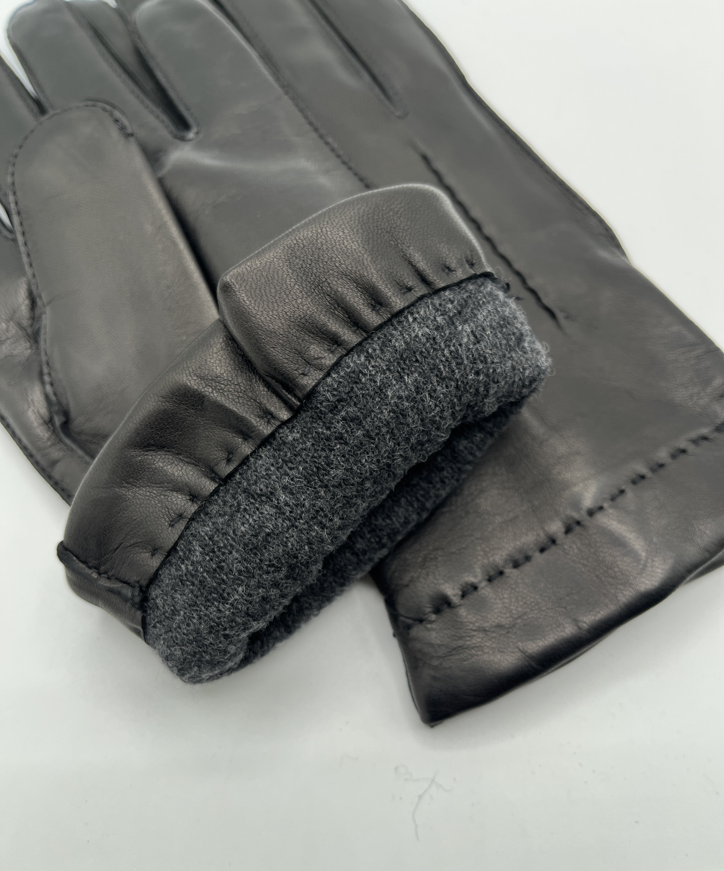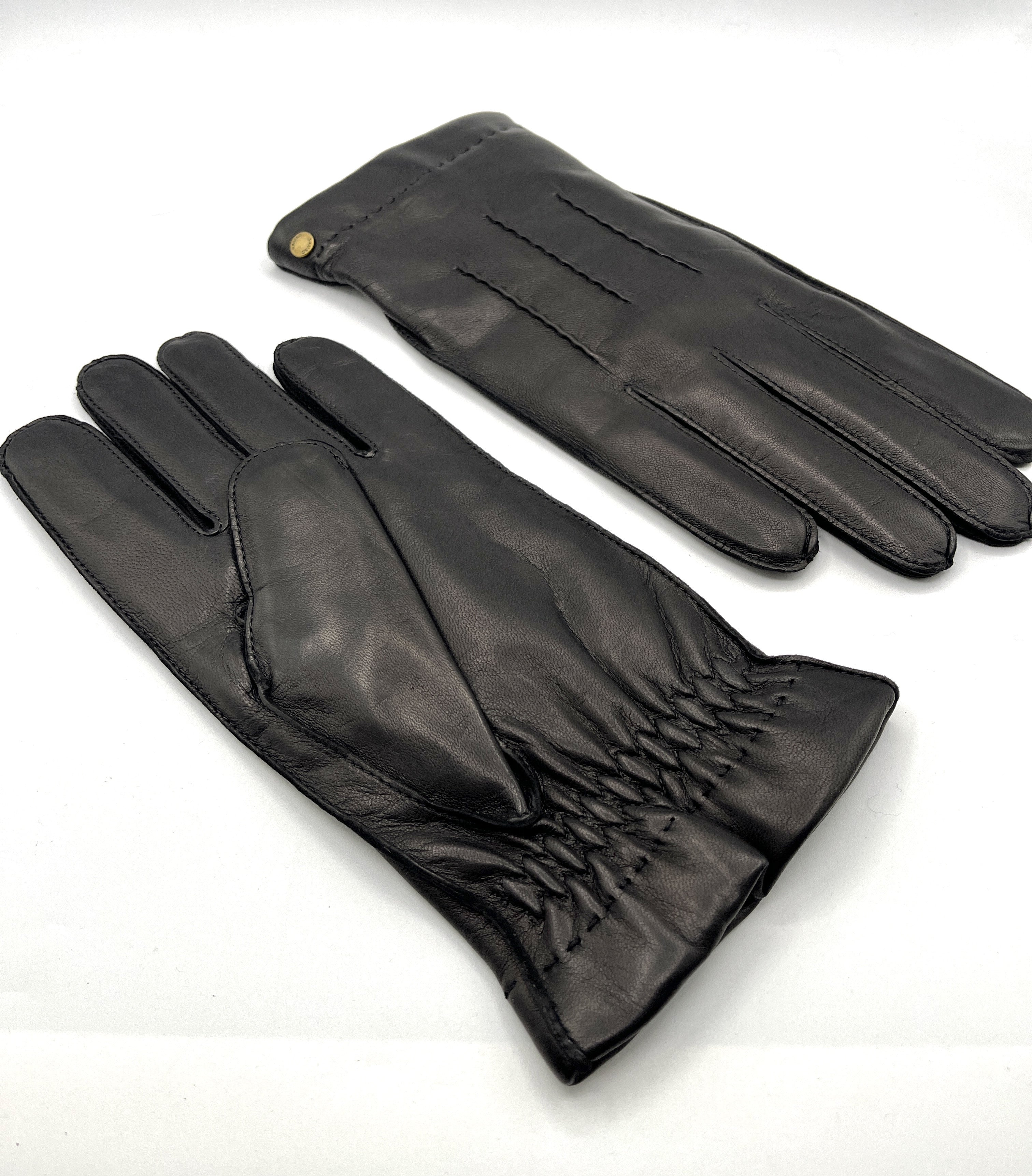 Mustat lammasnappa käsineet, joissa 100% merinovilla vuori, reilu ja kaunis rannekuminauha ja käsin ommellut koristetikkaukset ja suuosa.