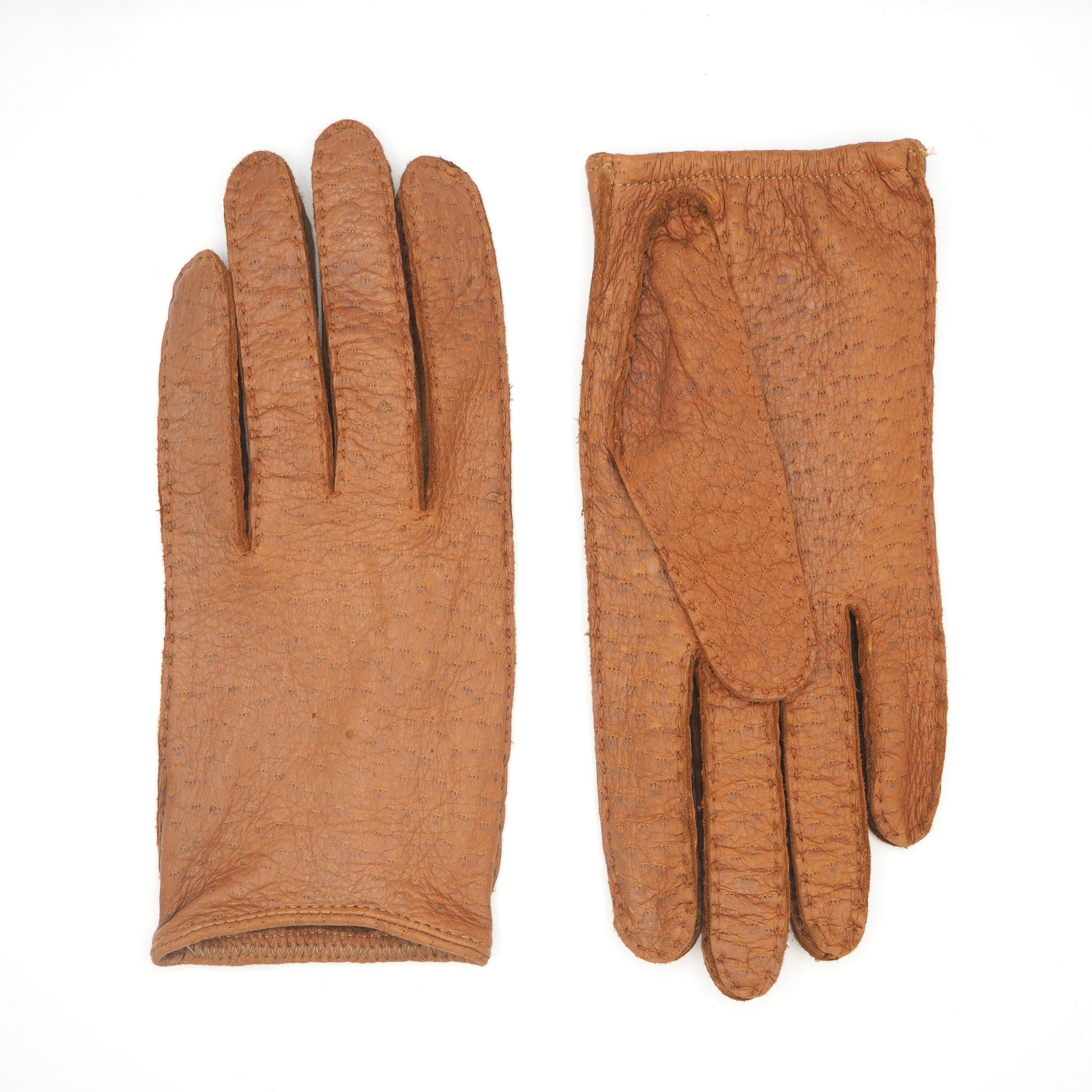 Sophisticated unlined peccary gloves. Beautiful classic cork brown color.