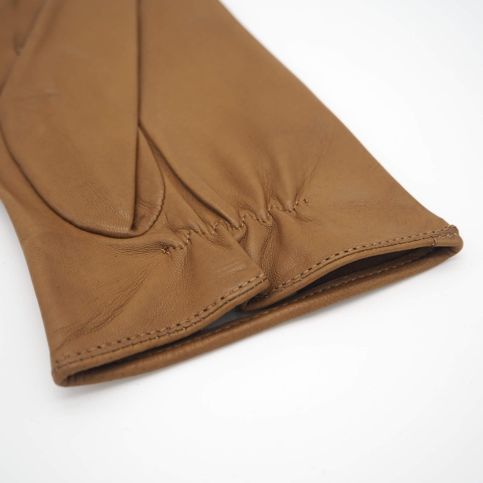 Glove length (measured from the bottom edge of the thumb seam) approx. 3 cm, meaning the glove just covers the wrist but feels light, making it suitable for city use from spring to autumn. An elastic band on the palm side of the wrist increases fit. The model is unlined. As a natural material, the leather may have natural shade variations and small color imperfections.