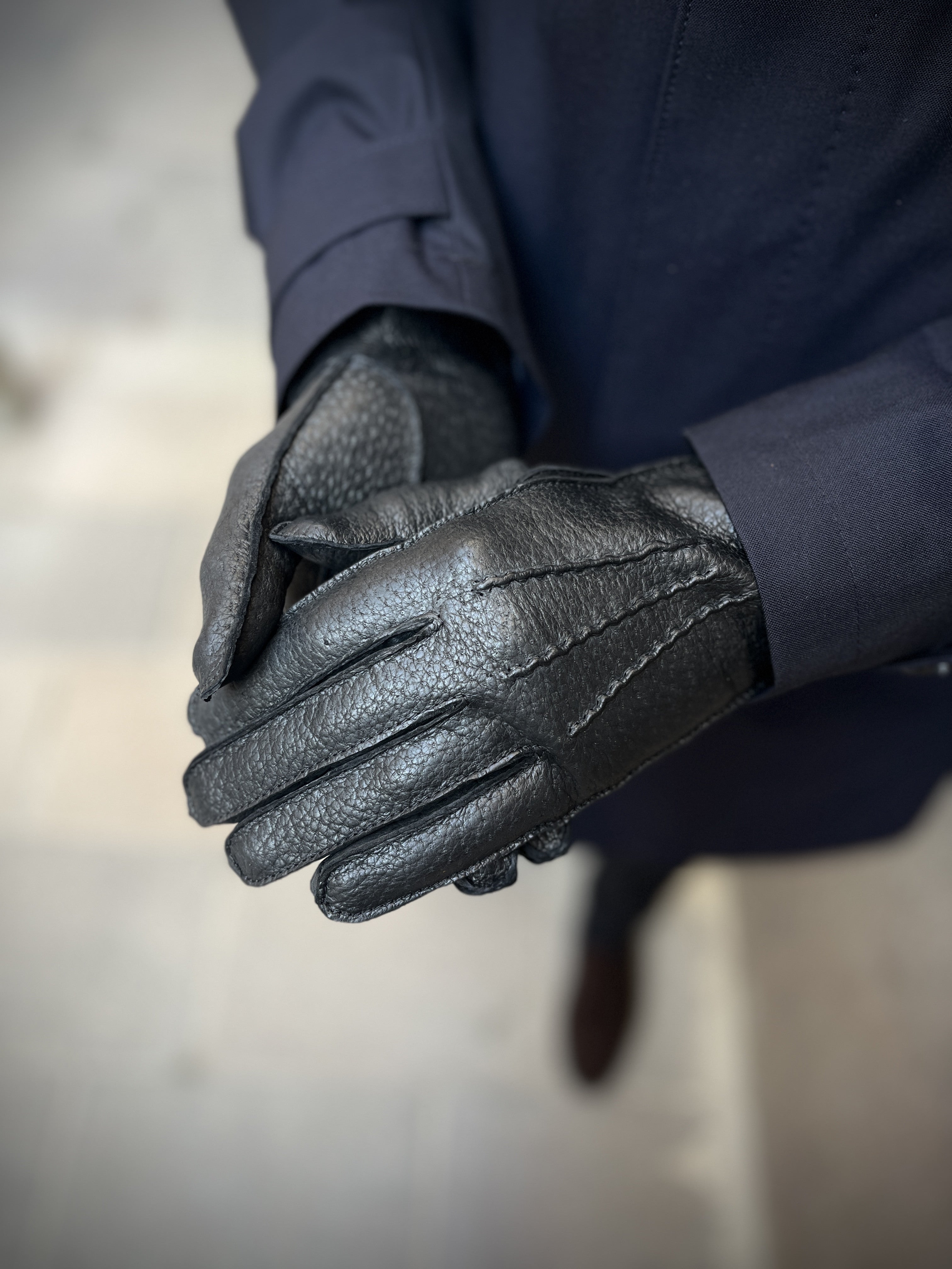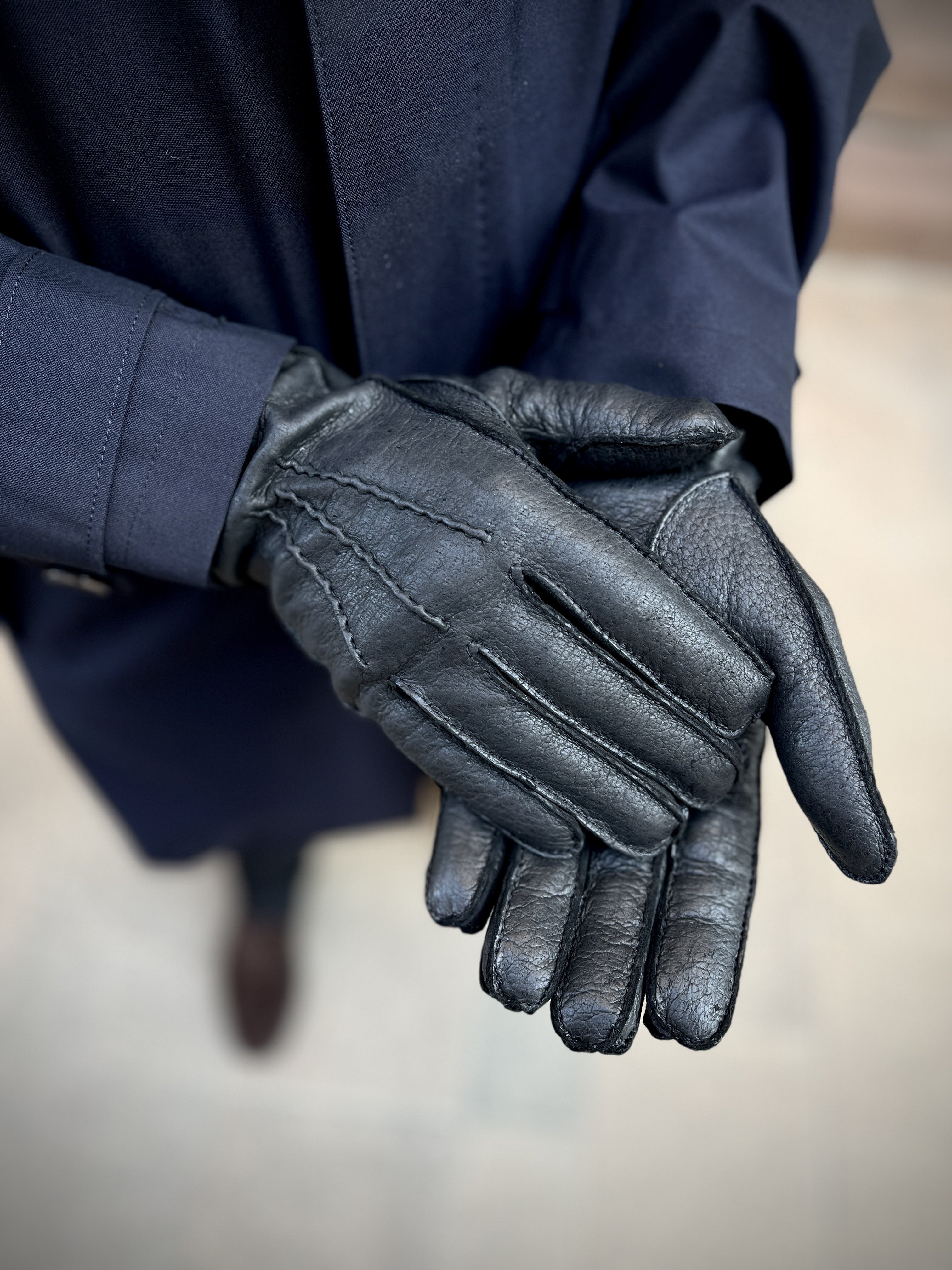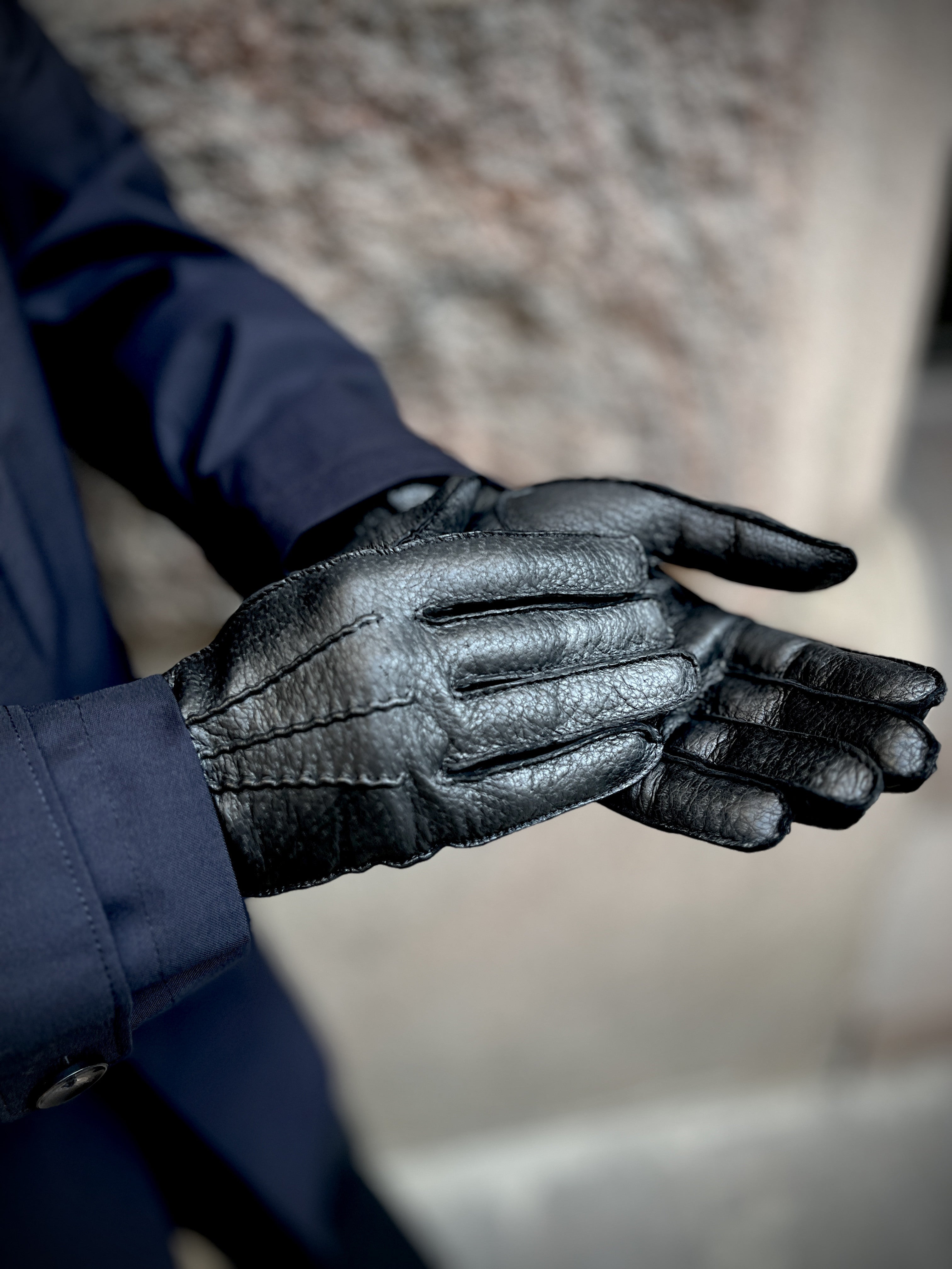 Wild boar leather is velvety soft and durable. At its best, the gloves bring joy for years. The leather's structure is porous, which makes it very warm and soft. The beautiful structure of the leather combined with practical features makes it a unique and special material. The leather's excellent insulation and breathability make the gloves comfortable to wear all year round. Peccary gloves also serve especially well as driving gloves. In unlined gloves, the softness of the leather feels wonderful against the skin, and the gloves provide an excellent grip on the steering wheel.