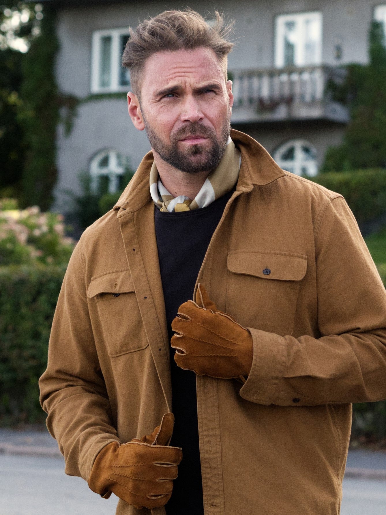 Cognac brown men's leather gloves. Handcrafted gloves suitable for year-round use, but especially for the variable weather of spring and autumn.
