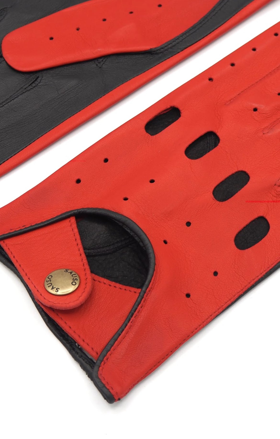 Käsineiden kämmenselän puoli on kirkkaan punaista nappa- eli pintanahkaa. Käsineiden kämmenpuolen nahka on kosketusnäytöllä toimivaa nahkaa. Nahka on käsitelty siten, että ihon sähkö läpäisee sen, mahdollistaen näin kosketusnäyttöjen käyttämisen.