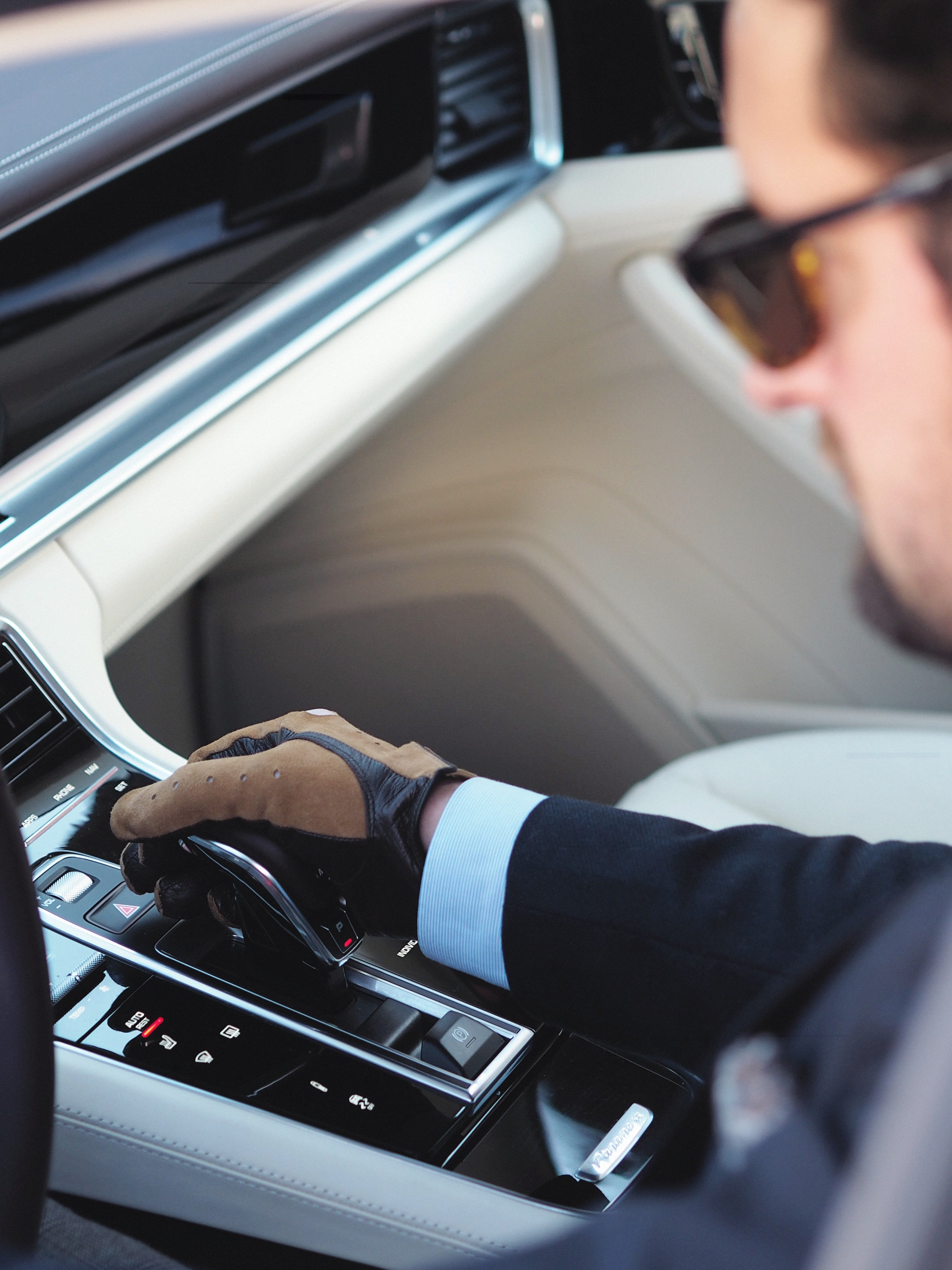 A leather-covered snap button closes the glove tightly around the wrist. The cuff is about 2.5 cm long. The snug fit ensures a good feel on the car steering wheel.