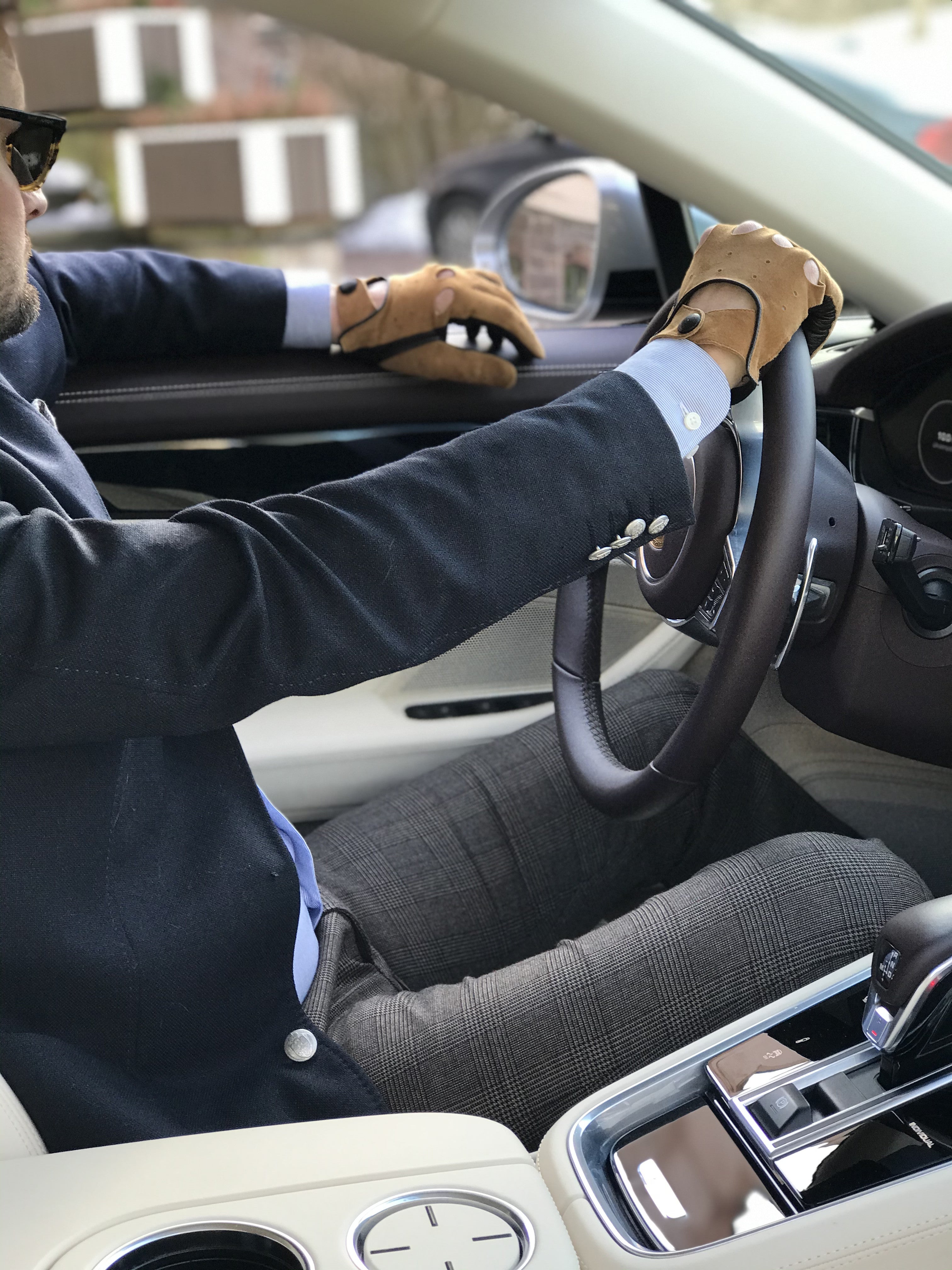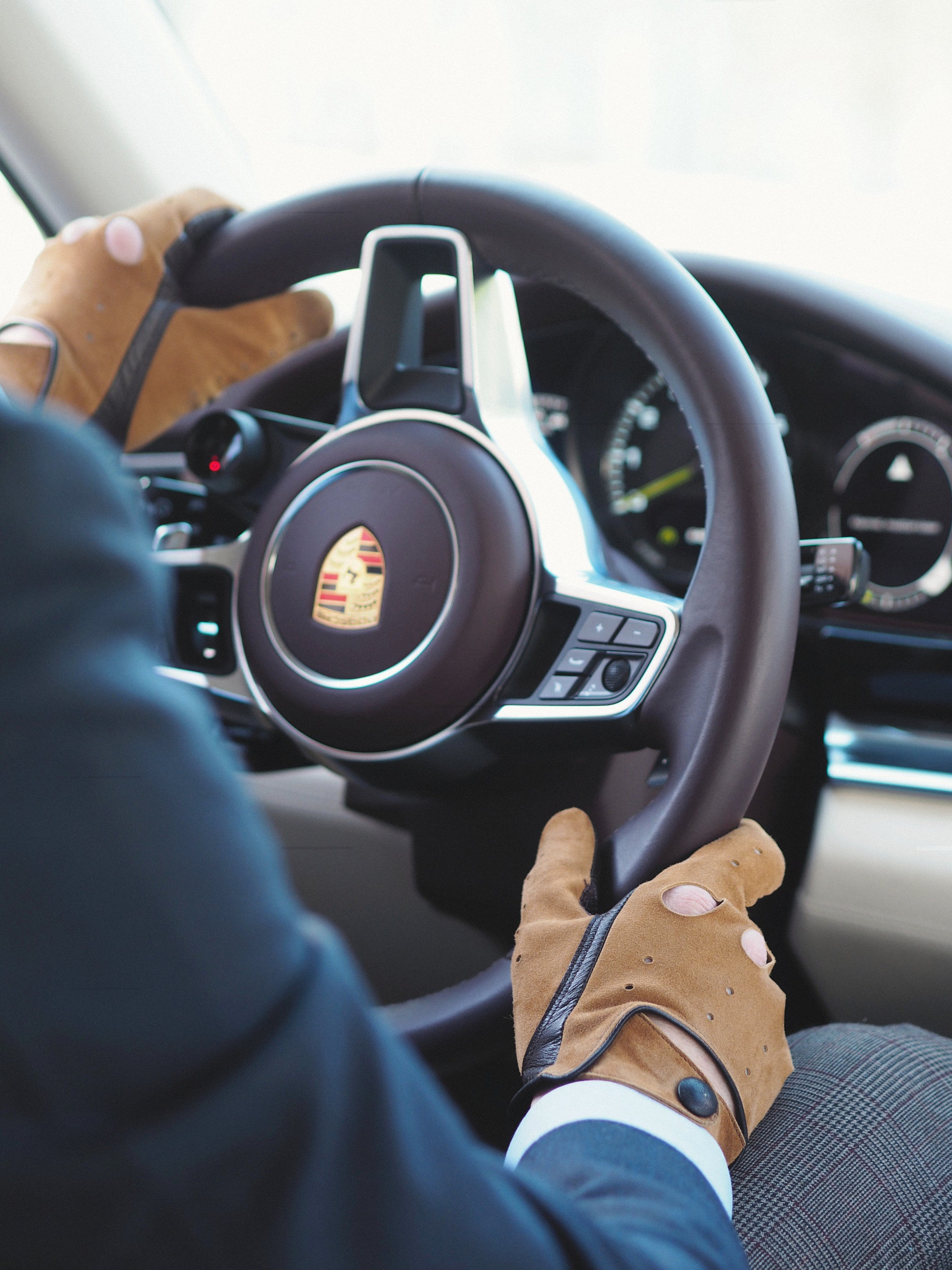 Men\'s stylish driving gloves with a practical touchscreen feature. The driving gloves provide a good grip on the car steering wheel. The gloves also protect the leather steering wheel from skin oils and dirt. As touchscreens become more common in cars and public places, gloves that work with touchscreens are an excellent accessory.