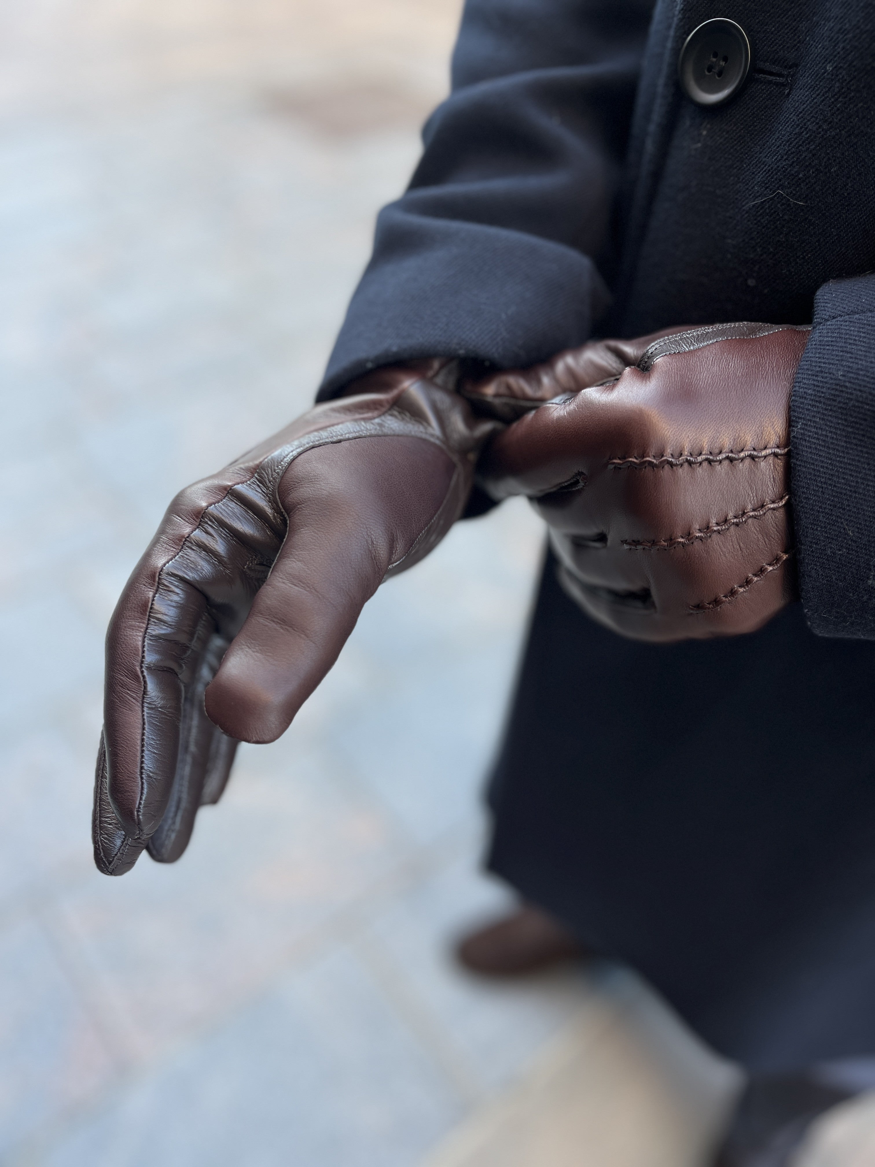 The sheepskin leather is beautifully glossy and flexible. The gloves, handmade from thin and very soft leather, adapt to the shape and movements of the hand. The gloves are supposed to fit very snugly at first.