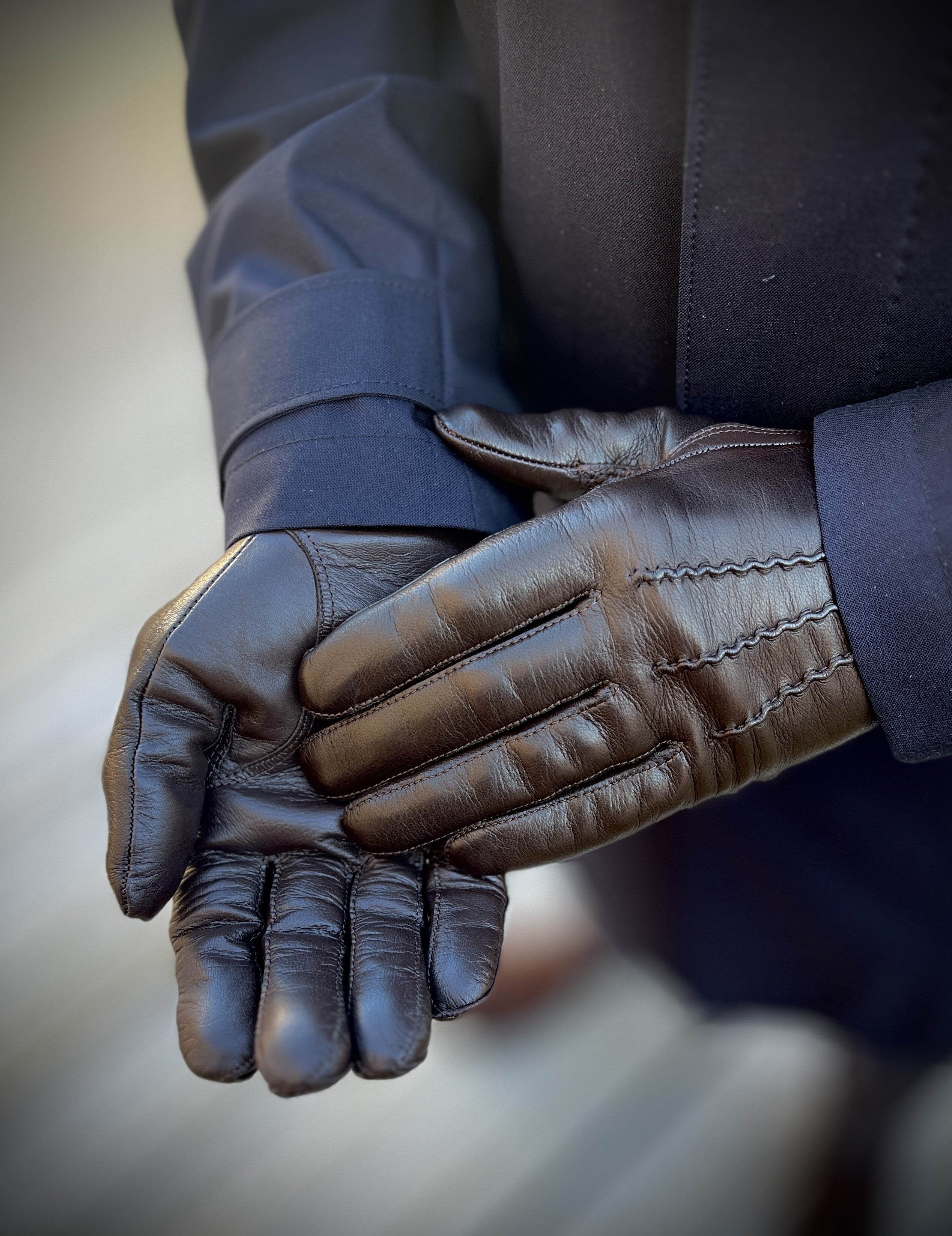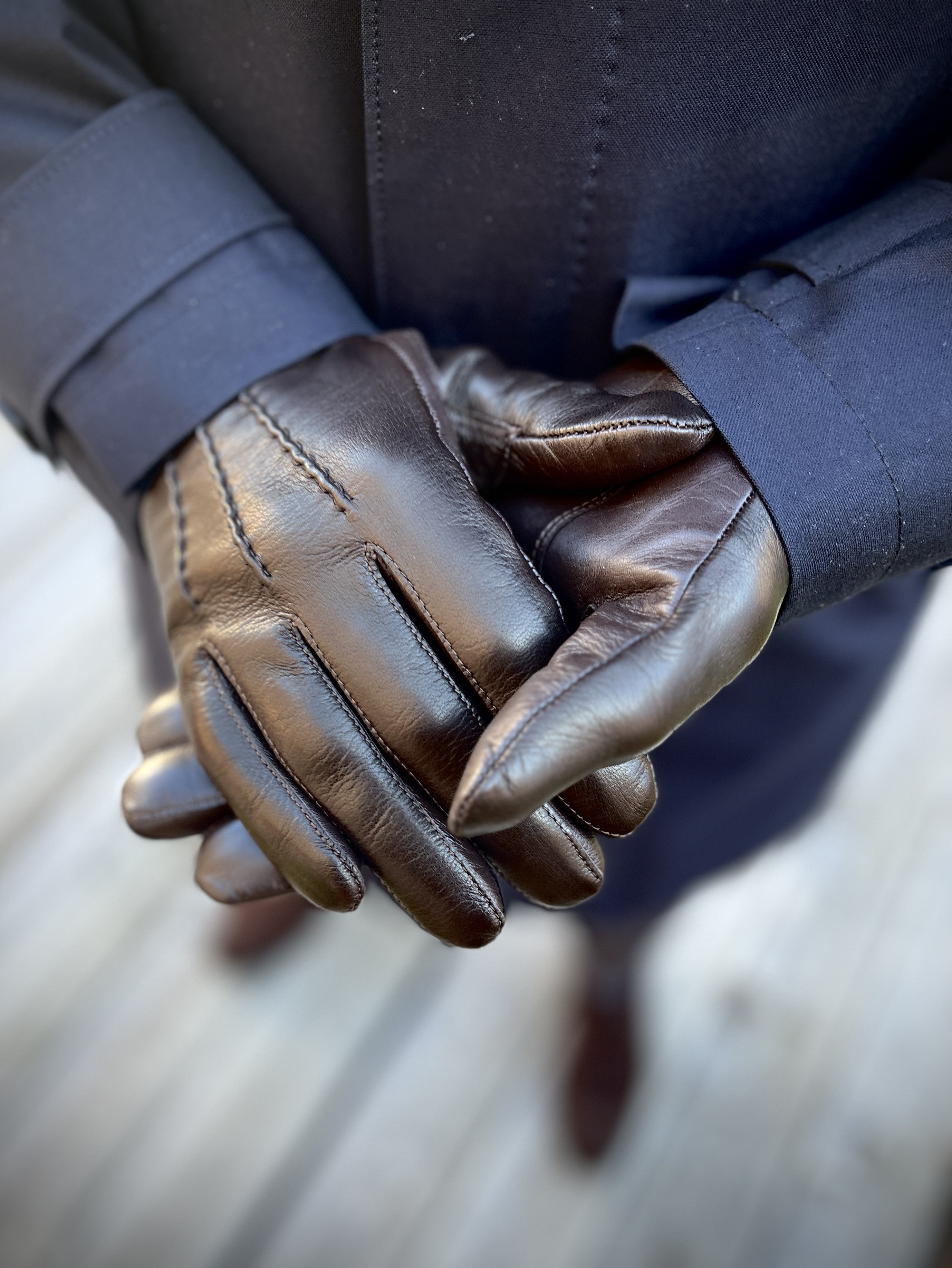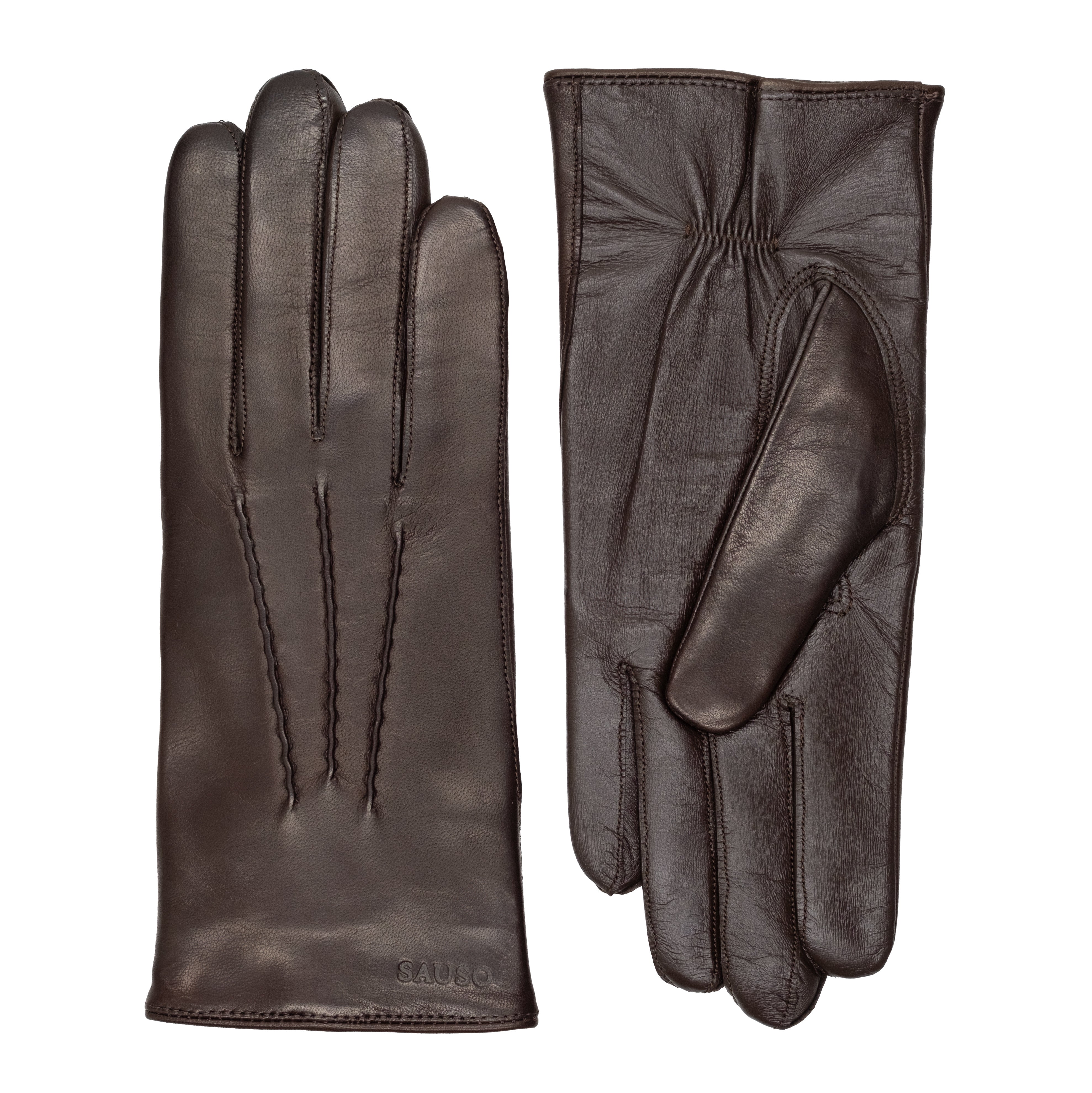 Brown men's leather gloves with warm knit lining. The classic gloves with three hand-stitched decorative seams suit a timeless style. Touchscreen compatible