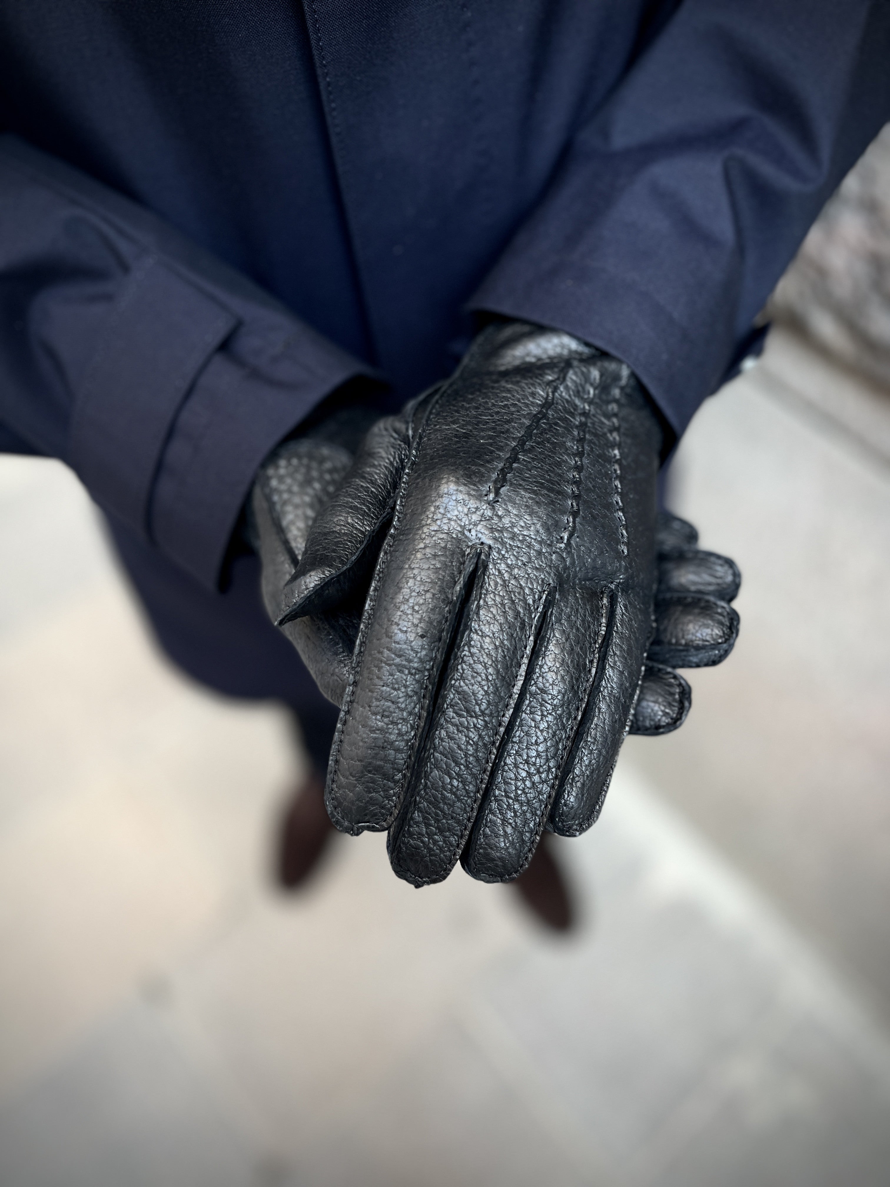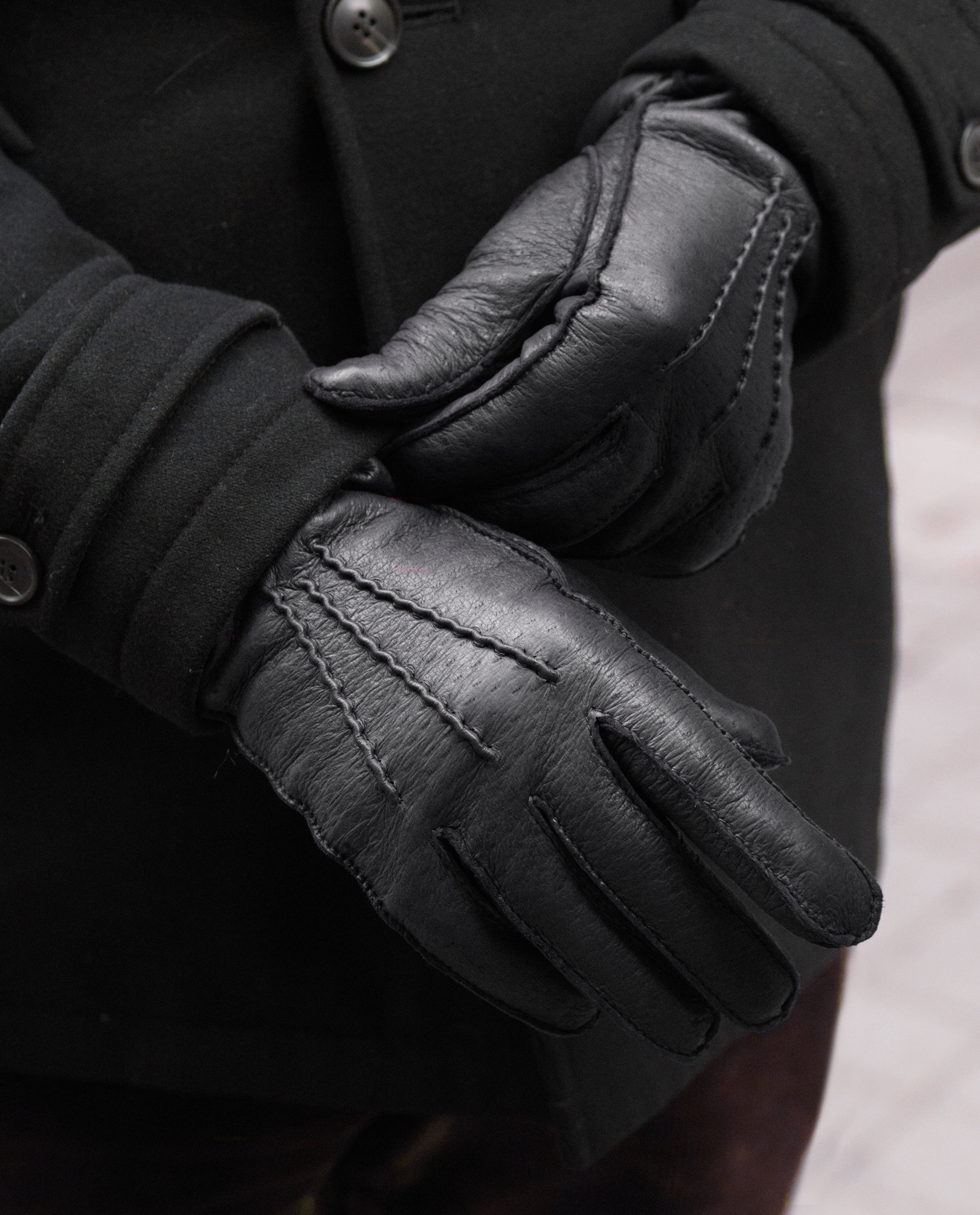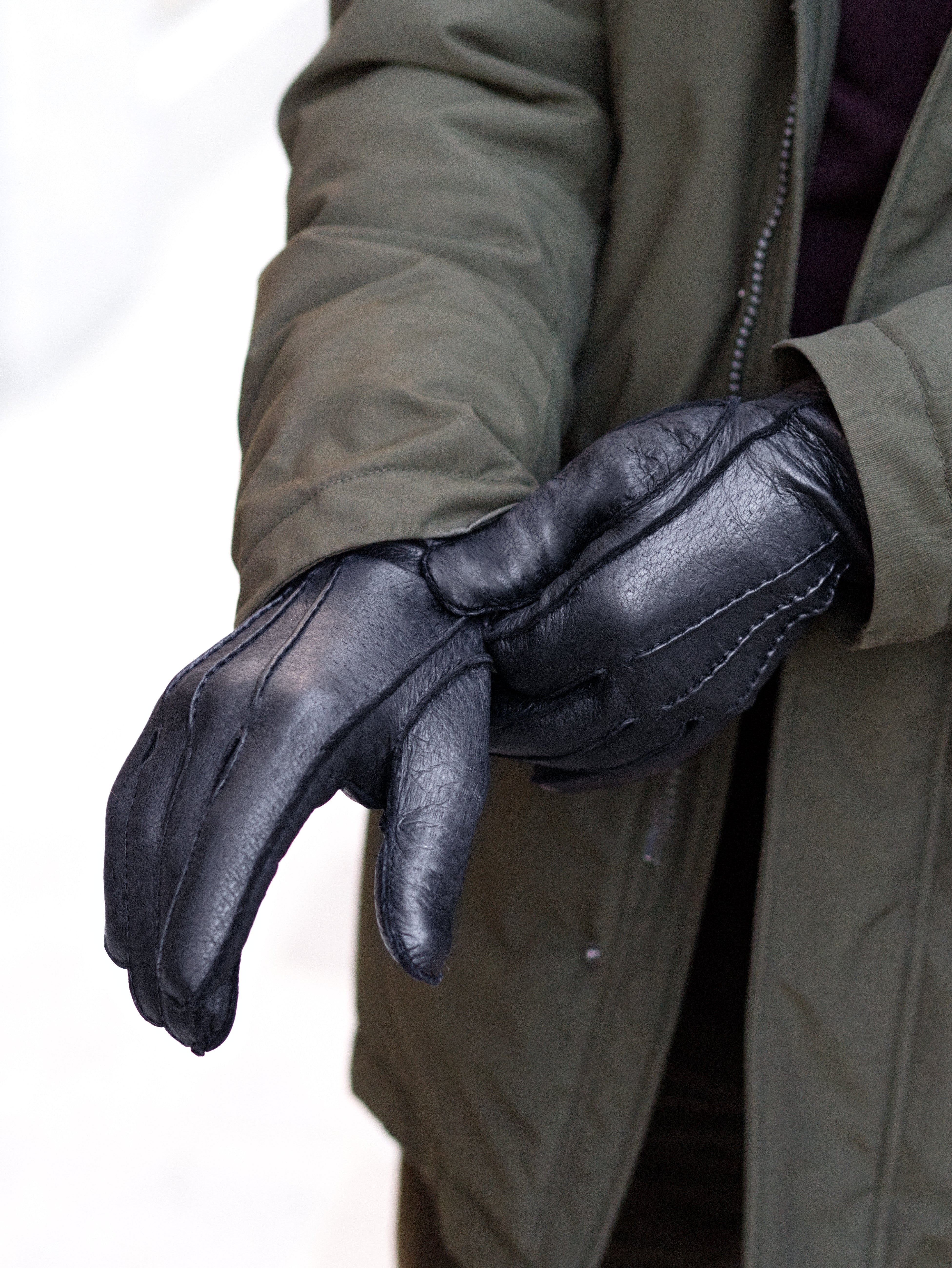 Peccarykäsineet. Miesten mustat peccaryhanskat pitävät kädet lämpiminä kylmälläkin talvisäällä. Käsityönä valmistettu klassikkokäsine on käsineiden ja nahkojen aatelia. Villisian nahassa on omintakeinen pintastruktuuri. Raflaava nahkan luontainen kuvio tekee käsineistä erityiset.