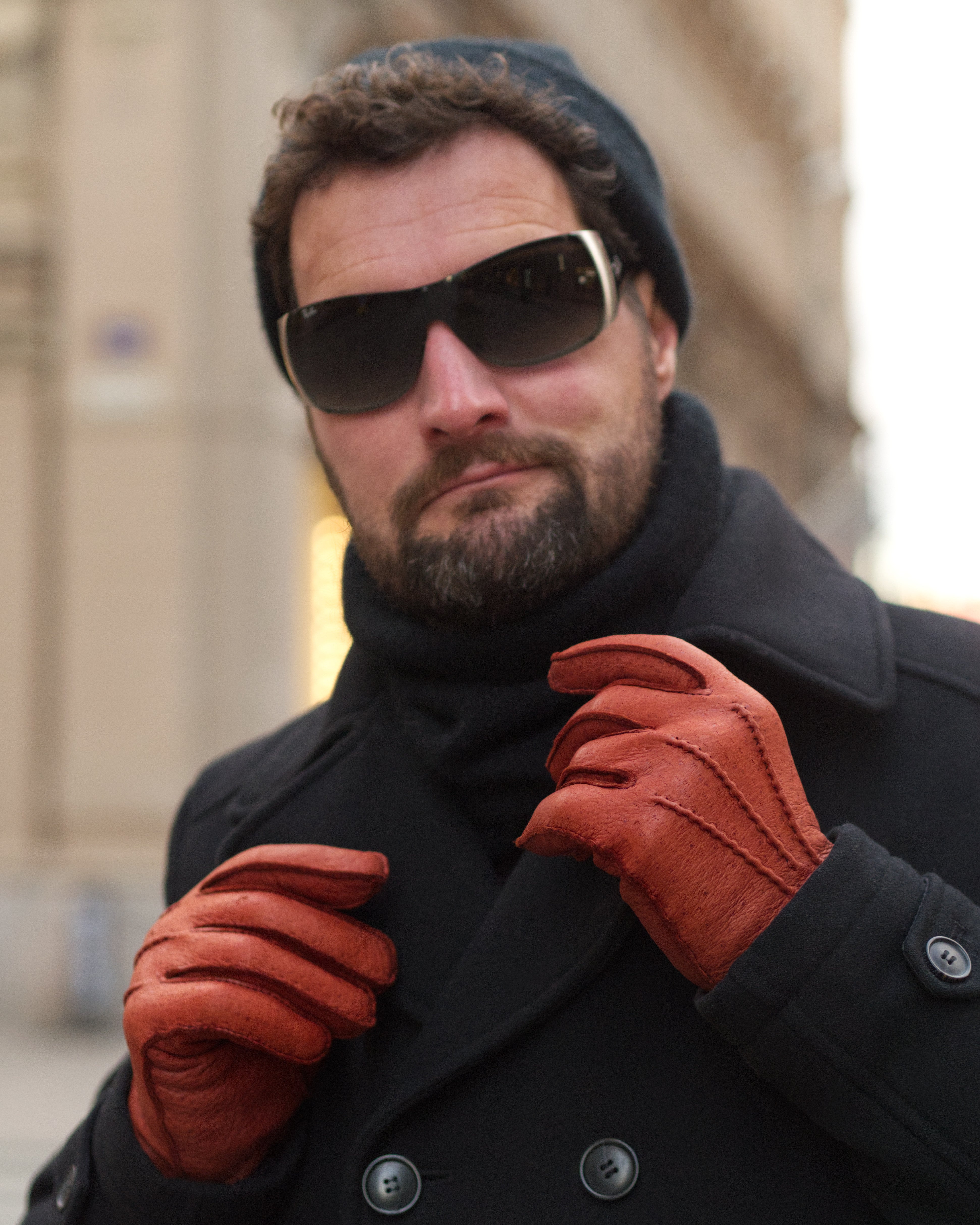 Peccarykäsineet. Miesten punertavanruskeat peccaryhanskat pitävät kädet lämpiminä kylmälläkin talvisäällä. Käsityönä valmistettu klassikkokäsine on käsineiden ja nahkojen aatelia.