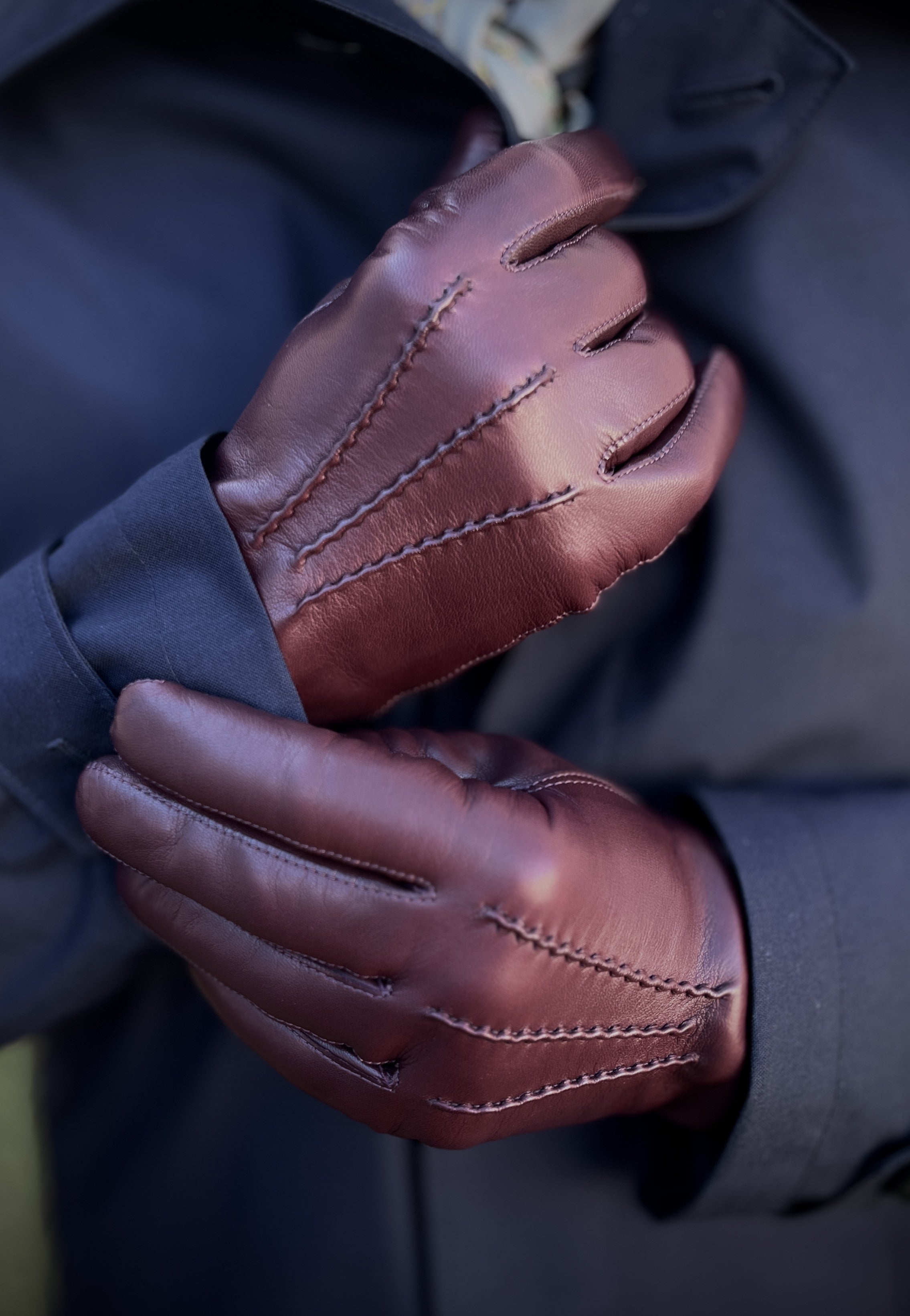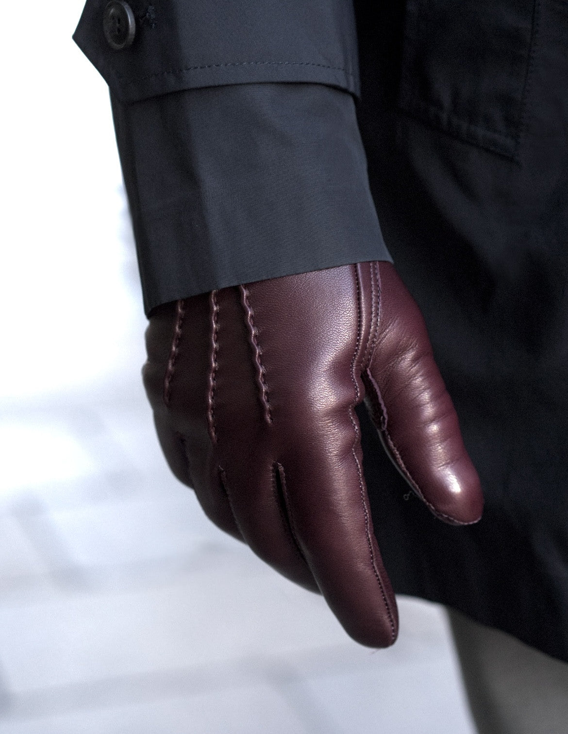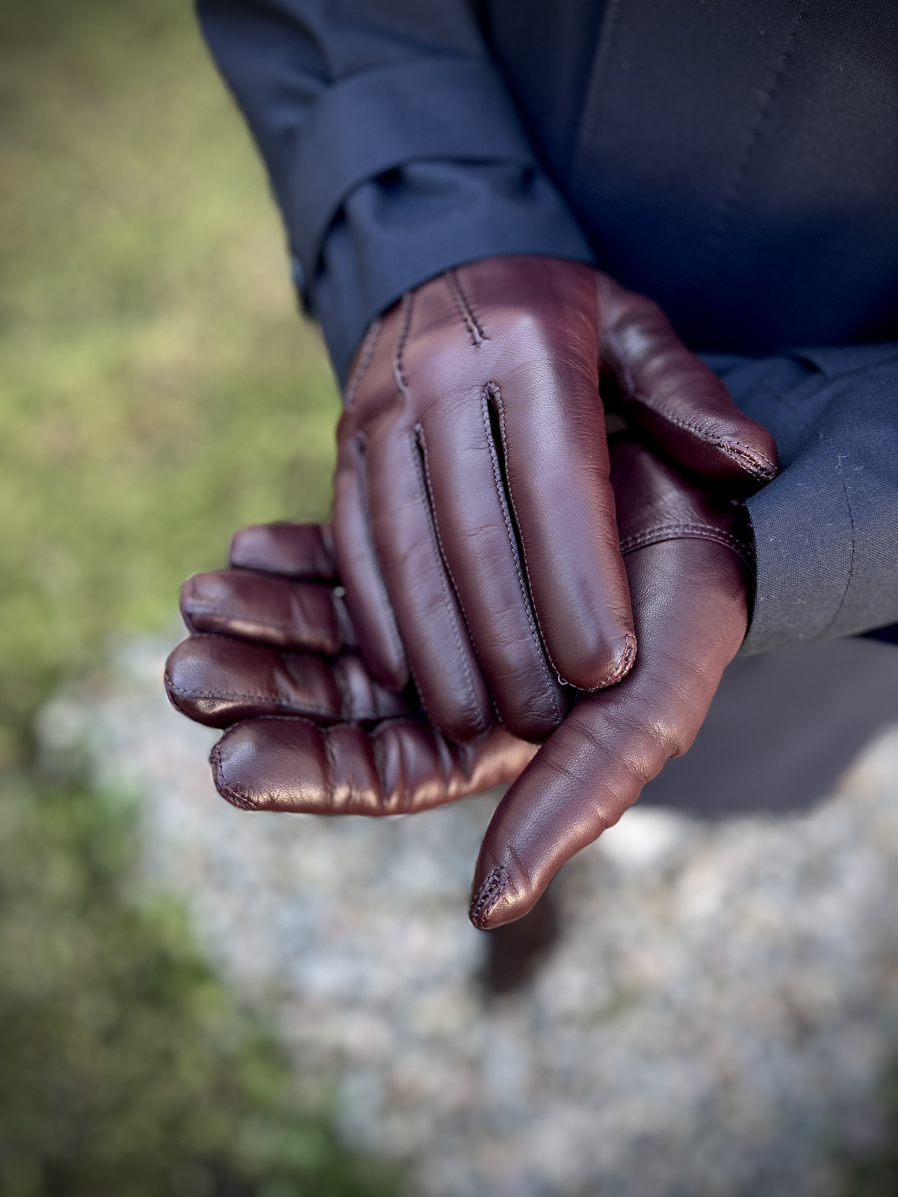 Klassikko malliset, tumman viinin väriset käsineet step saumalla ja kolmella käsin tikatulla koriste ompeleella. Reilu varsi ja rannekuminauha.