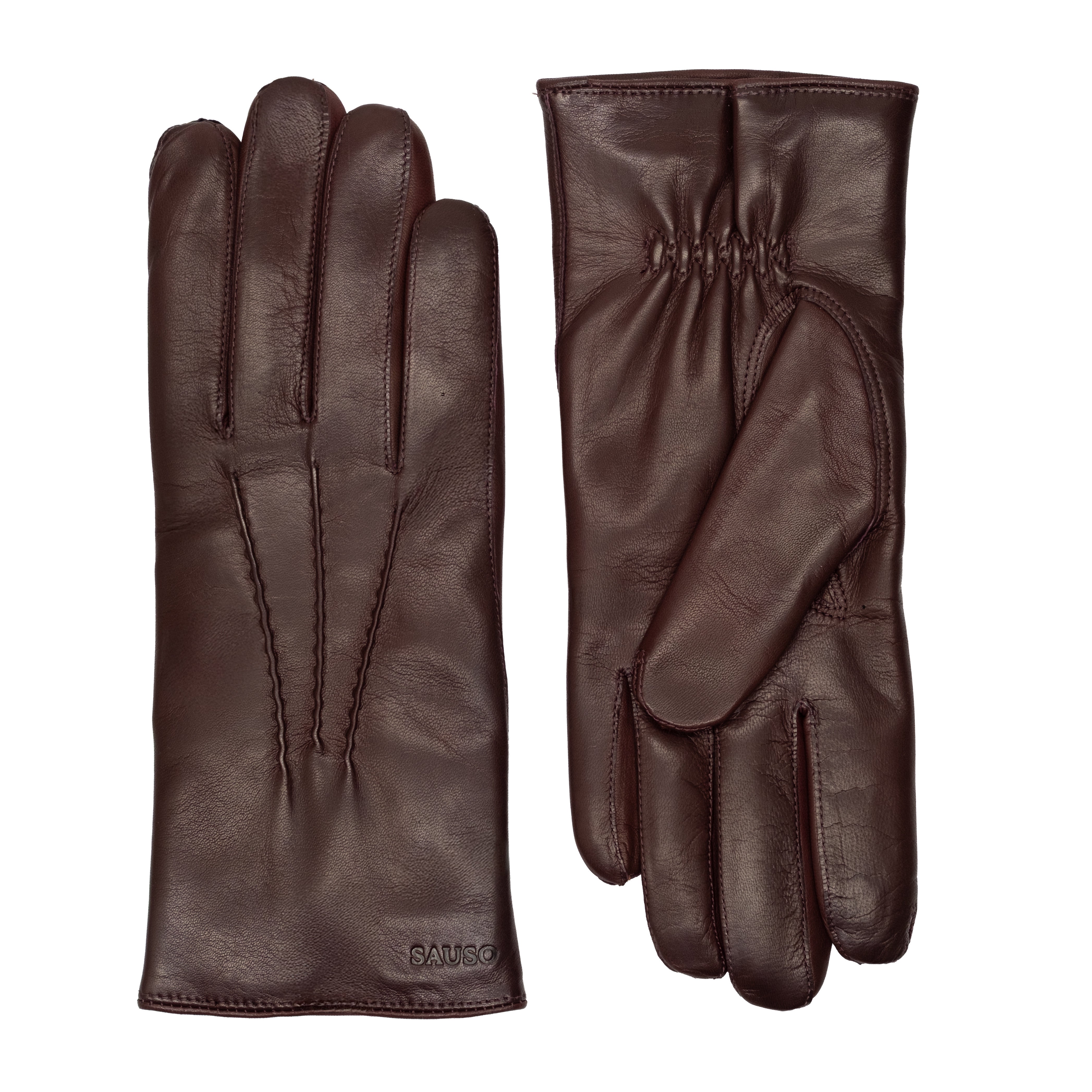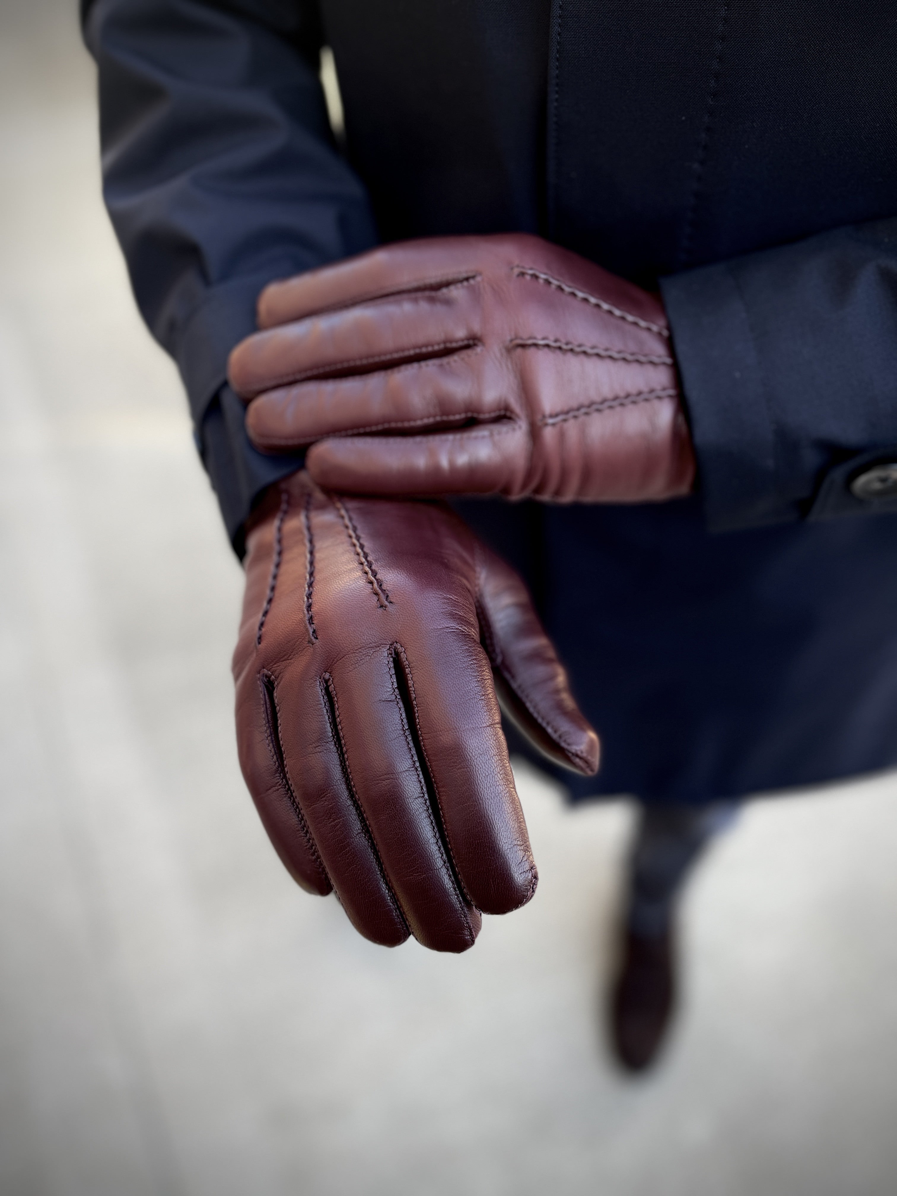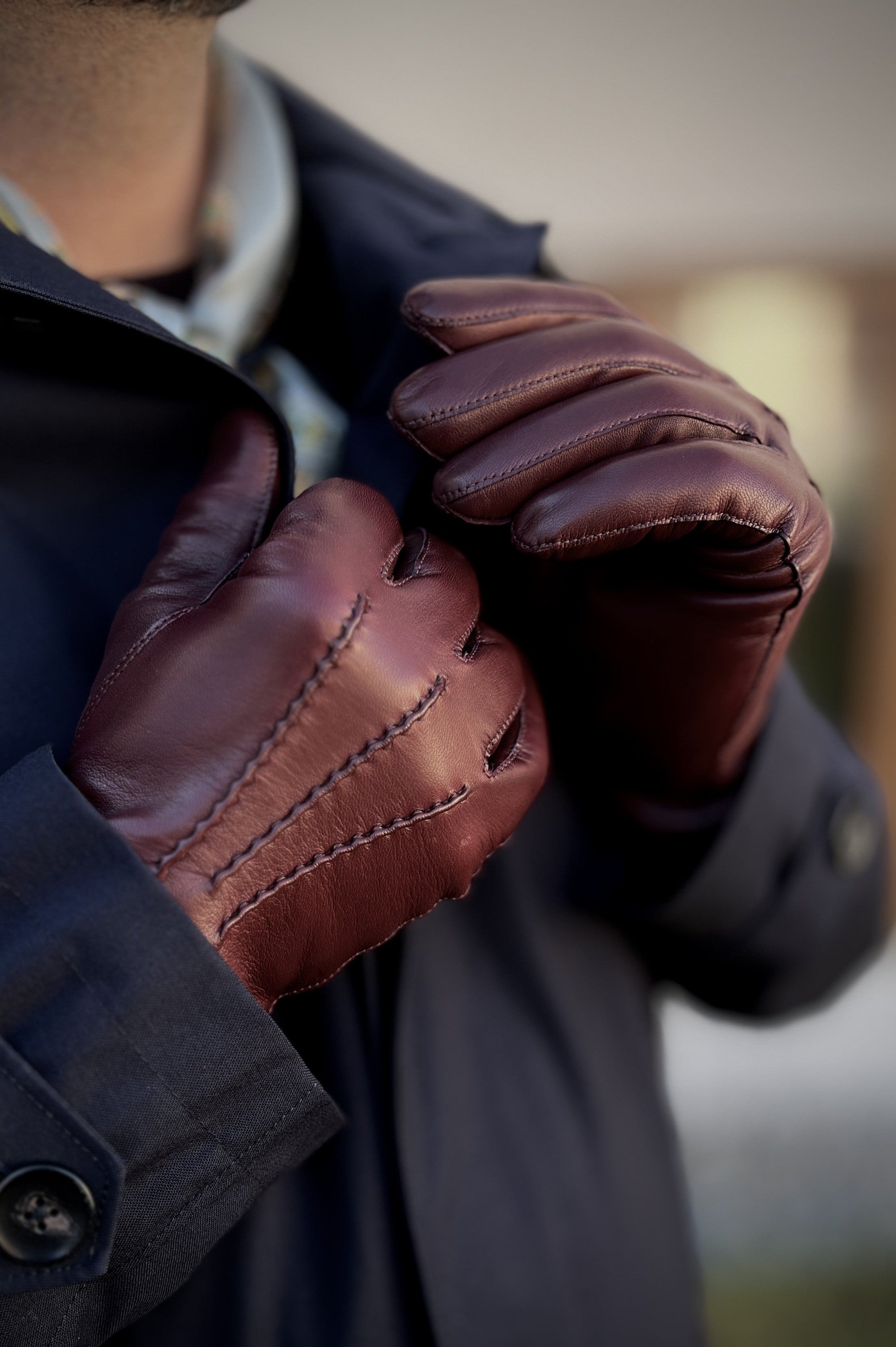 Klassikko malliset, tumman viinin väriset käsineet step saumalla ja kolmella käsin tikatulla koriste ompeleella. Reilu varsi ja rannekuminauha.