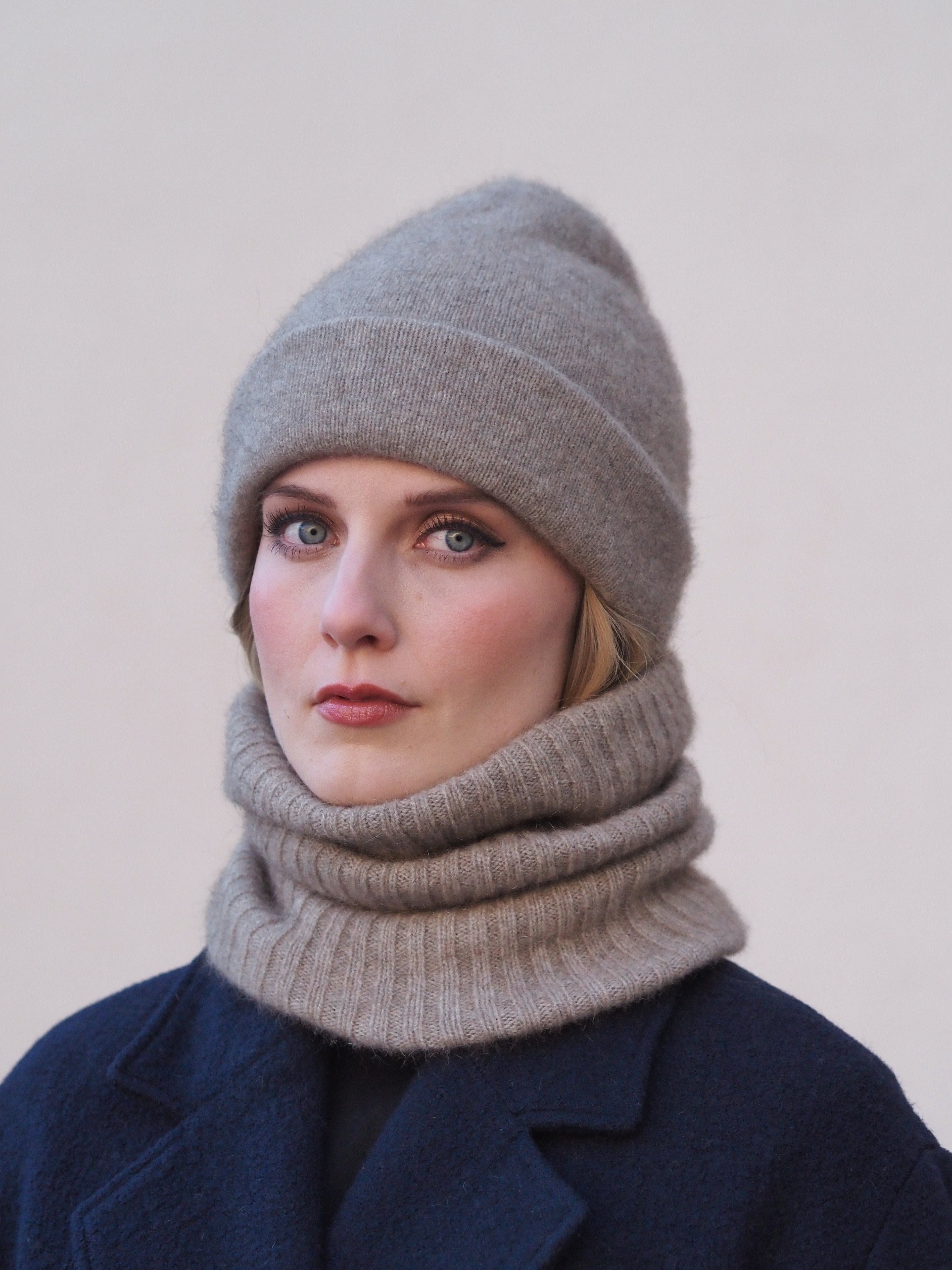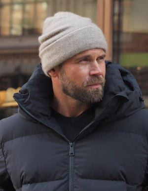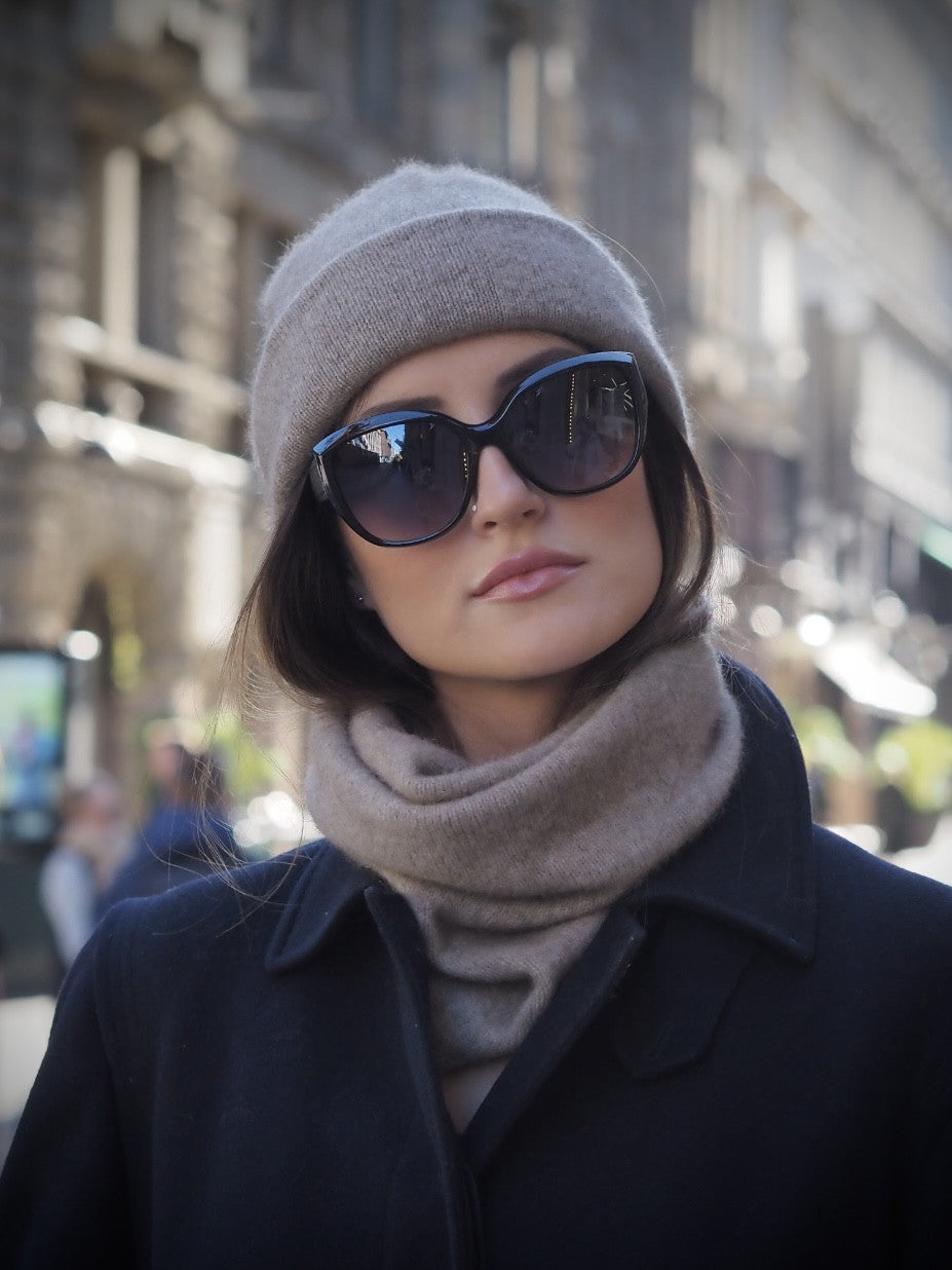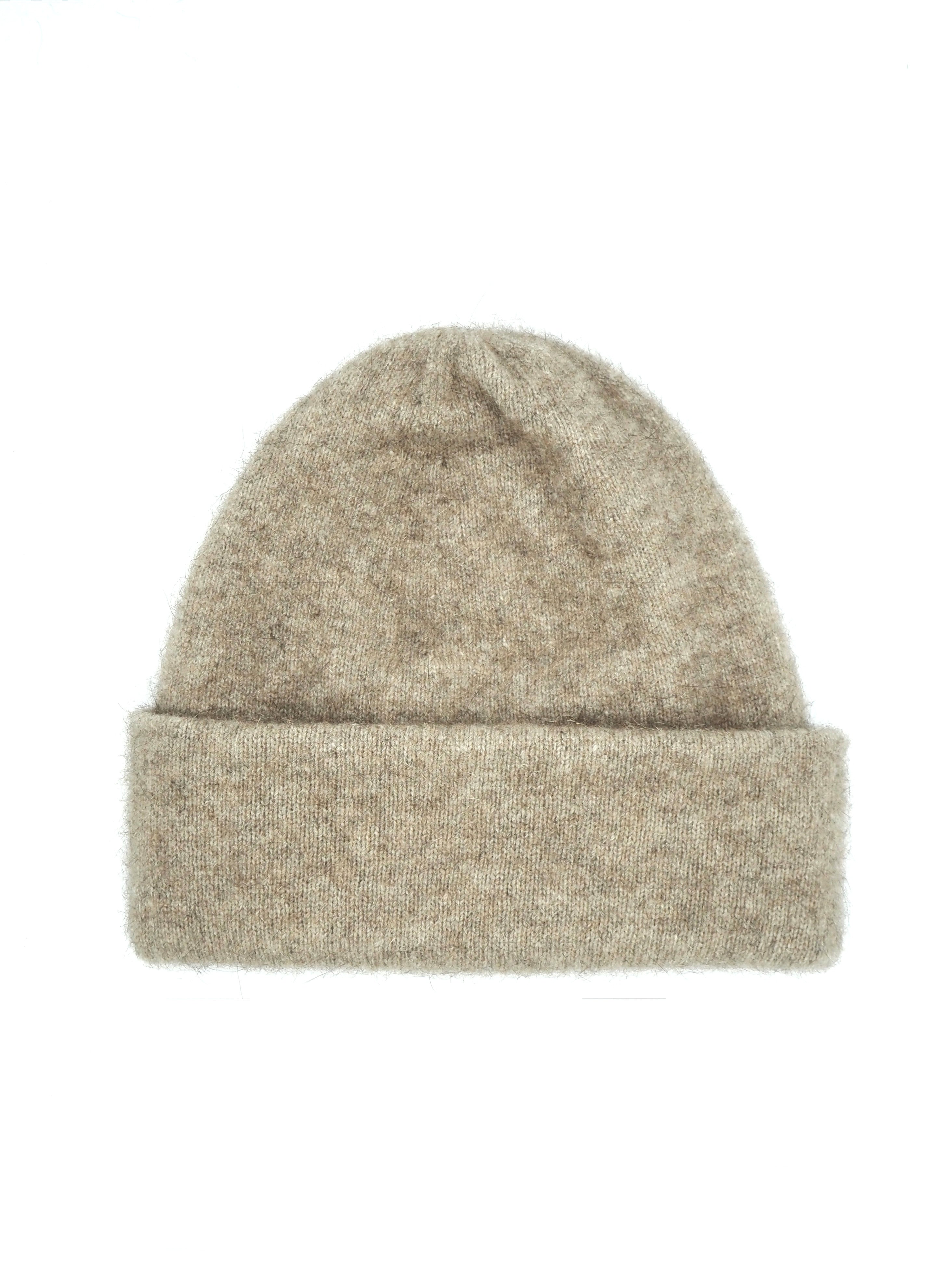 Beige smooth-knit beanie made from merino-fox possum fur knitwear. The stretchy beanie suits the whole family.