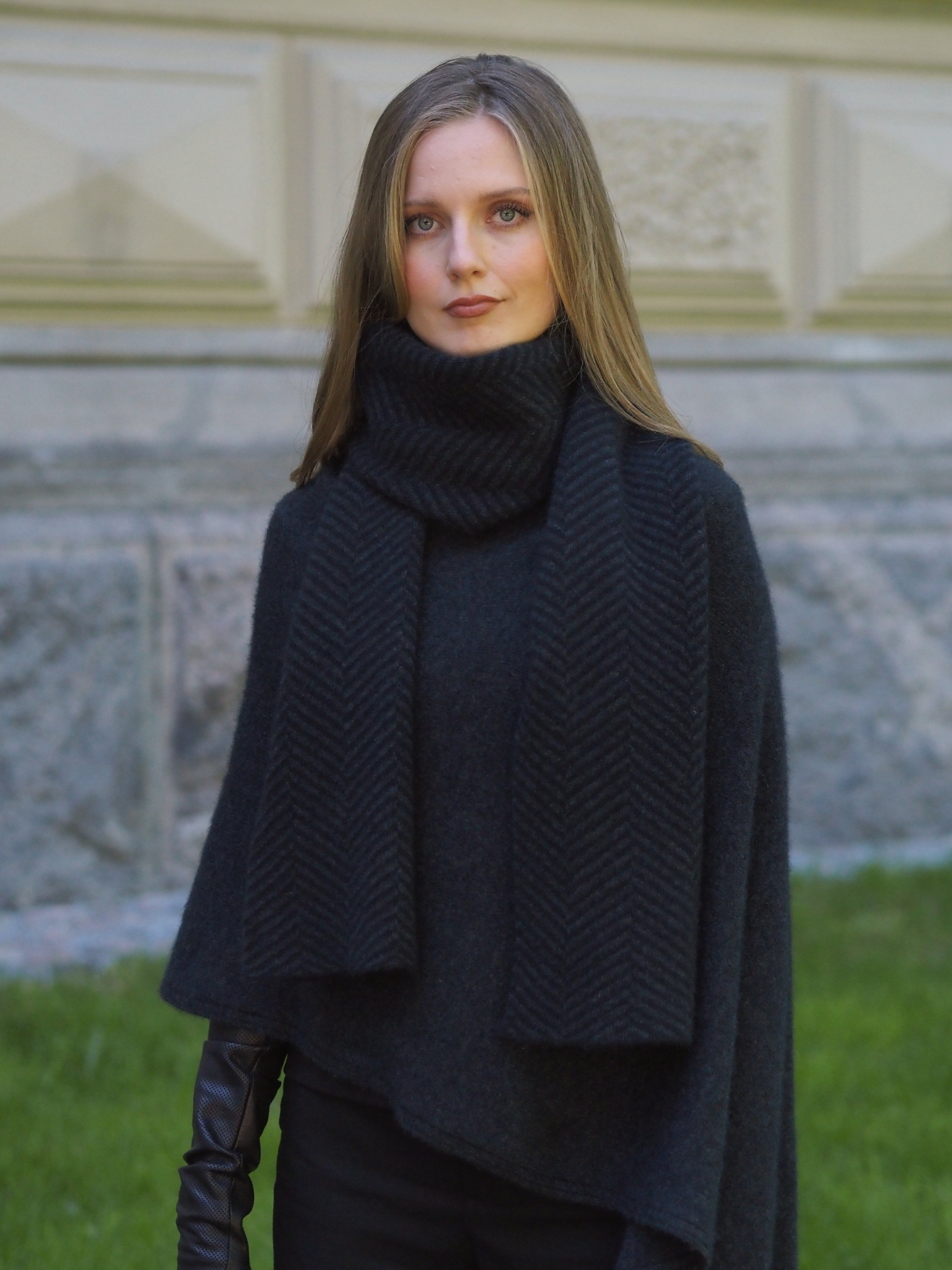 A dark gray smooth-knit scarf poncho made from merino fox fur knit. An easy and versatile knit suitable for the whole family.