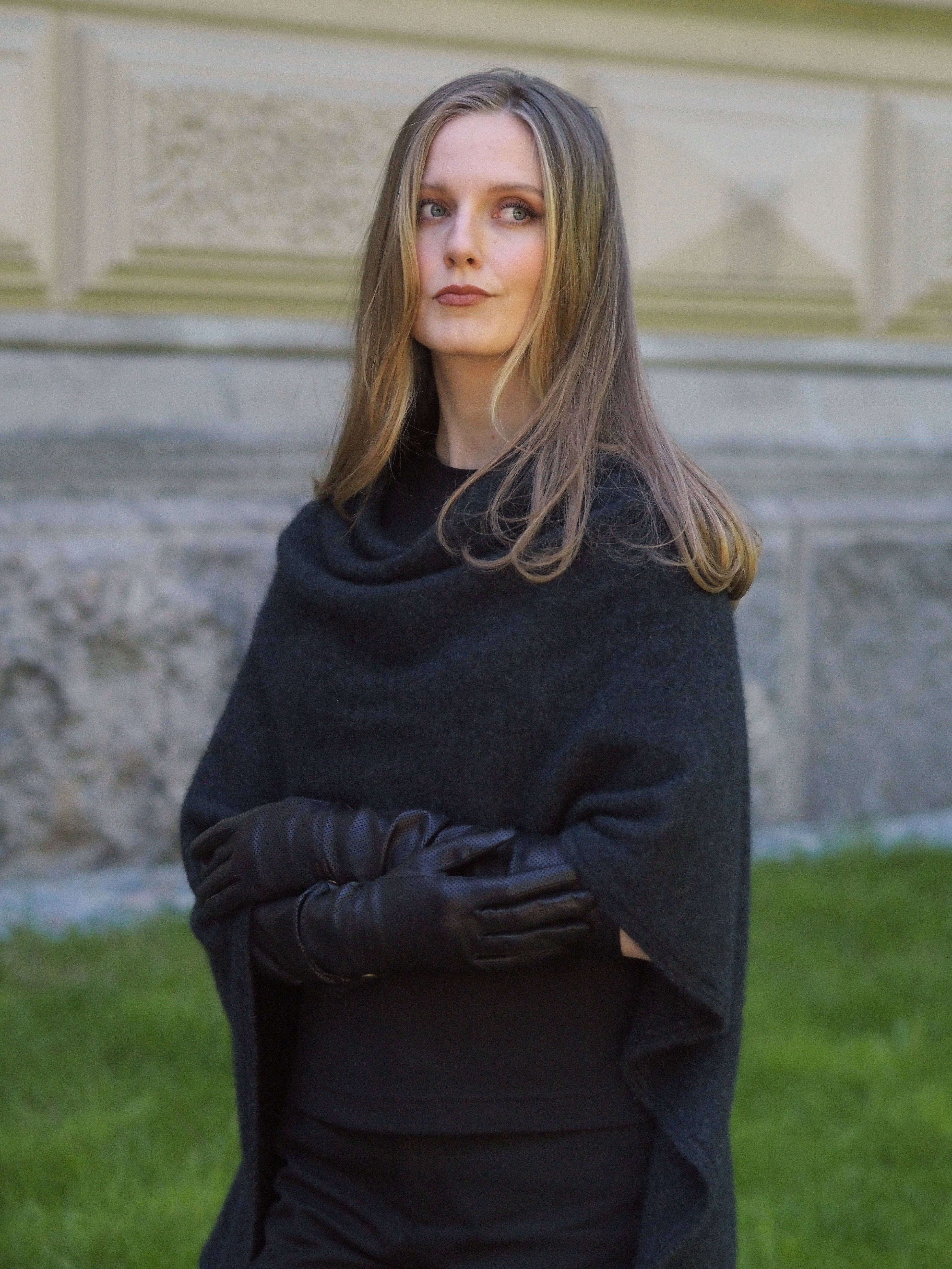 Epäsymmetrisesti neulottu huiviponcho toimii vaatteena, ponchona, huivina ja huppuna.