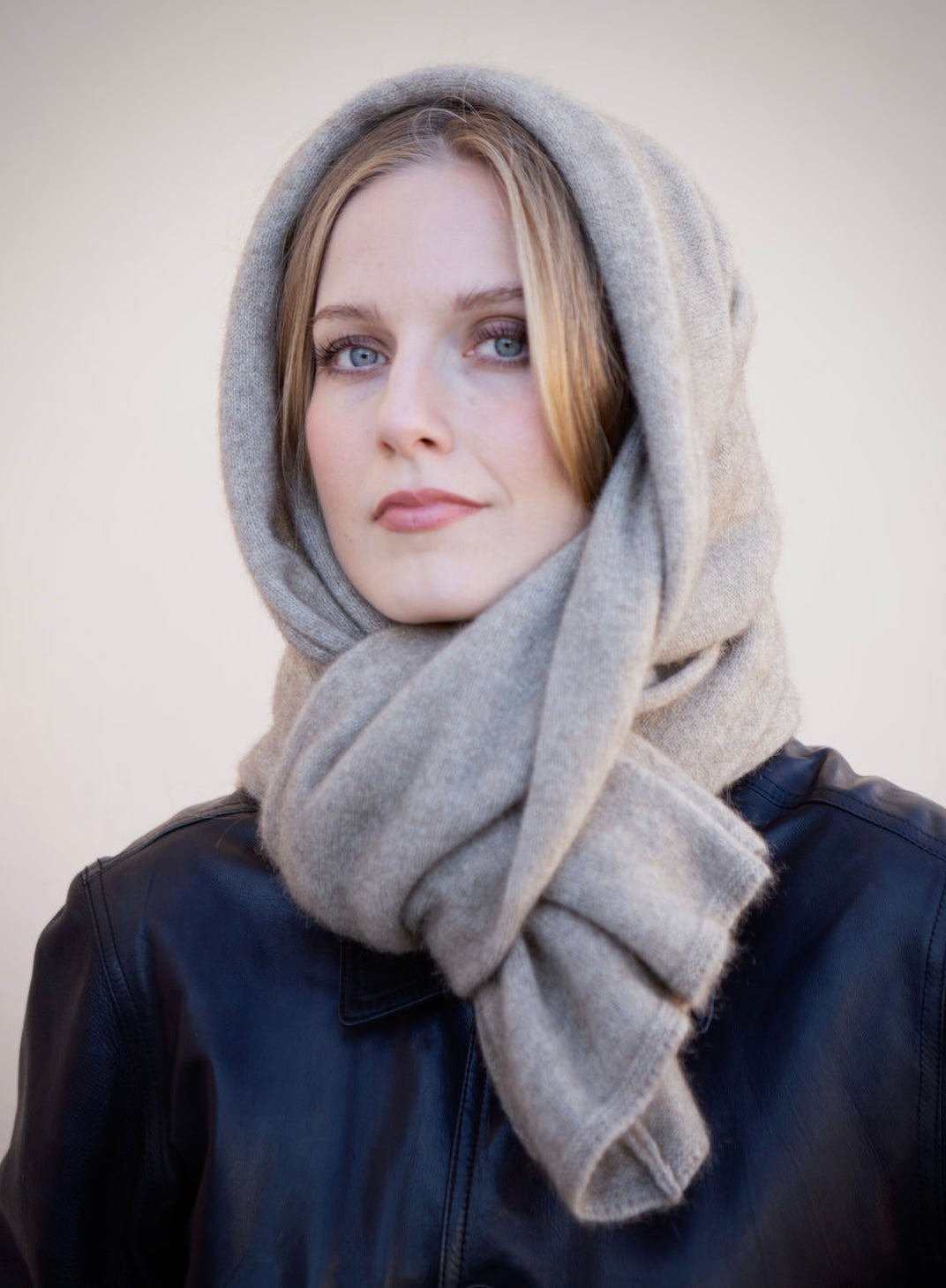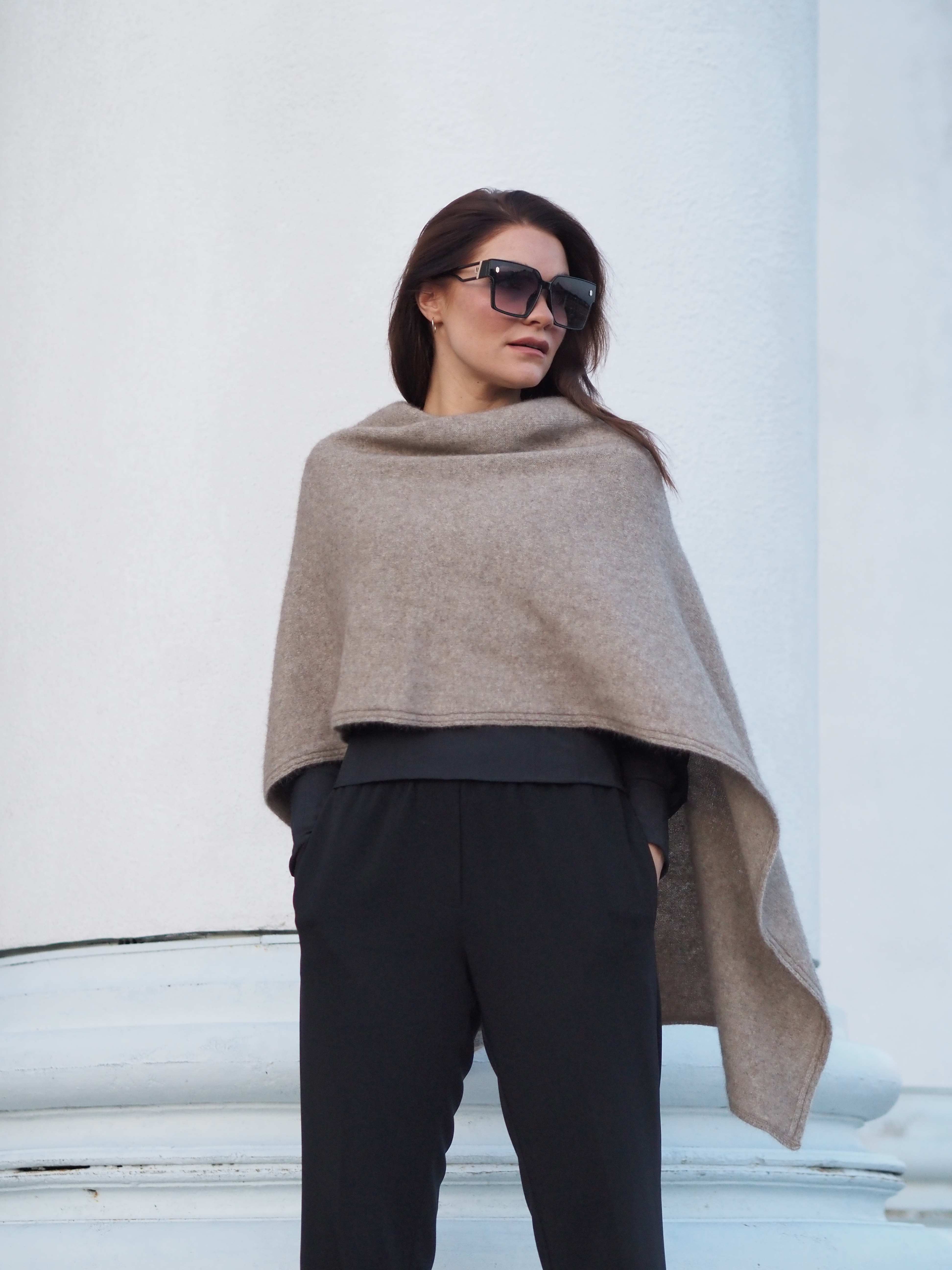 A beige smooth-knit scarf poncho made from merino fox fur knit. An easy and versatile knit suitable for the whole family.