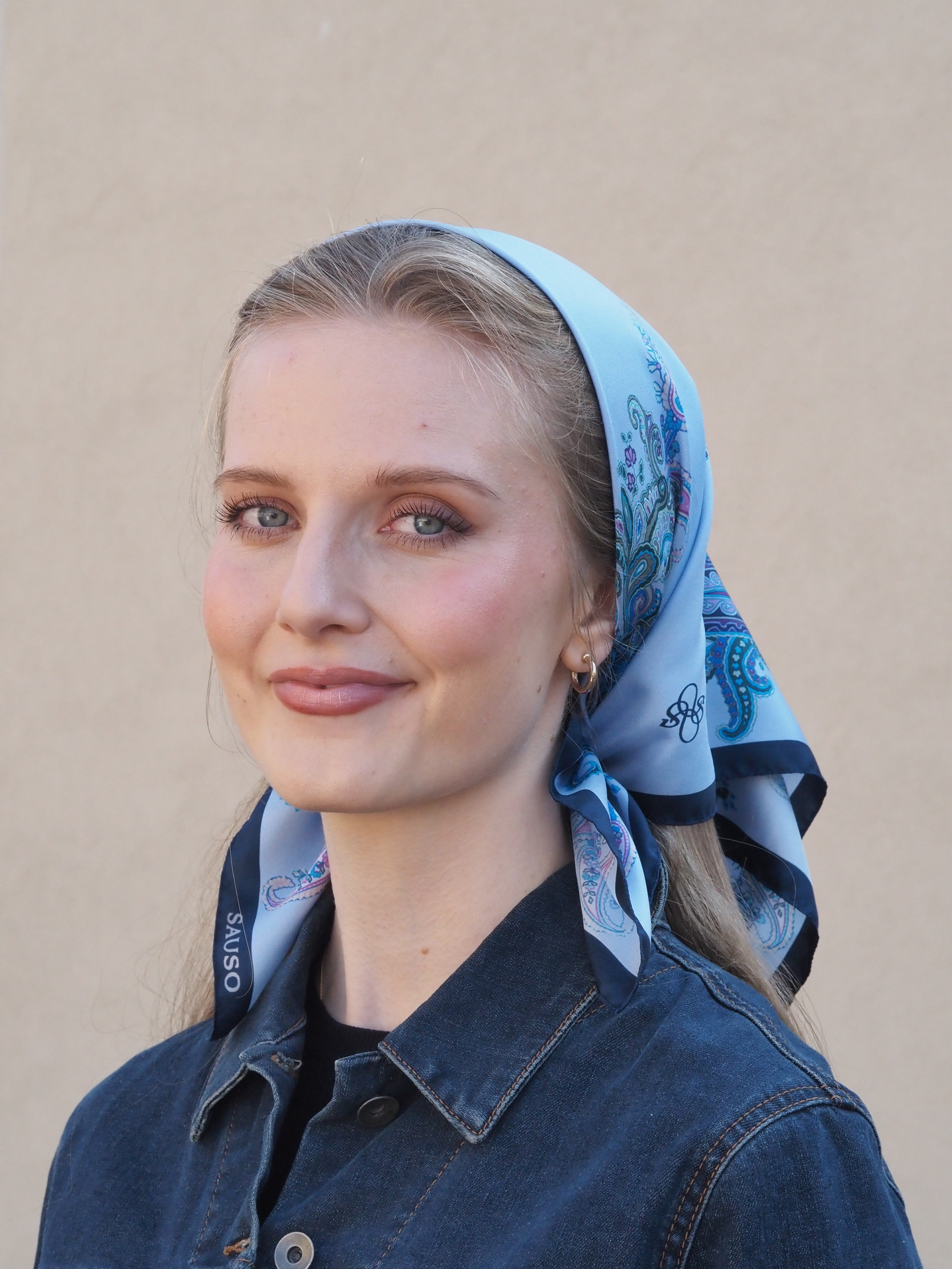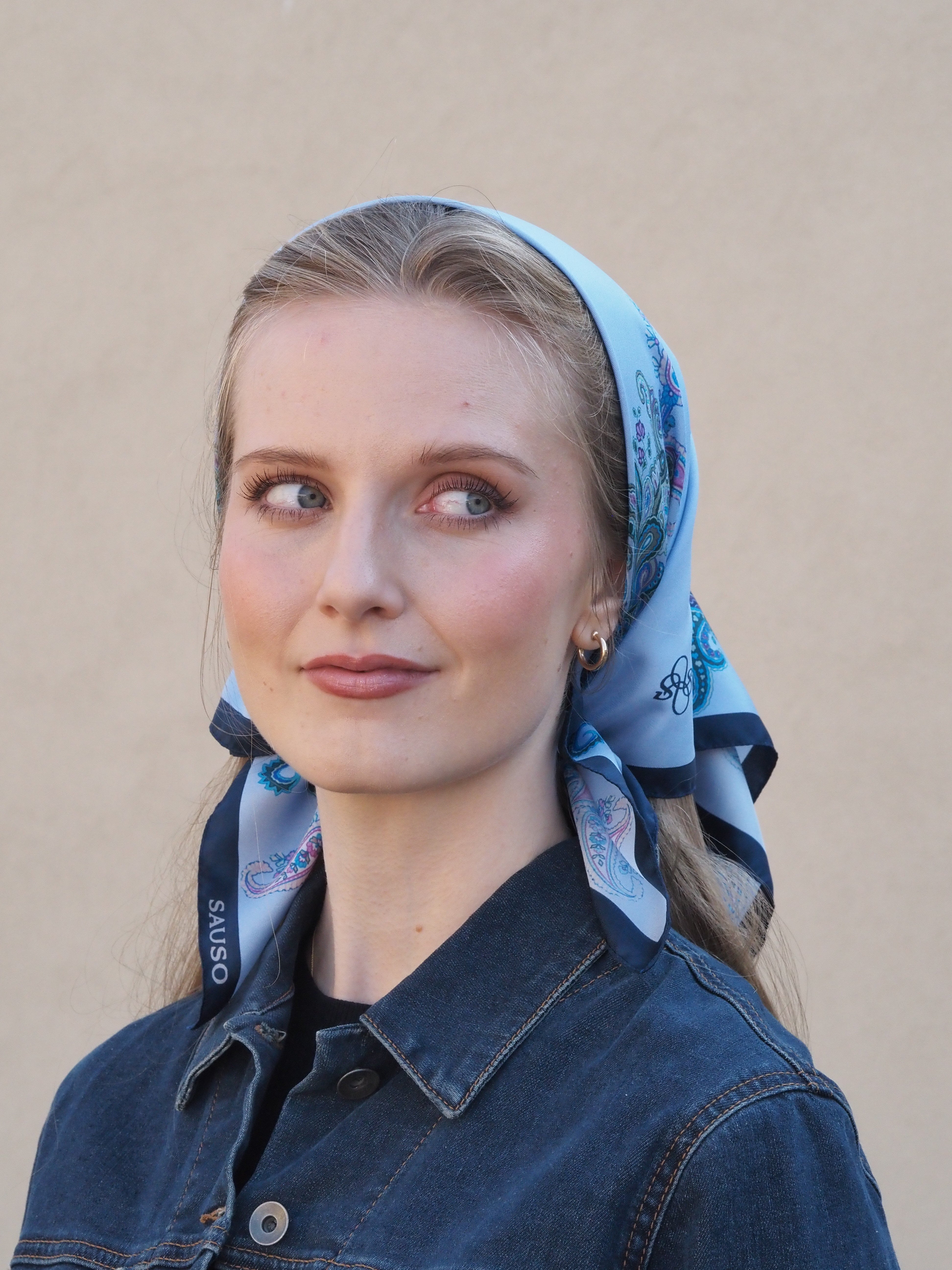 Heleän vaalean sininen huivi, jossa on tumman sininen boordi. Kuosissa on royalin sinistä, oliivin ja agaven vihreää, tummaa ja vaaleaa lilaa sekä ripaus turkoosia ja malvaa. 70x70 cm koko taipuu päähän, ranteeseen, hiuspannaksi ja kaulalle eri tavoin solmittuna. 12 momin paksuinen, italialainen silkkikangas toistaa värejä upeasti, poimuttuu kauniisti, hengittää, lämmittää, mutta tuntuu aina raikkaalle.