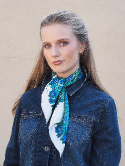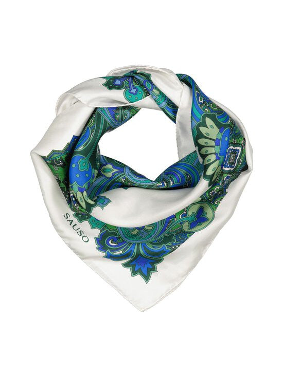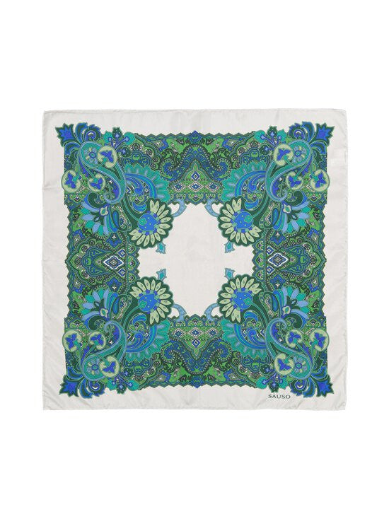 Danna silkkihuivin koko on 70x70cm. Koko on mainio sekä kaulalla, päässä että solmukkeen sijaan miehellä, jopa taskuliinana tai vyönä. Kuvion väreissä hohtavat raikkaat sinisen ja vihreän eri sävyt.