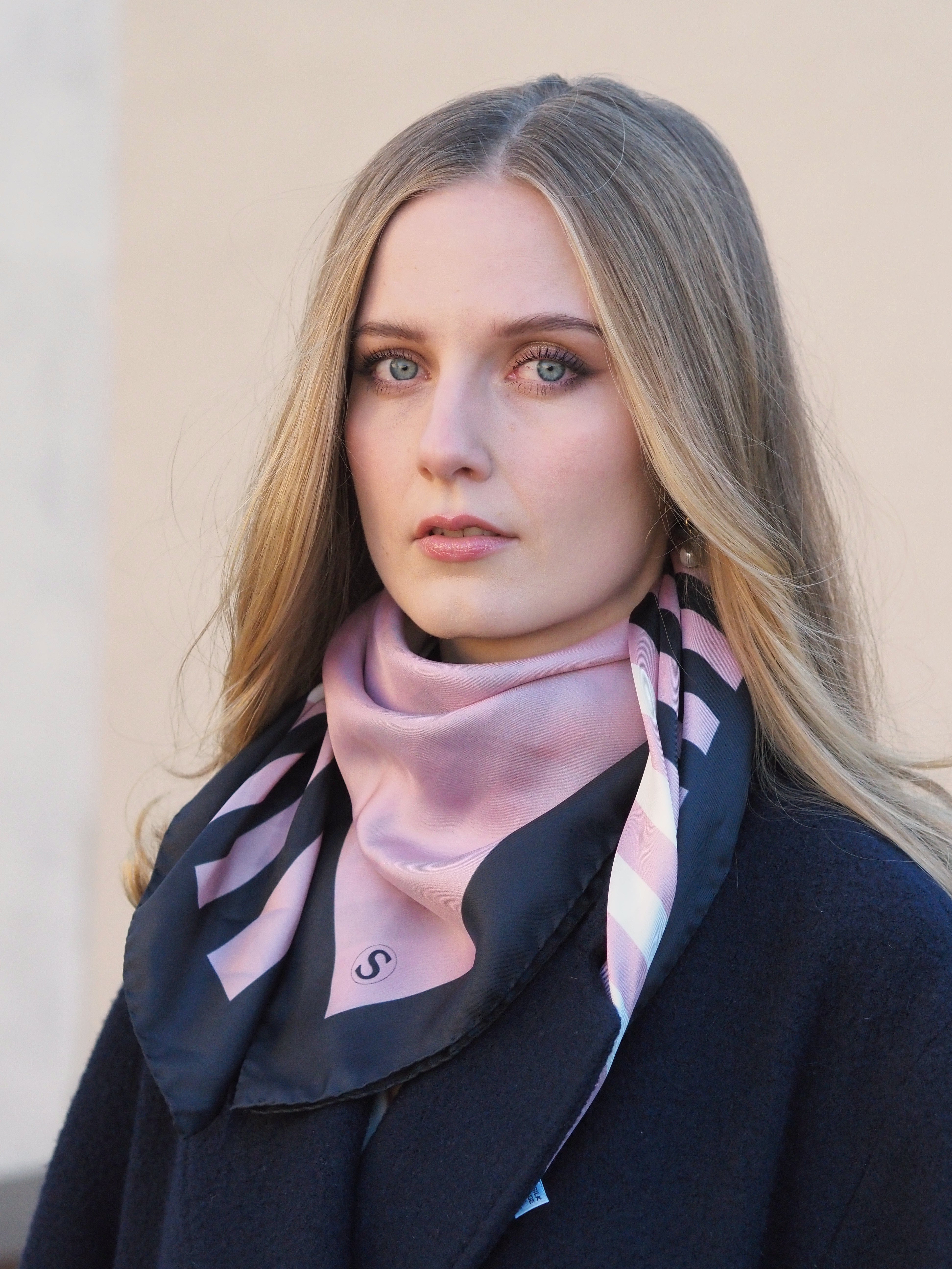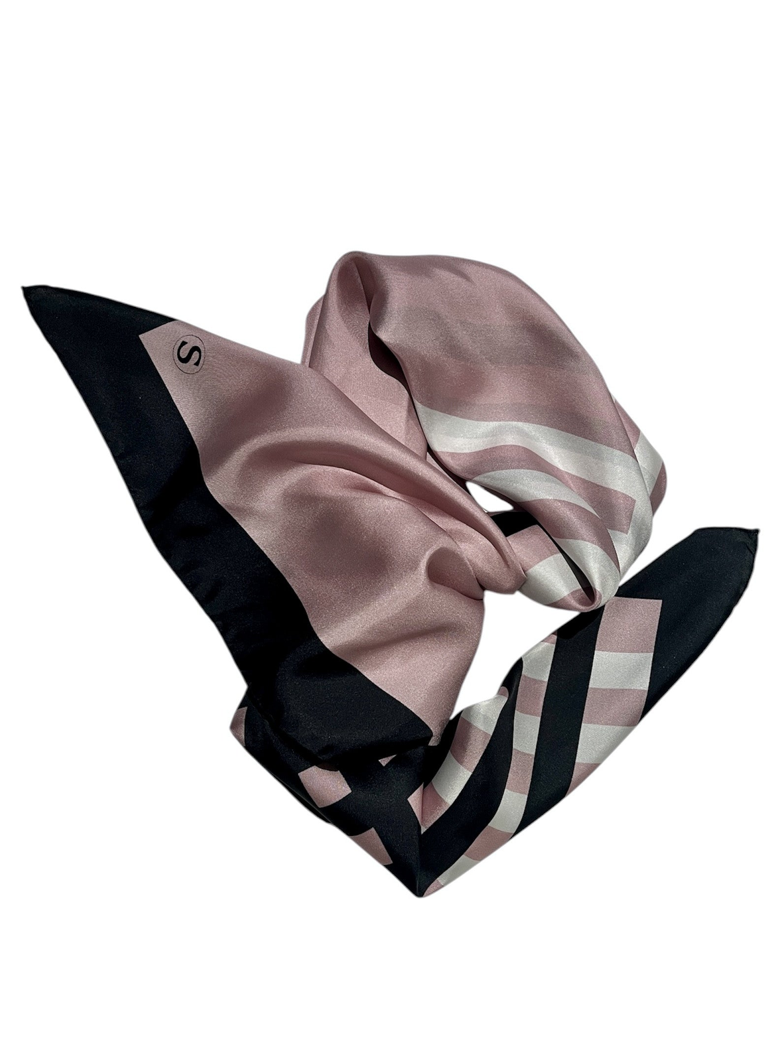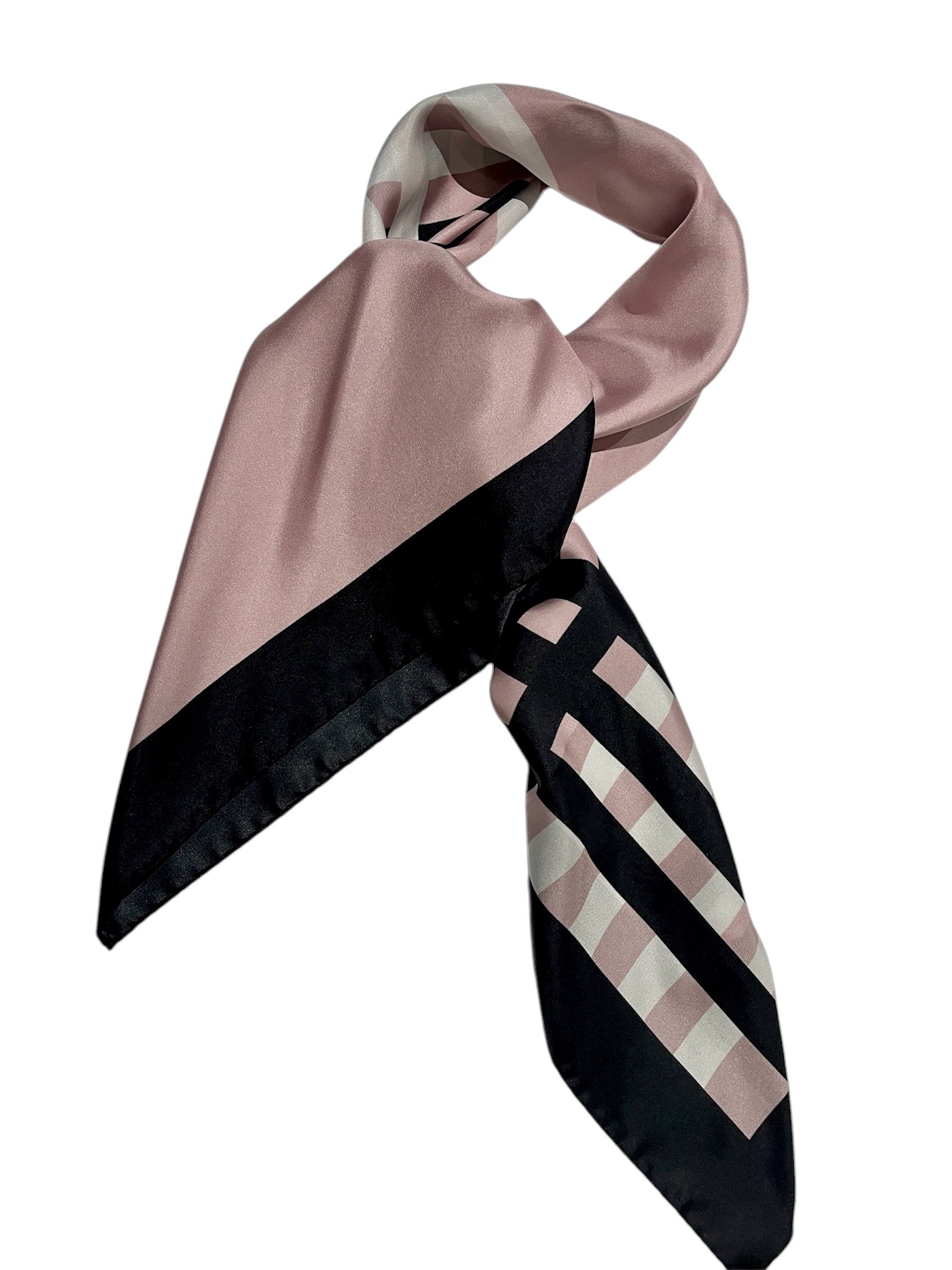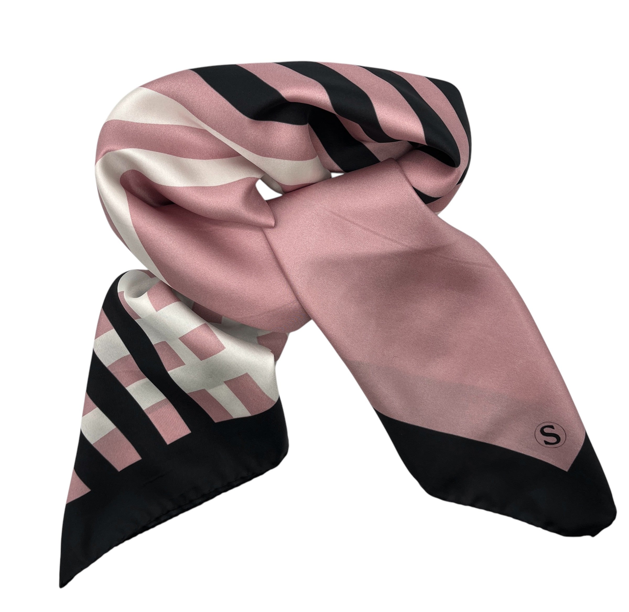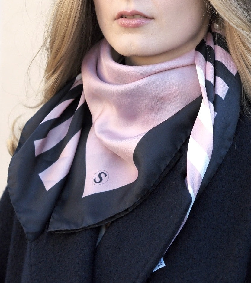 Klassinen silkkihuivi on yksi monikäyttöisimmistä asusteista, joka toimii vuodenajasta toiseen. Luonnonmateriaalina silkki on vertaansa vailla sen kestävyyden ja hengittävyyden ansiosta. Silkkihuivi on ylellinen, mutta samaan aikaan käytännöllinen asuste. Silkki tuntuu iholla raikkaalle ja lämpimälle samaan aikaan. Hieman kylmän vaalean roosa pohjaväri on aina edullinen kasvojen ihoa vasten. Musta boordi ja mustat ja valkeat raidat antavat tehokkaan ja tyylikkään lookin. Tämä huivi on suunniteltu klassikoksi.