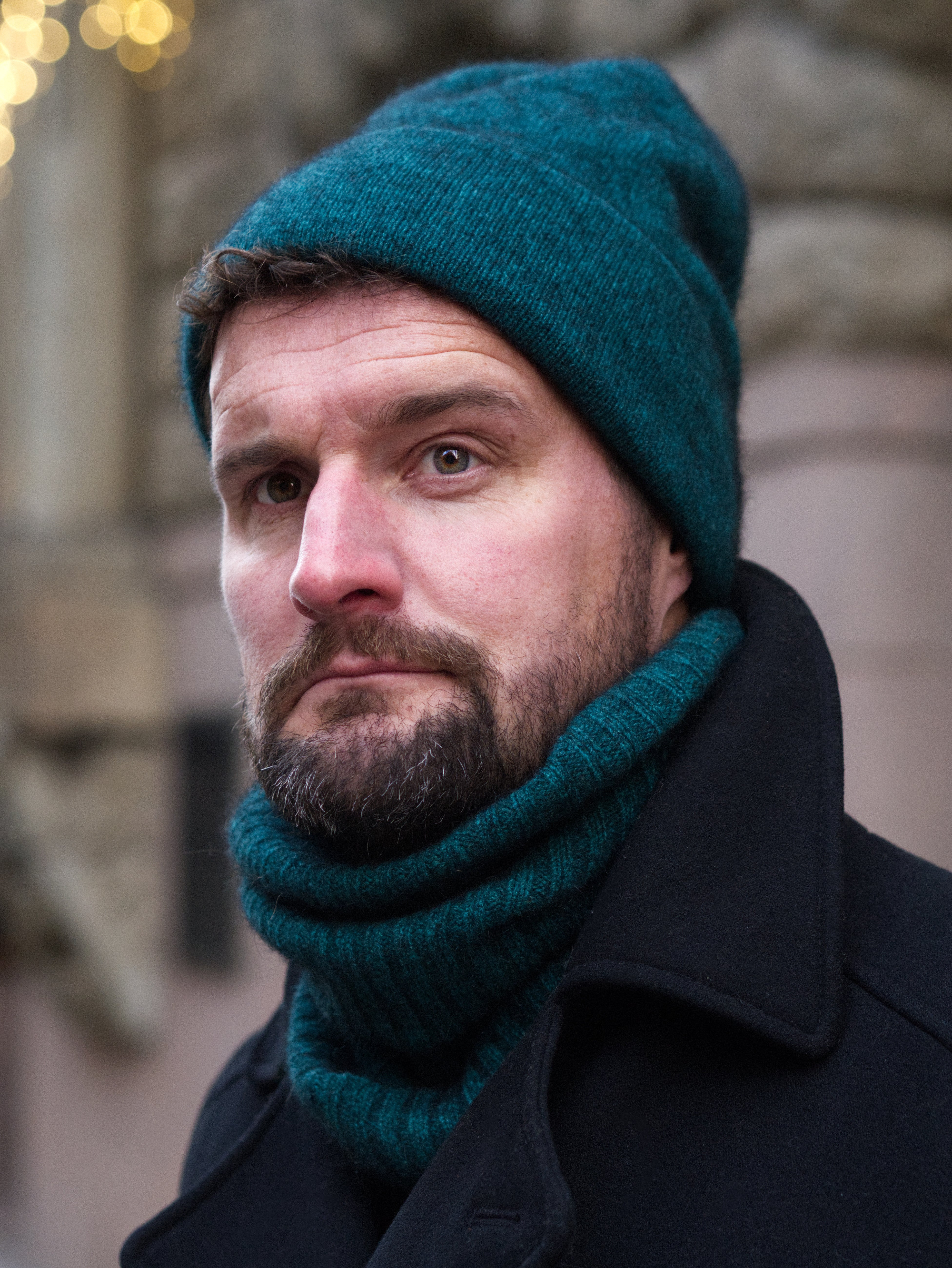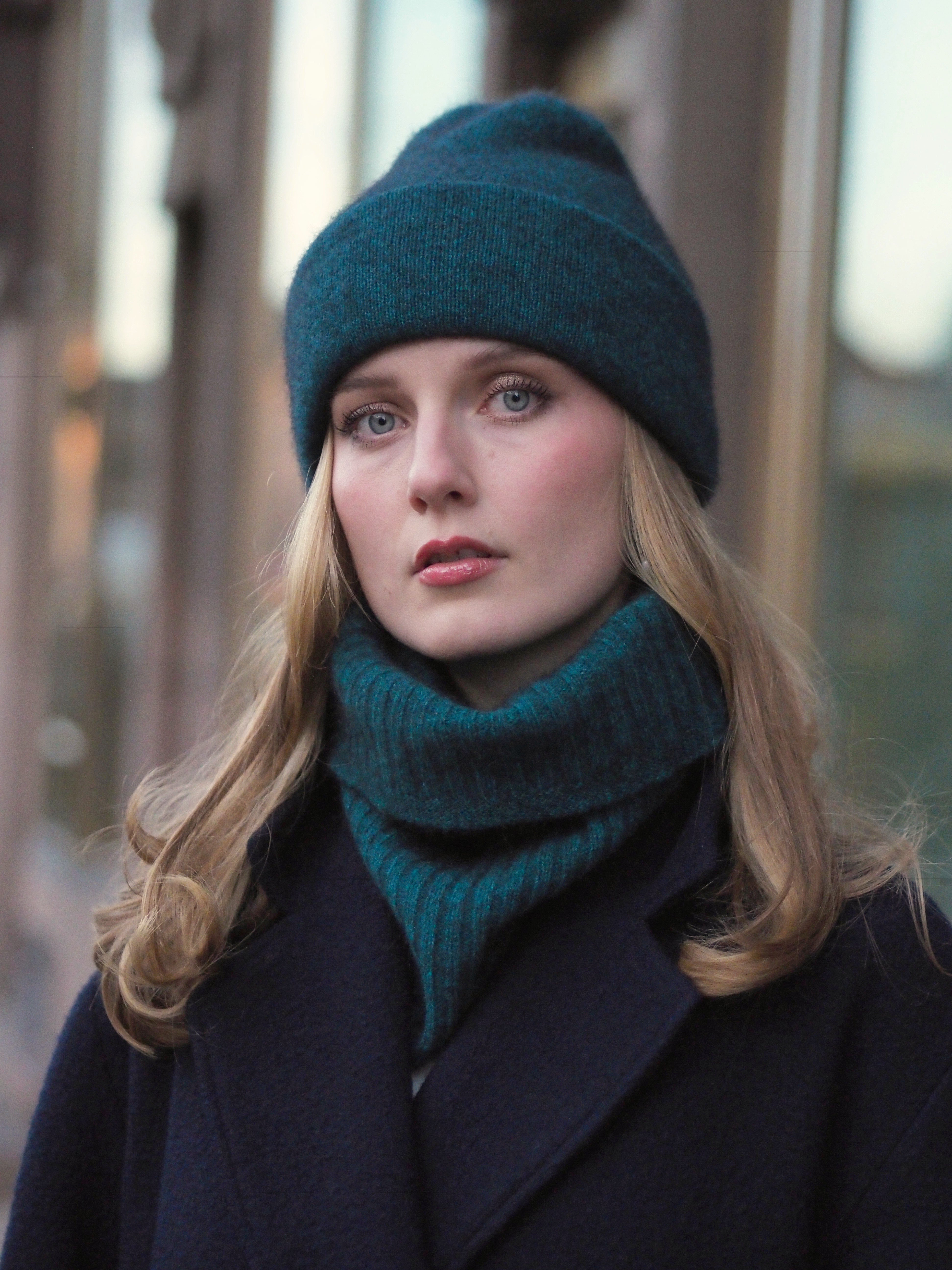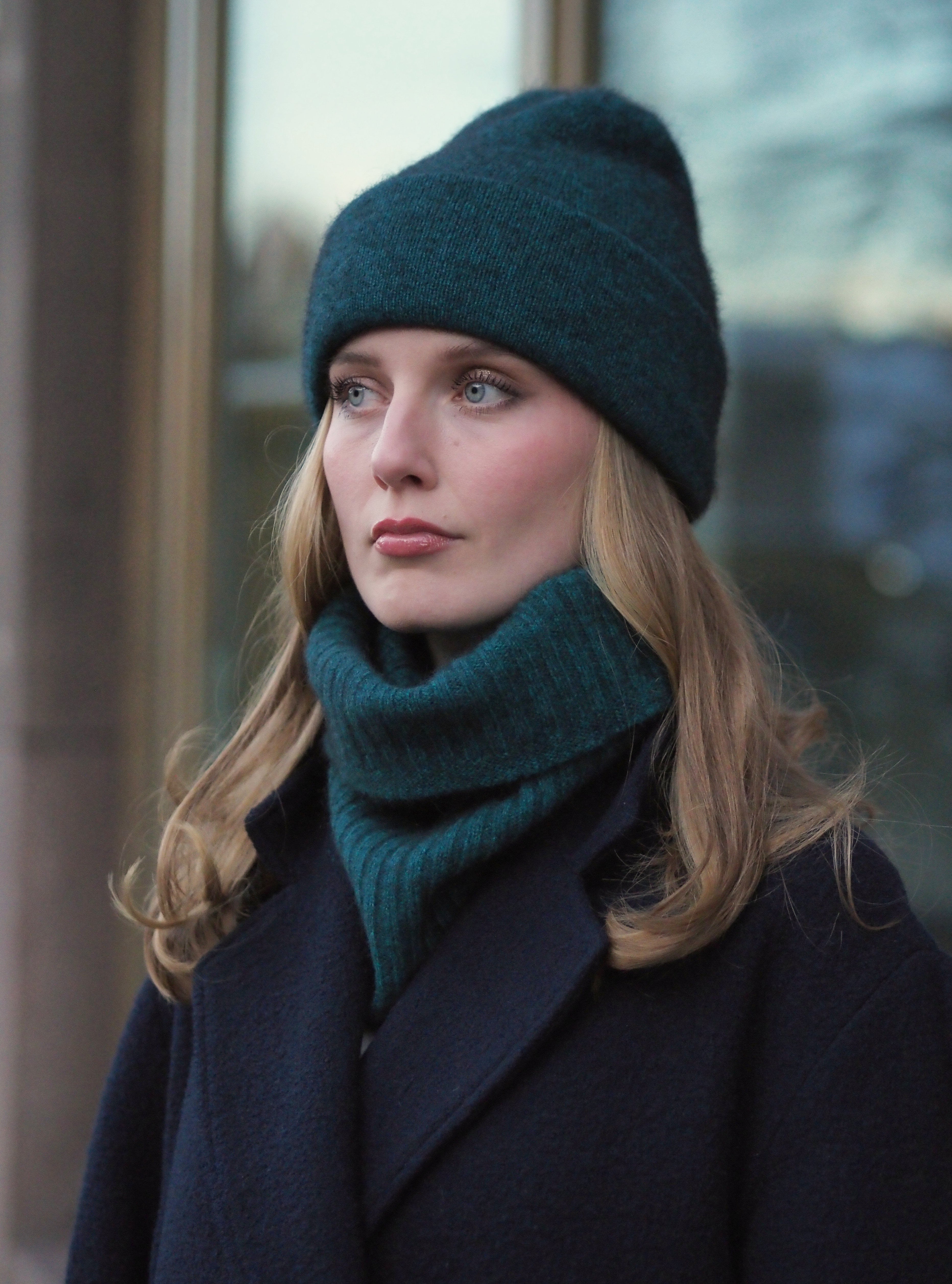 Kestävästä ja lämpimästä merino-kettukusunkarvaneuleesta neulottu petroolinvihreä tuubihuivi.
