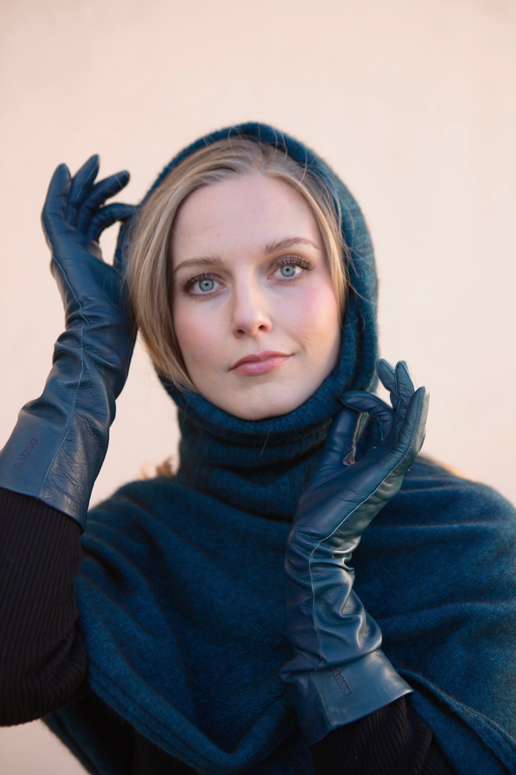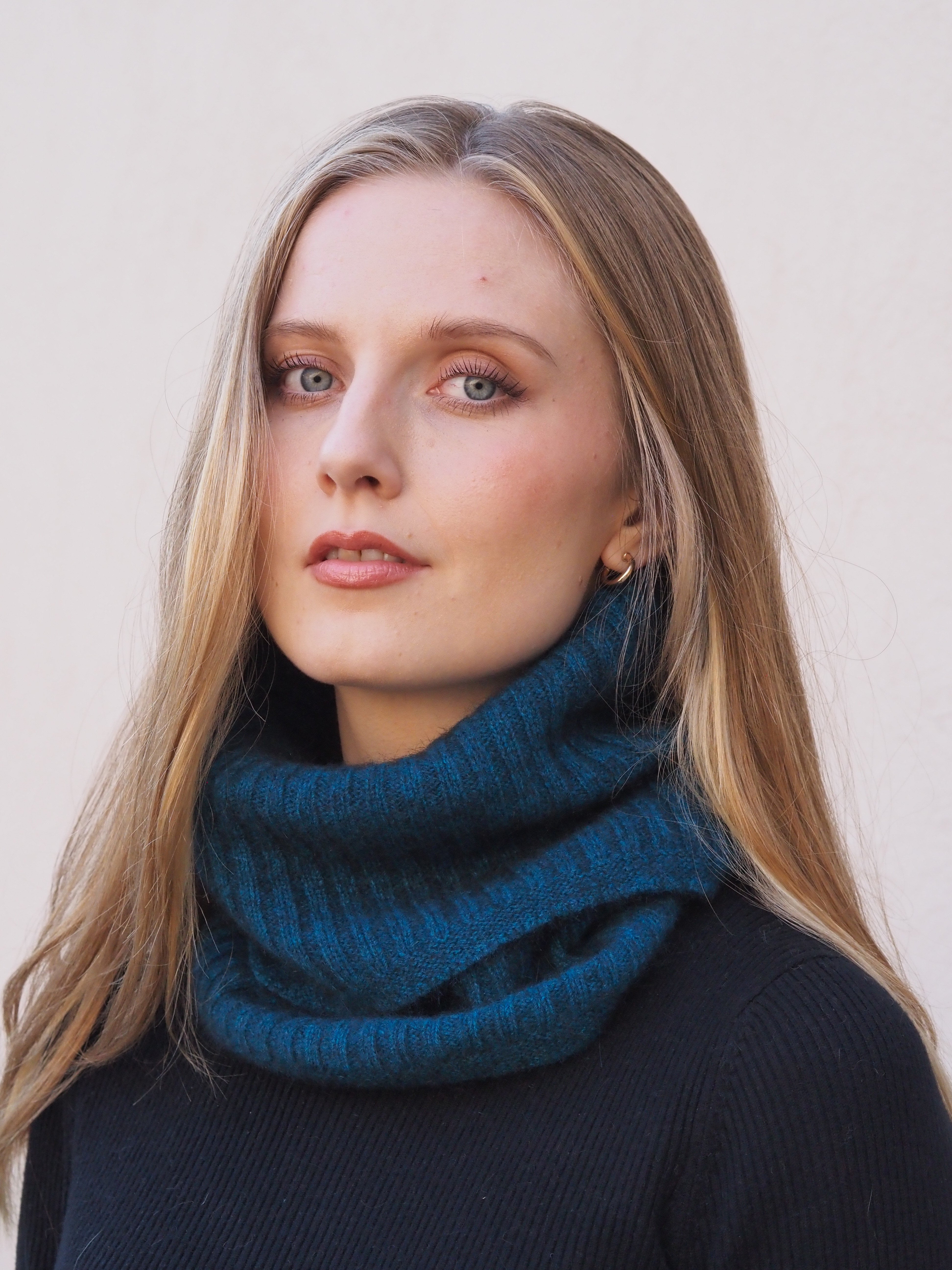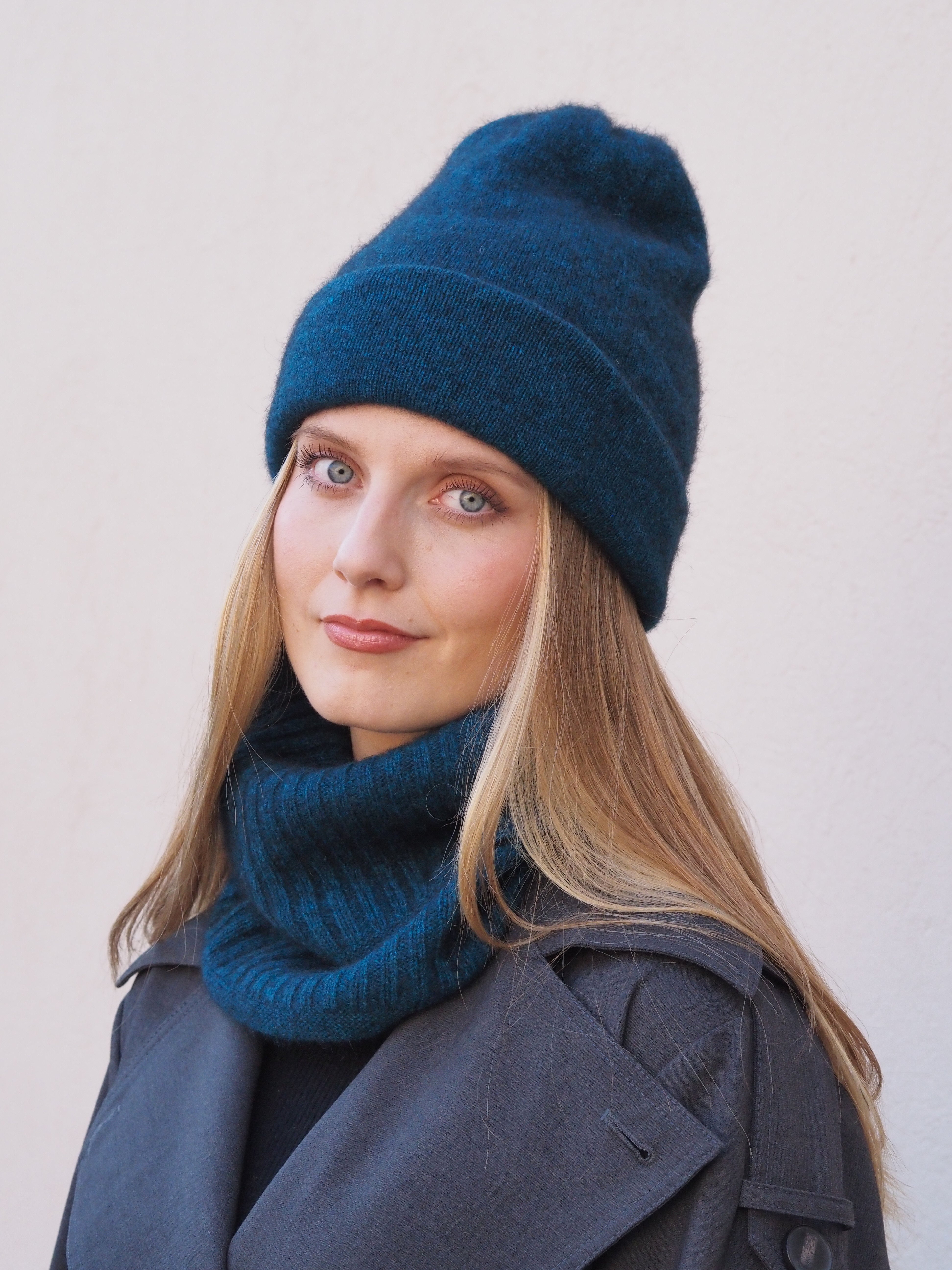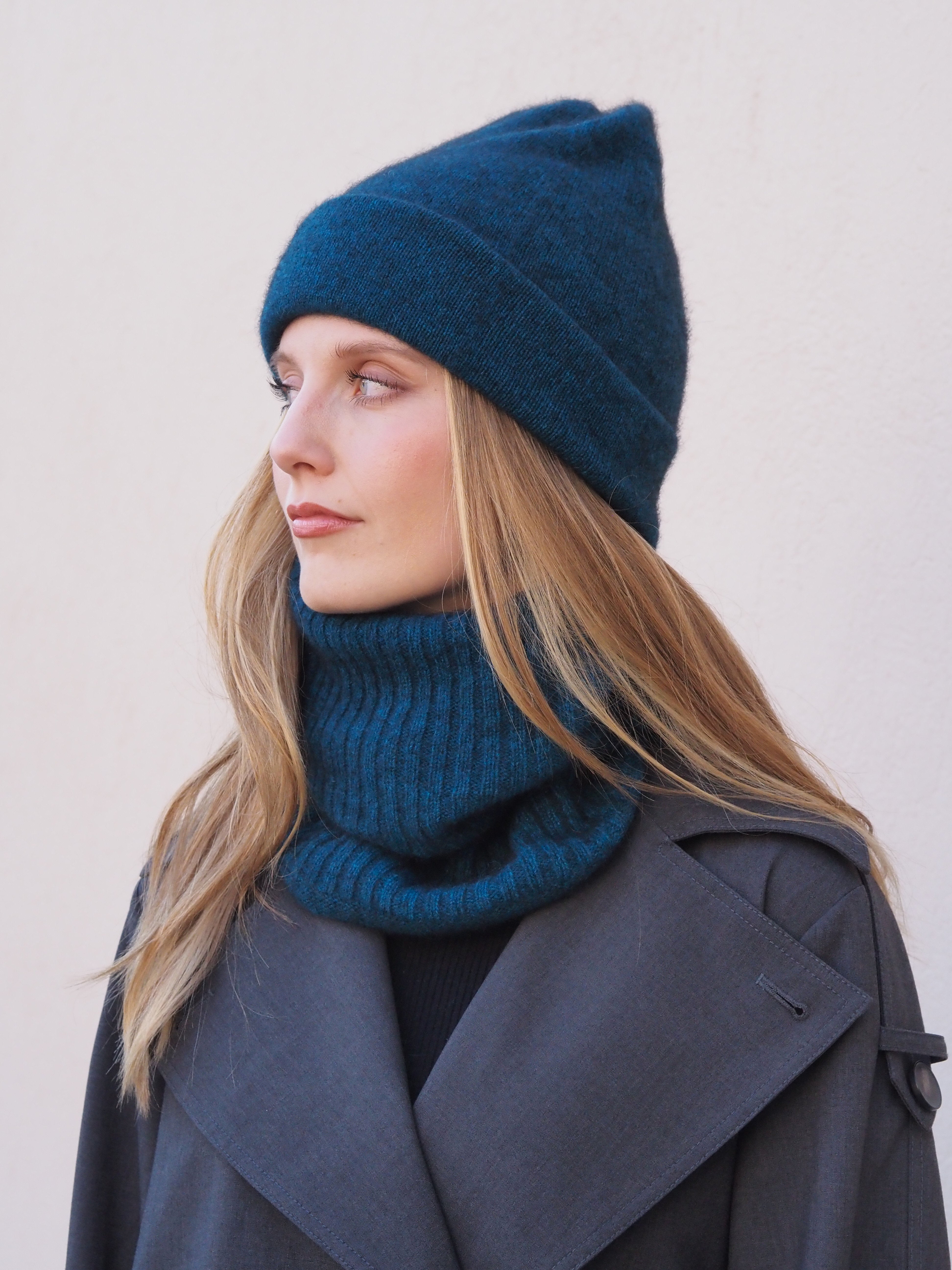 Kestävästä ja lämpimästä merino-kettukusunkarvaneuleesta neulottu petroolin värinen tuubihuivi.