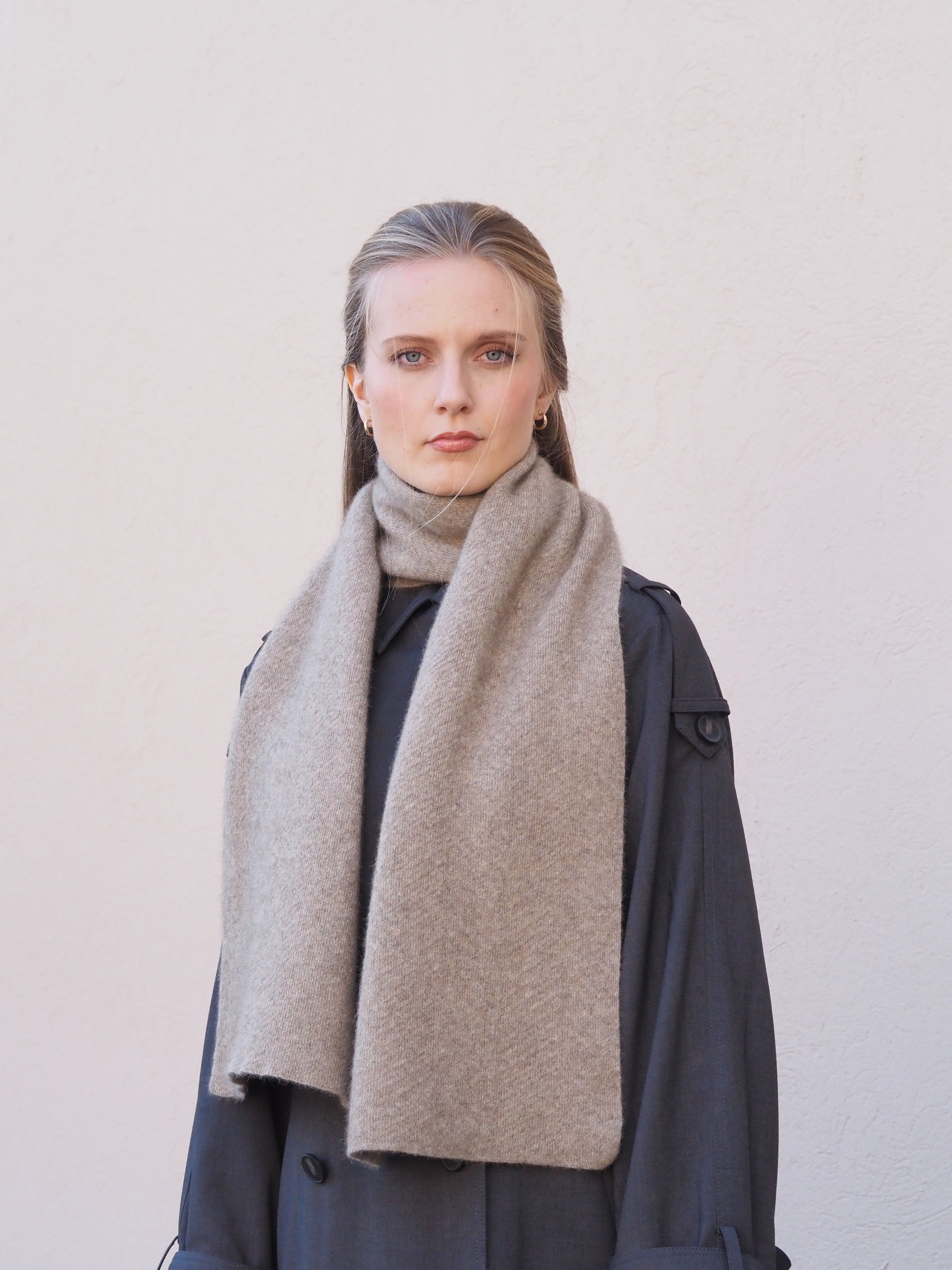 A beige smooth-knit scarf made from merino-possums fur knit. An easy and versatile knit suitable for the whole family.