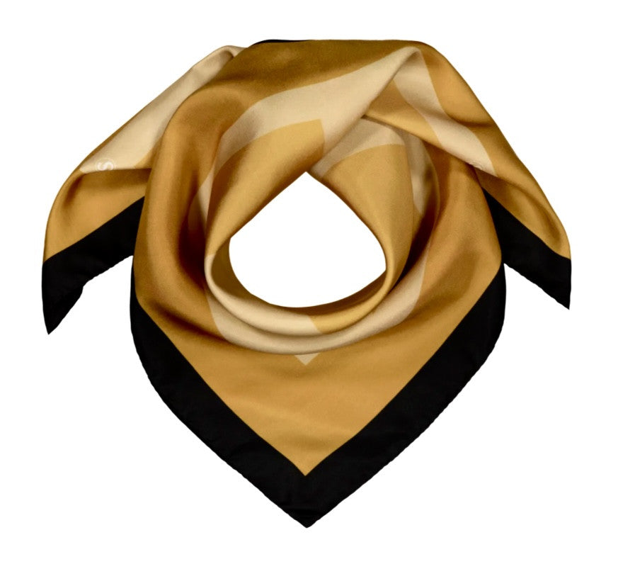 - A classic silk scarf with subtle patterns in shades of golden yellow, beige, and mustard yellow.
