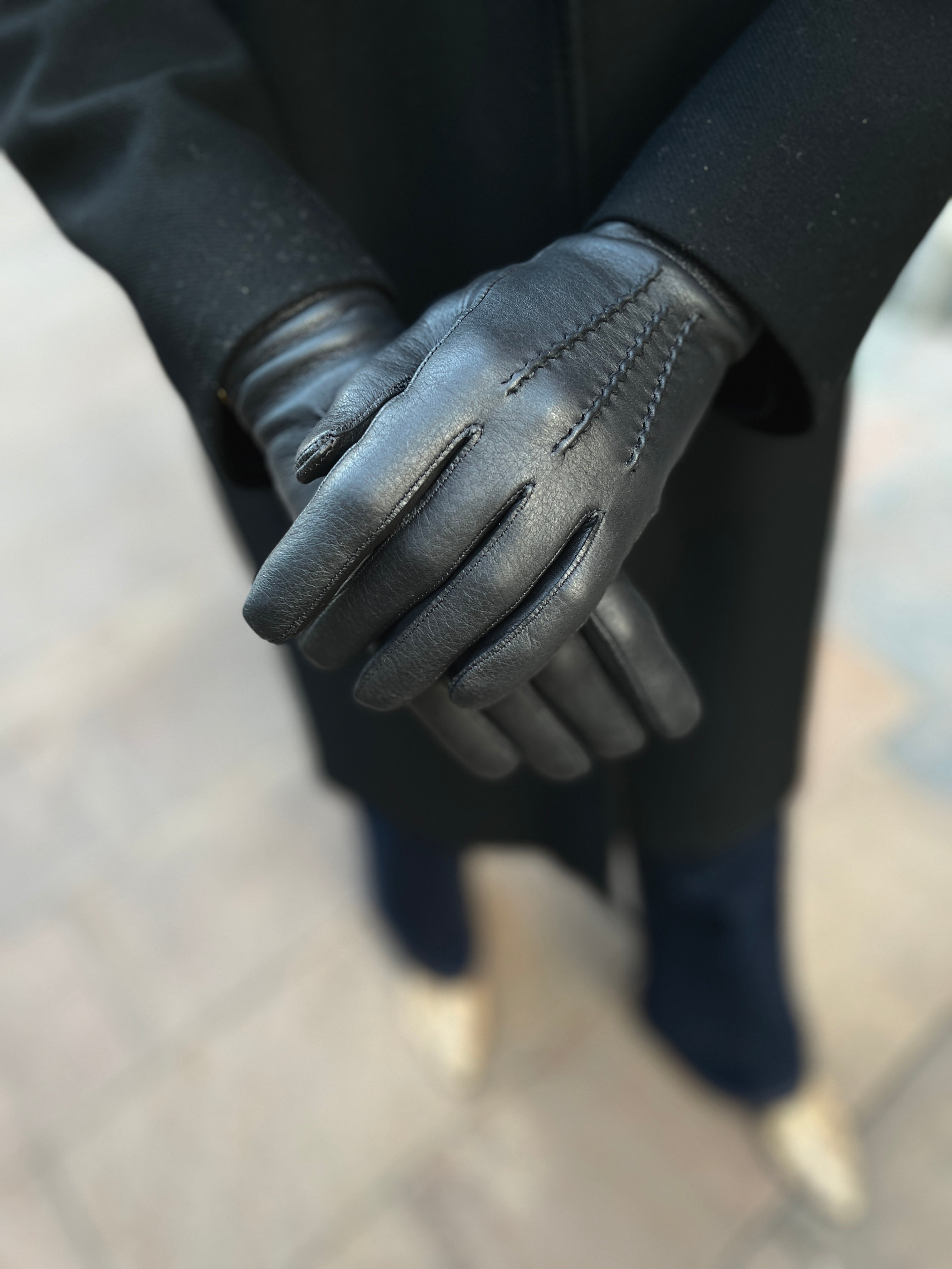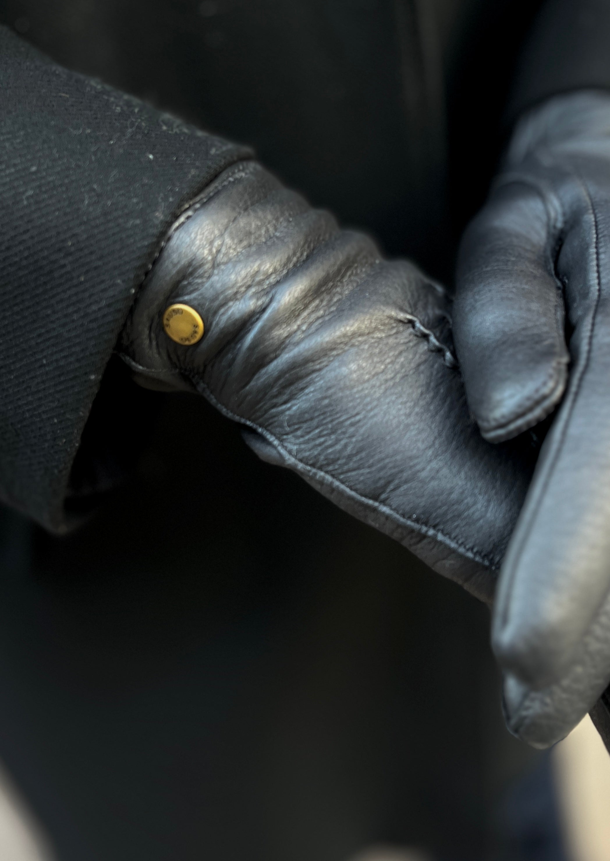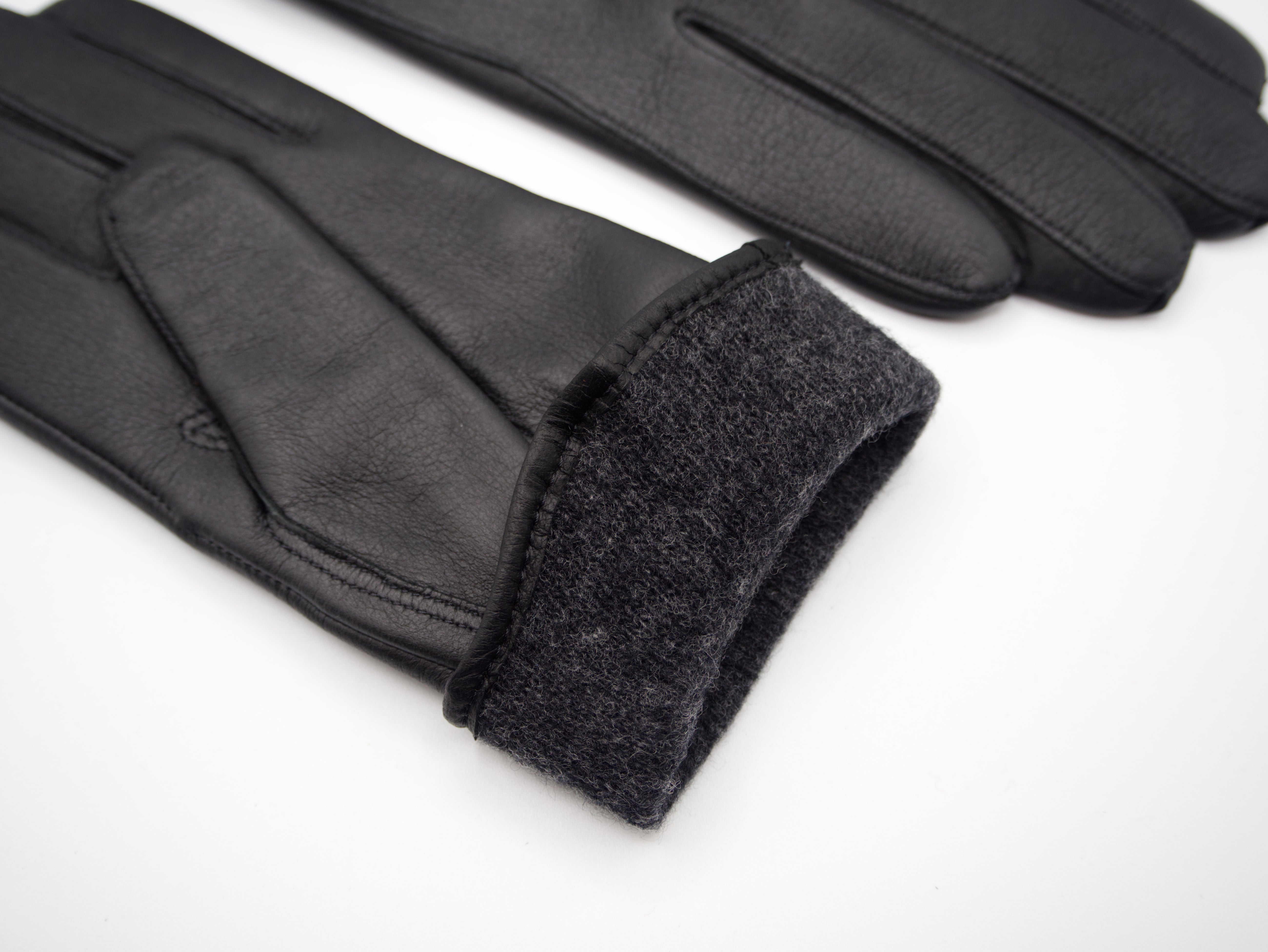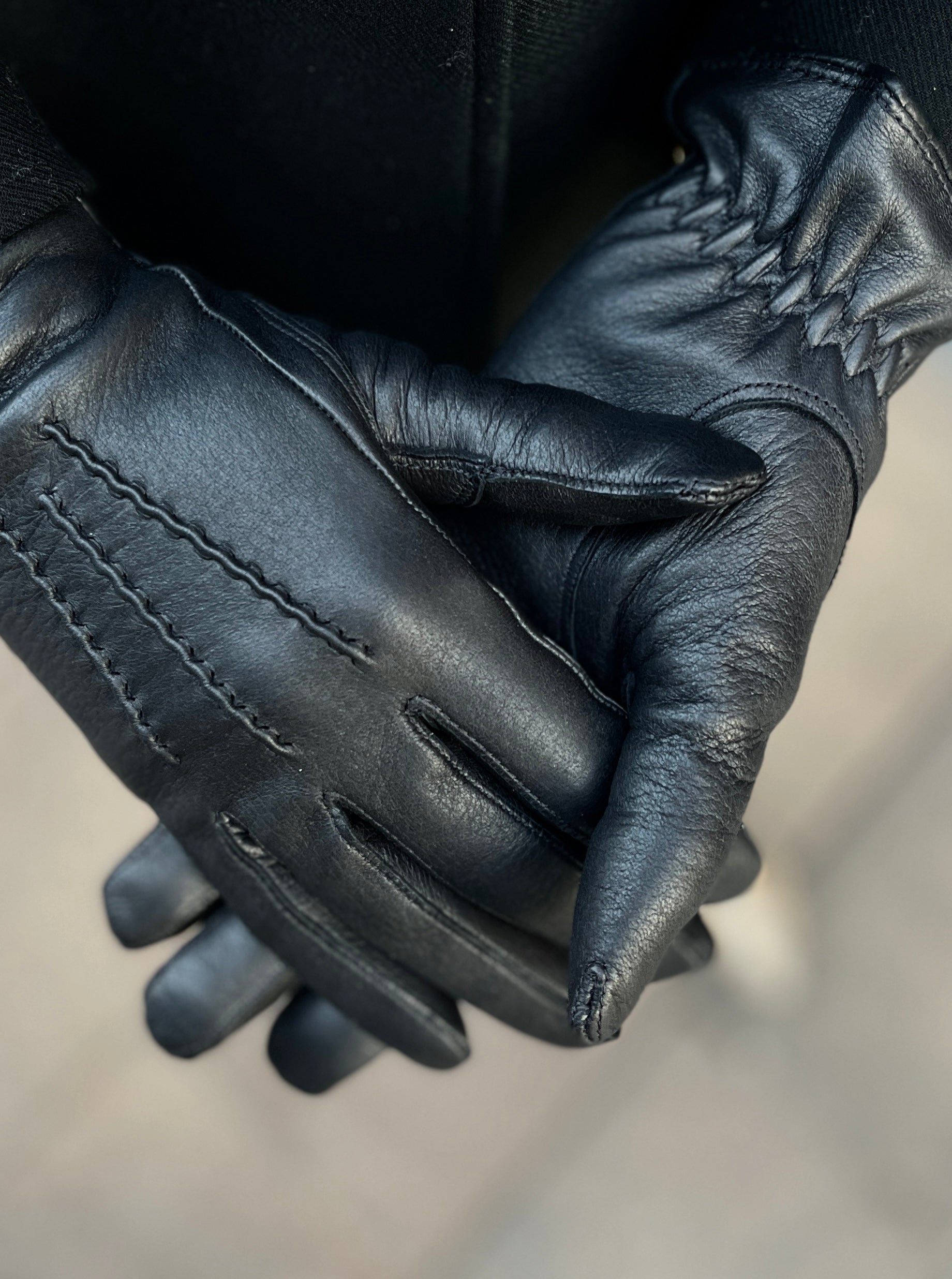 Naisten mustat nahkahanskat suomalaisesta peuran nahasta. Lämmin merinovillavuori tekee käsineistä mukavan lämpimät syksystä kevääseen käytettäväksi.