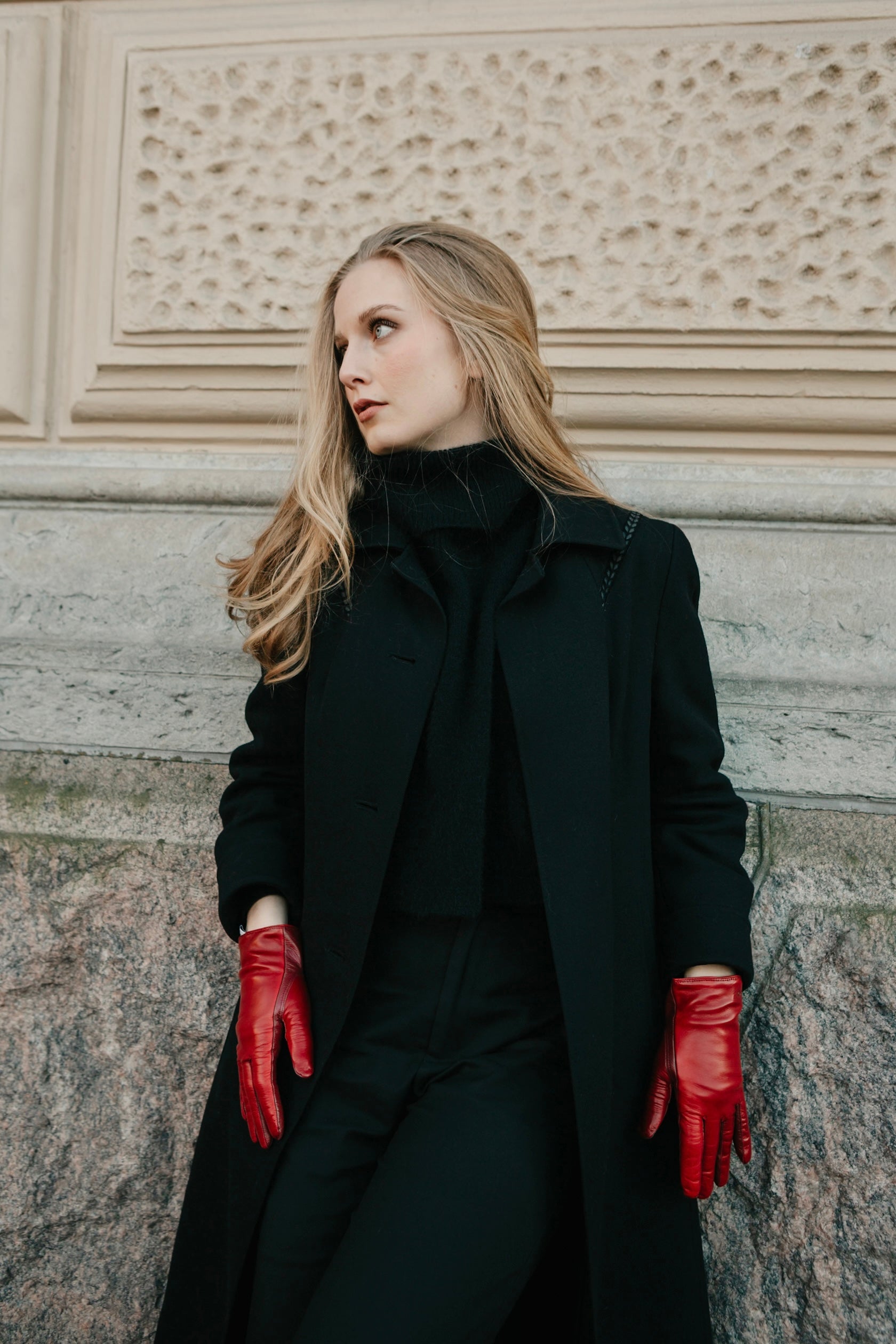 Naisten punaiset nahkakäsineet, joissa kosketusnäyttöominaisuus ja lämmin cashmere/villa vuori. Tyylikäs ja edustava step sauma tekee sormista sirot. Columba huivissa on 4 eri punaisen sävyä ja ne sopivat punaisten Kiia käsineiden kanssa täydellisesti.