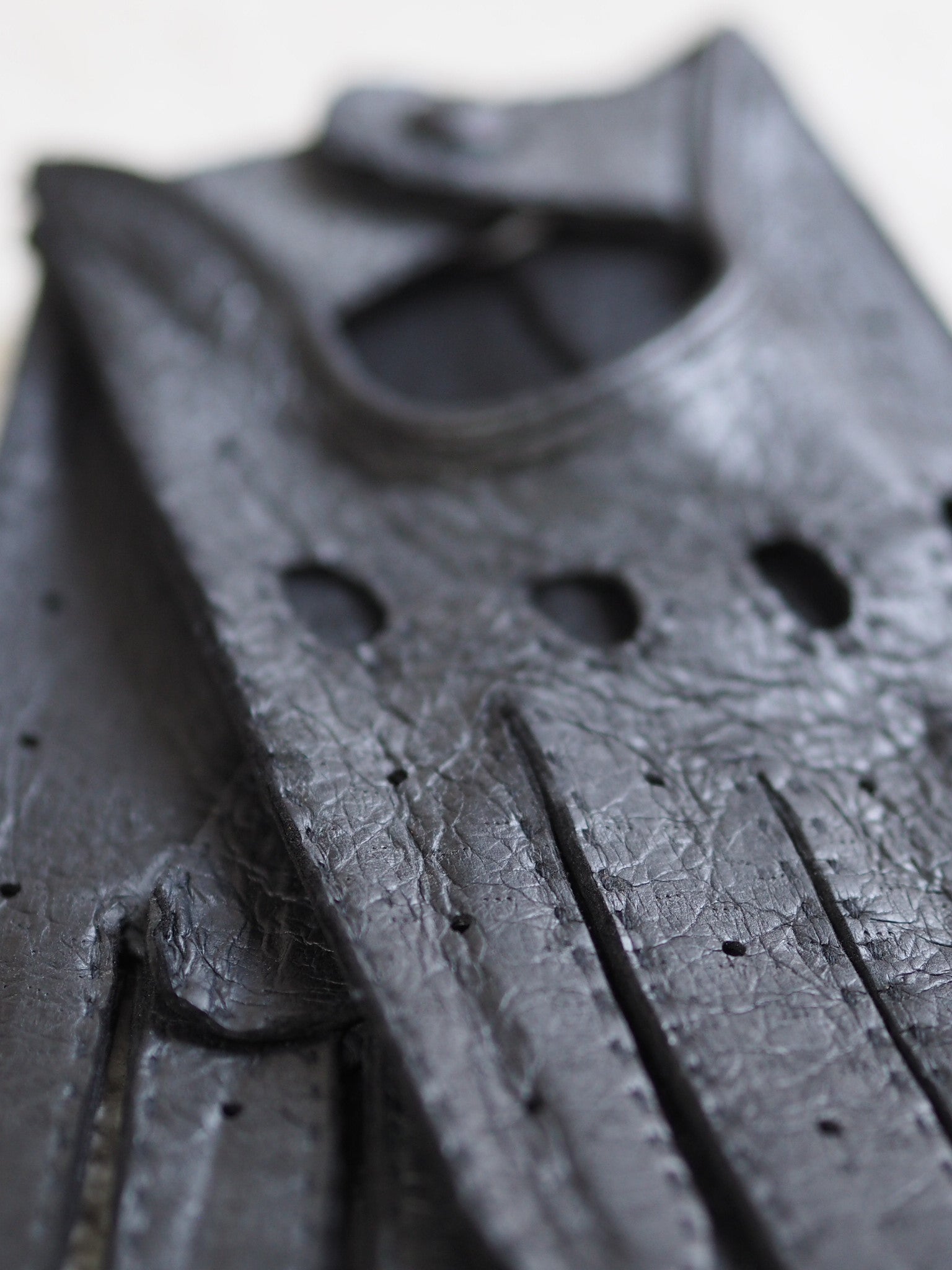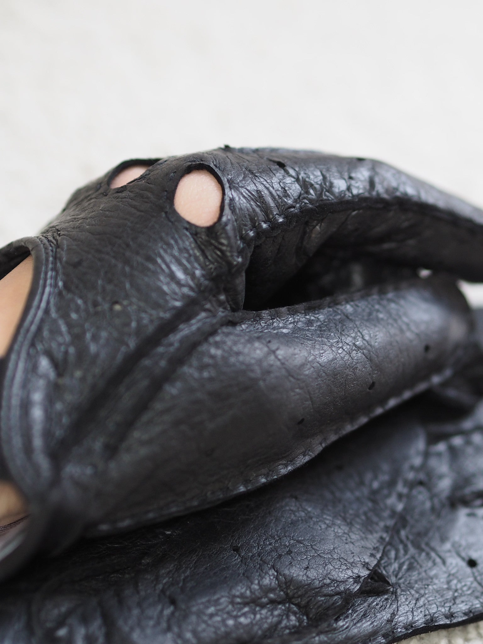 Peccary wild boar leather is a thick, breathable, and porous material, which is why it is also soft and retains heat well. In an unlined glove, the velvety soft leather is felt more on the skin, making this glove comfortable to wear. The unique structure of the leather shows three adjacent dots of hair follicles - this is how you recognize genuine peccary wild boar leather. The leather can last for years and develops a beautiful patina over time. These gloves truly bring joy to their user for many years! The esteemed peccary wild boar leather is the nobility of leathers.