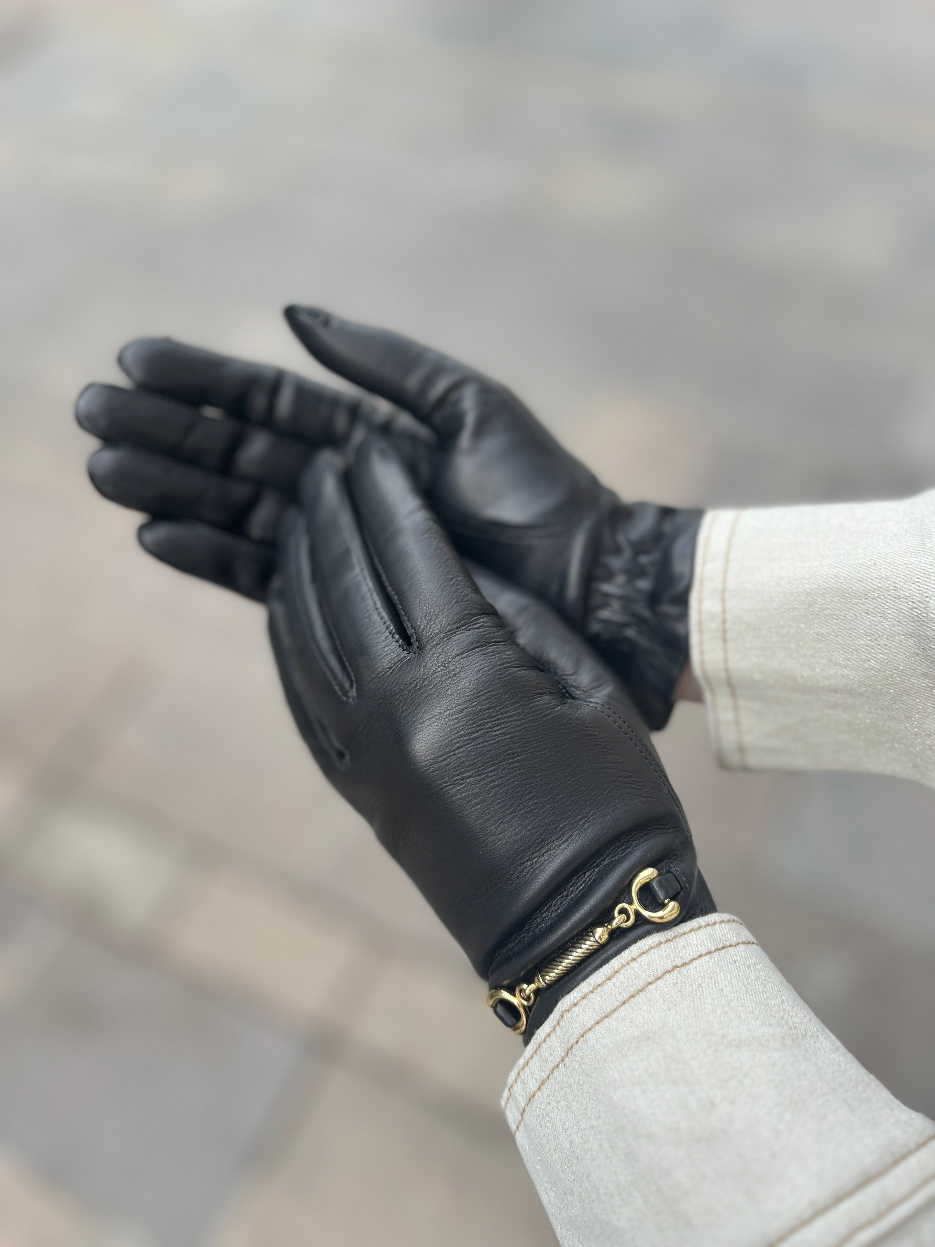 Lyhyt vartiset, silkkivuoriset käsineet, joissa step-sauma, käsin tikattu suuosa ja metallinen koru. Koru tekee käsineisiin luonnetta ja persoonaa. Kaunis rannekuminauha tekee ranteesta siron.