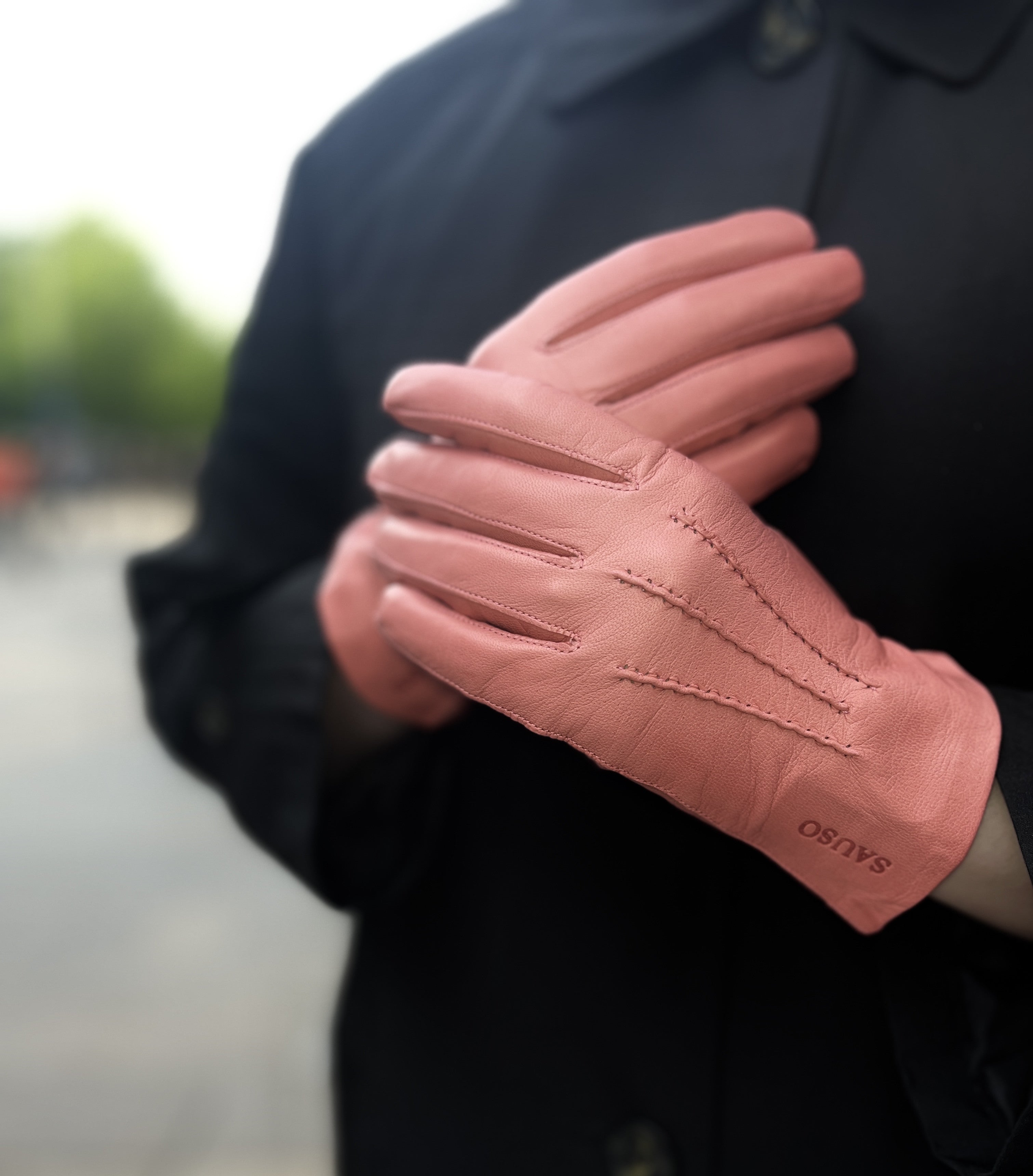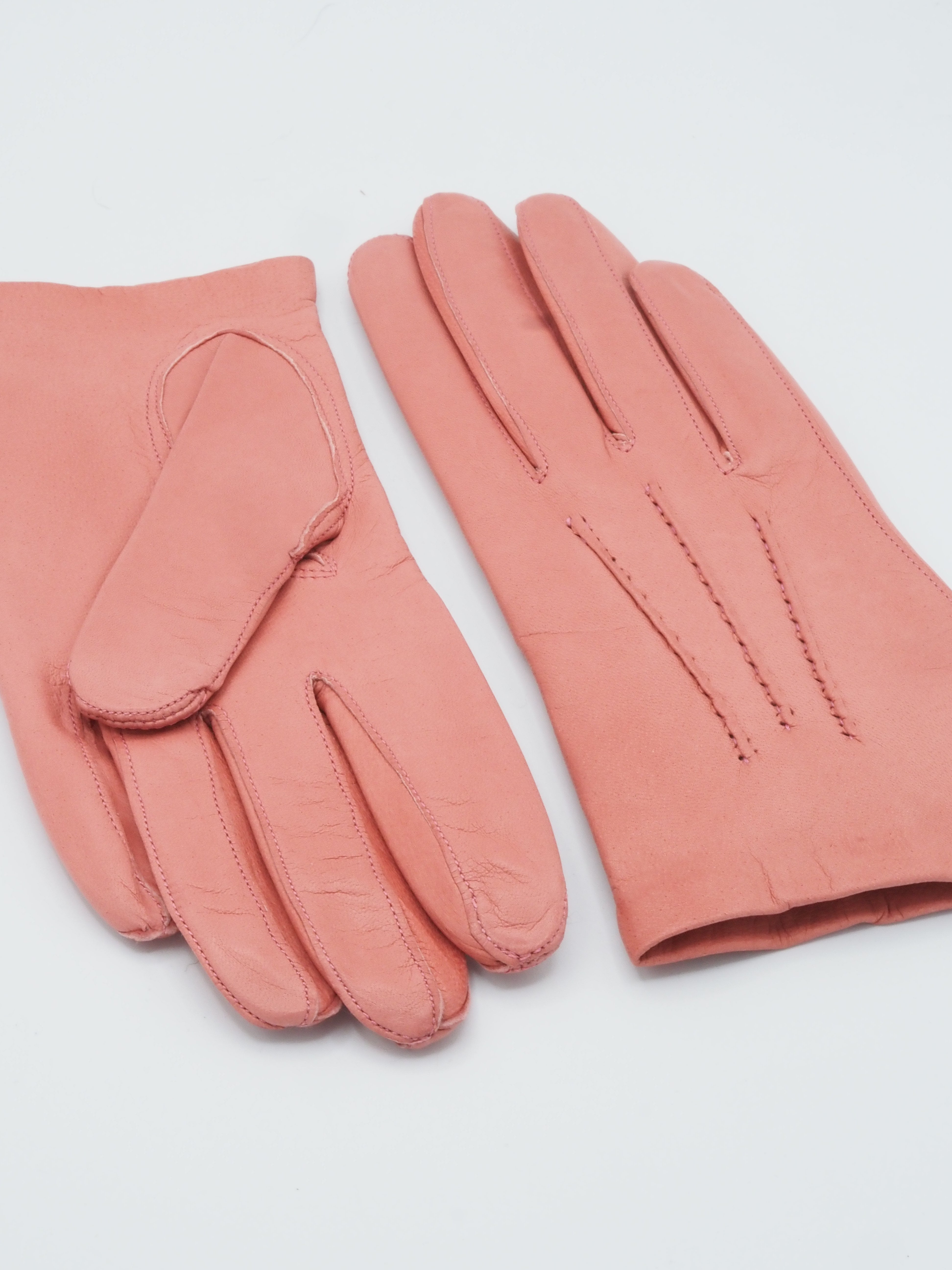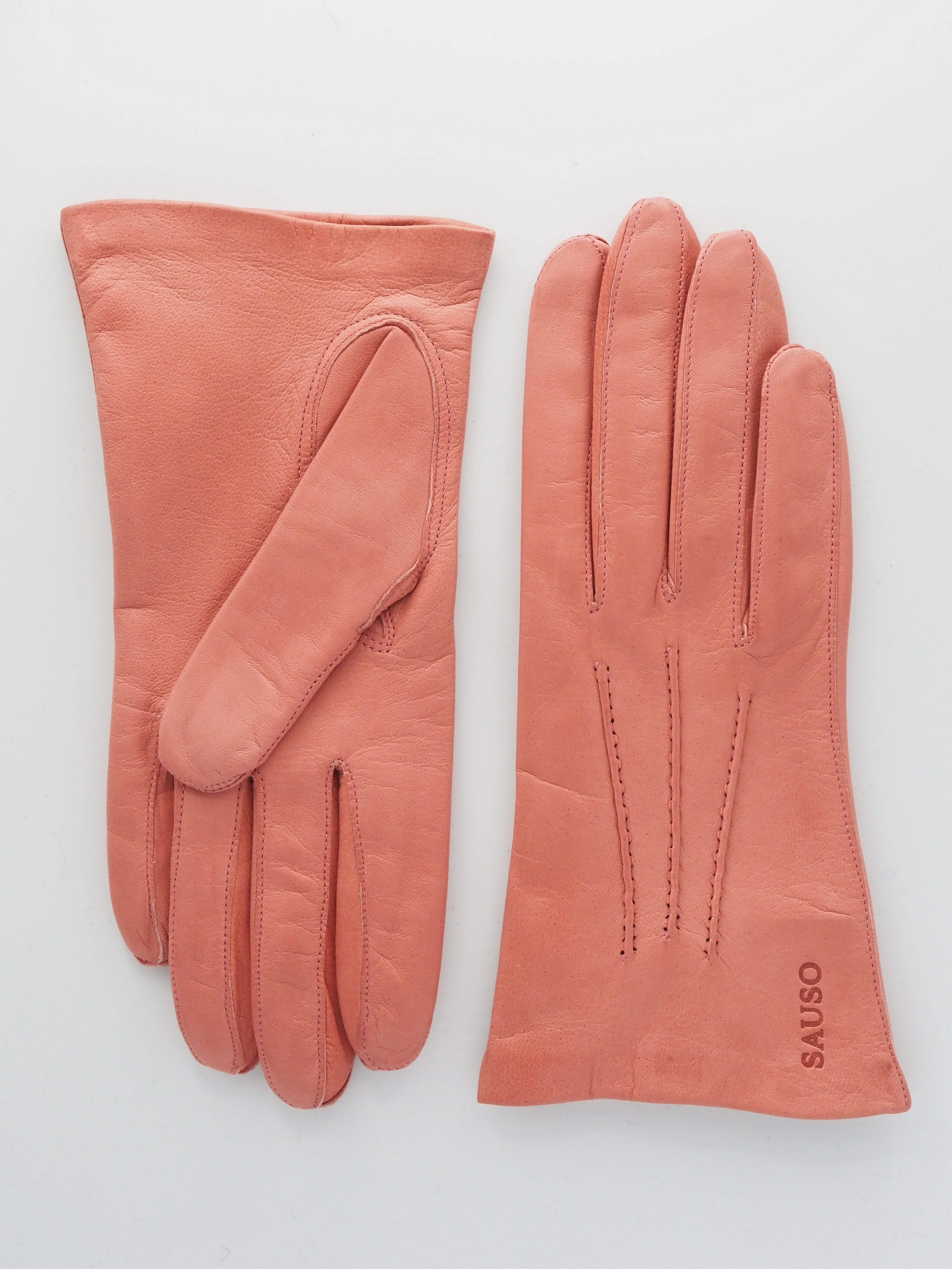 Lyhyt ja siro Etiopian karvalampaan nahasta käsityönä valmistettu käsine, jossa silkkivuori. Värinä kaunis pastellinen koralli. Suuosa on ommeltu käsin, joten suuosa on pehmeä ja joustava ja sen ansiosta hansikkaat on helppo pukea käsiin. Päällä kolme käsin ommeltua koristetenttausta. Step sauma tekee sormista sirot.