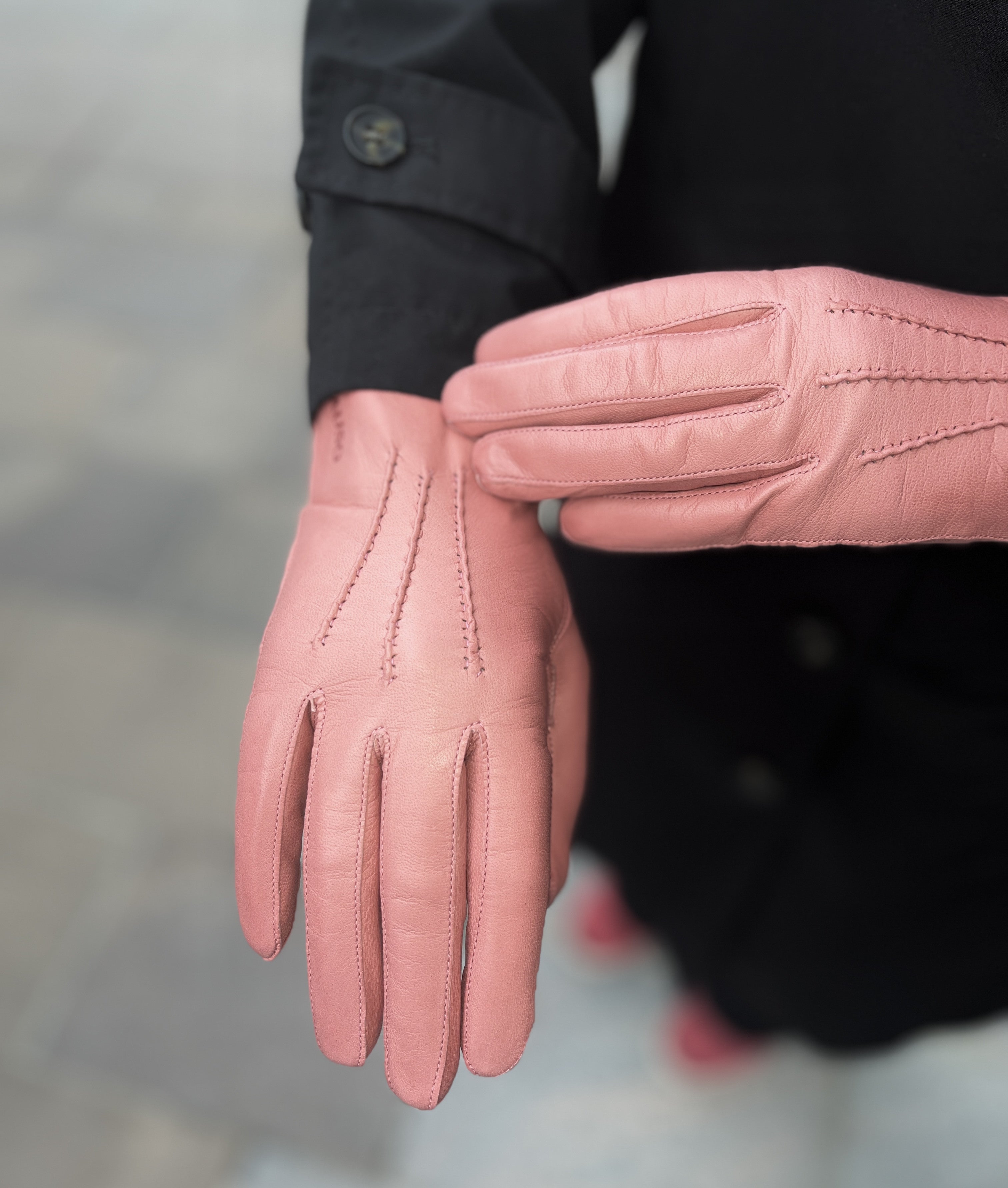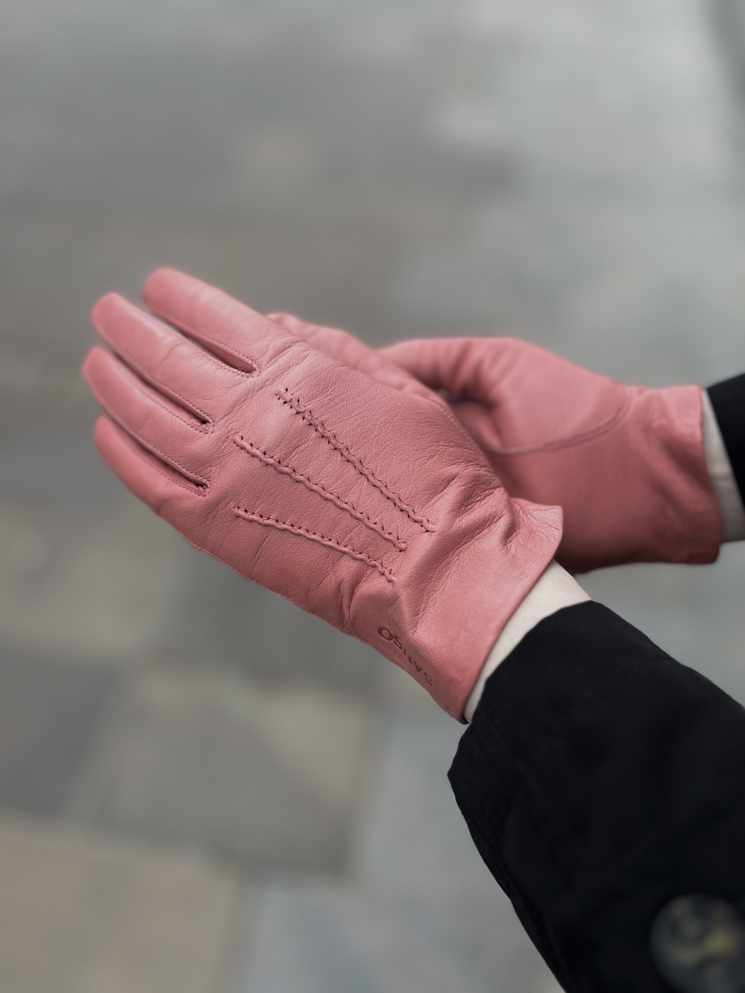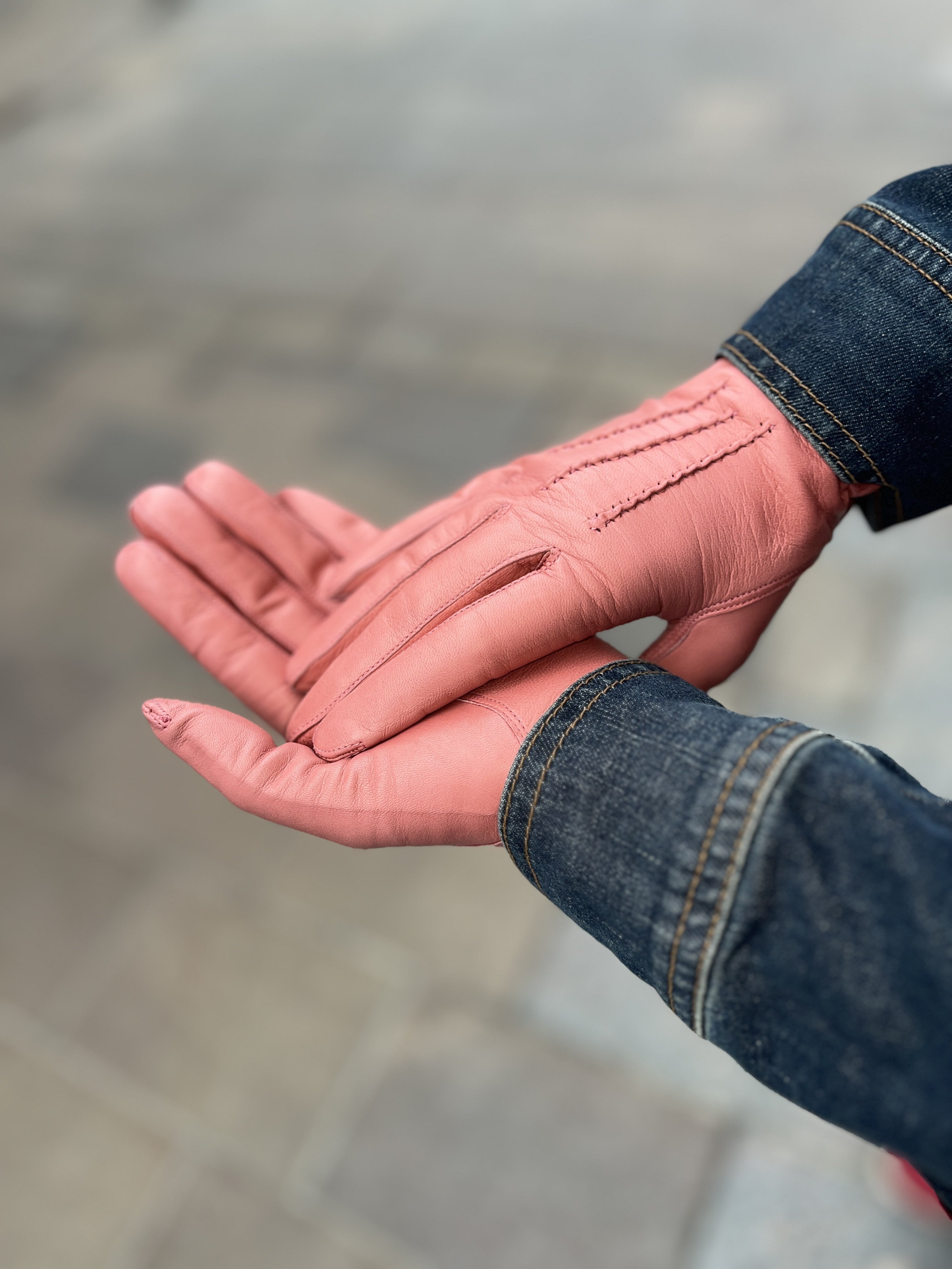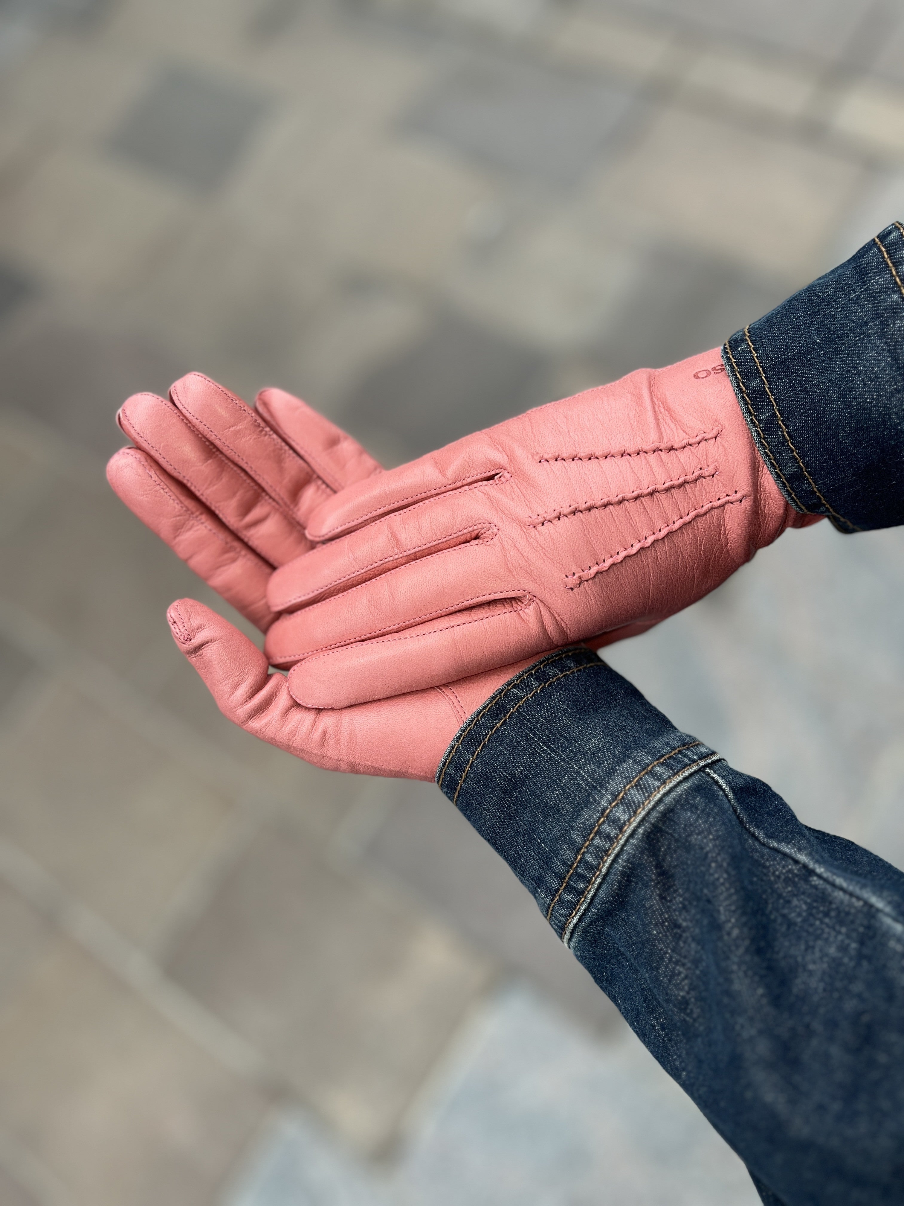 Lyhyt ja siro Etiopian karvalampaan nahasta käsityönä valmistettu käsine, jossa silkkivuori. Värinä kaunis pastellinen koralli. Suuosa on ommeltu käsin, joten suuosa on pehmeä ja joustava ja sen ansiosta hansikkaat on helppo pukea käsiin. Päällä kolme käsin ommeltua koristetenttausta. Step sauma tekee sormista sirot.
