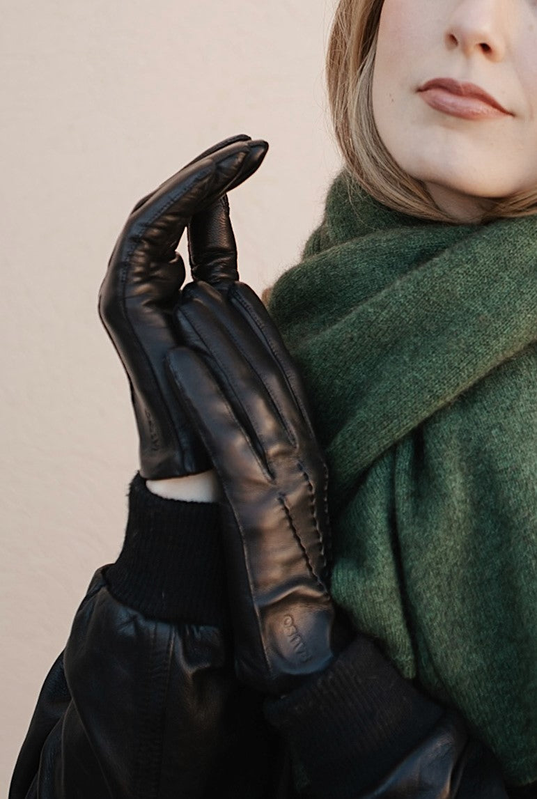 Lyhyt ja siro Etiopian karvalampaan nahasta käsityönä valmistettu käsine, jossa silkkivuori ja pidennetty sormiosa.