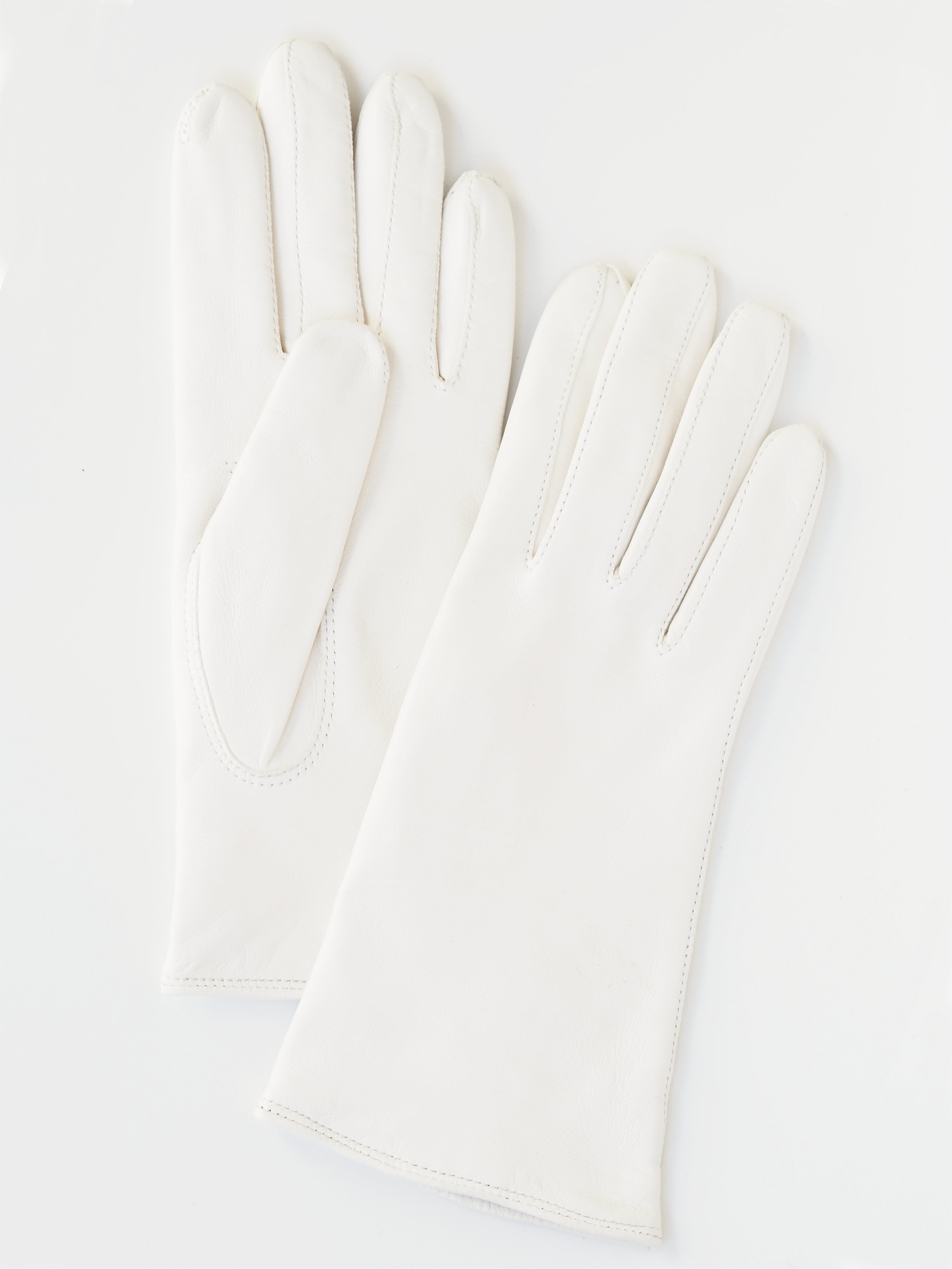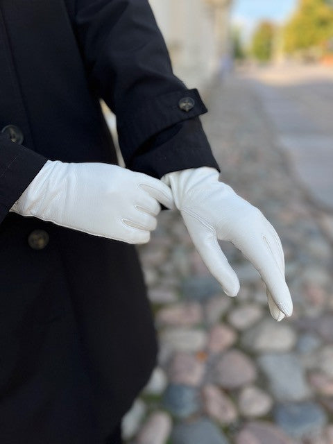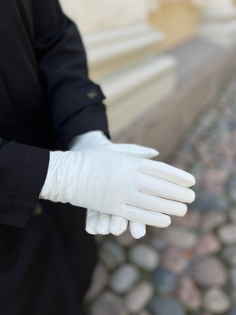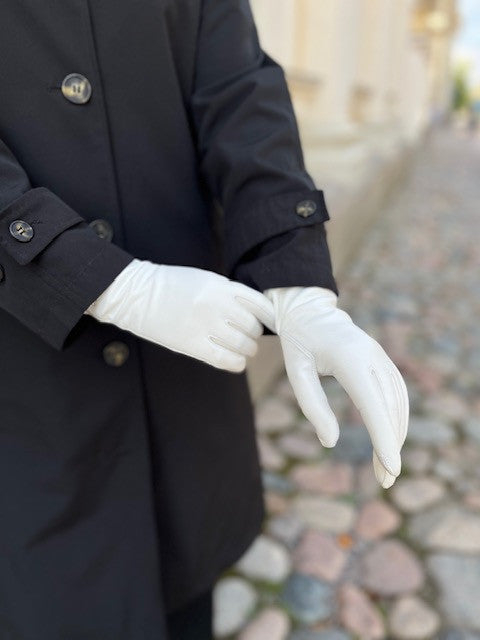 Naisten valkoiset nahkakäsineet, joissa silkkivuori. Klassinen käsine, joka on valmistettu käsityönä pehmeästä lampaan nahasta. Pehmeän nahan, ylellisen silkkivuorin ja siron step-sauman ansiosta käsine on kevyen tuntuinen ja se muotoutuu hyvin miellyttävästi käteen.