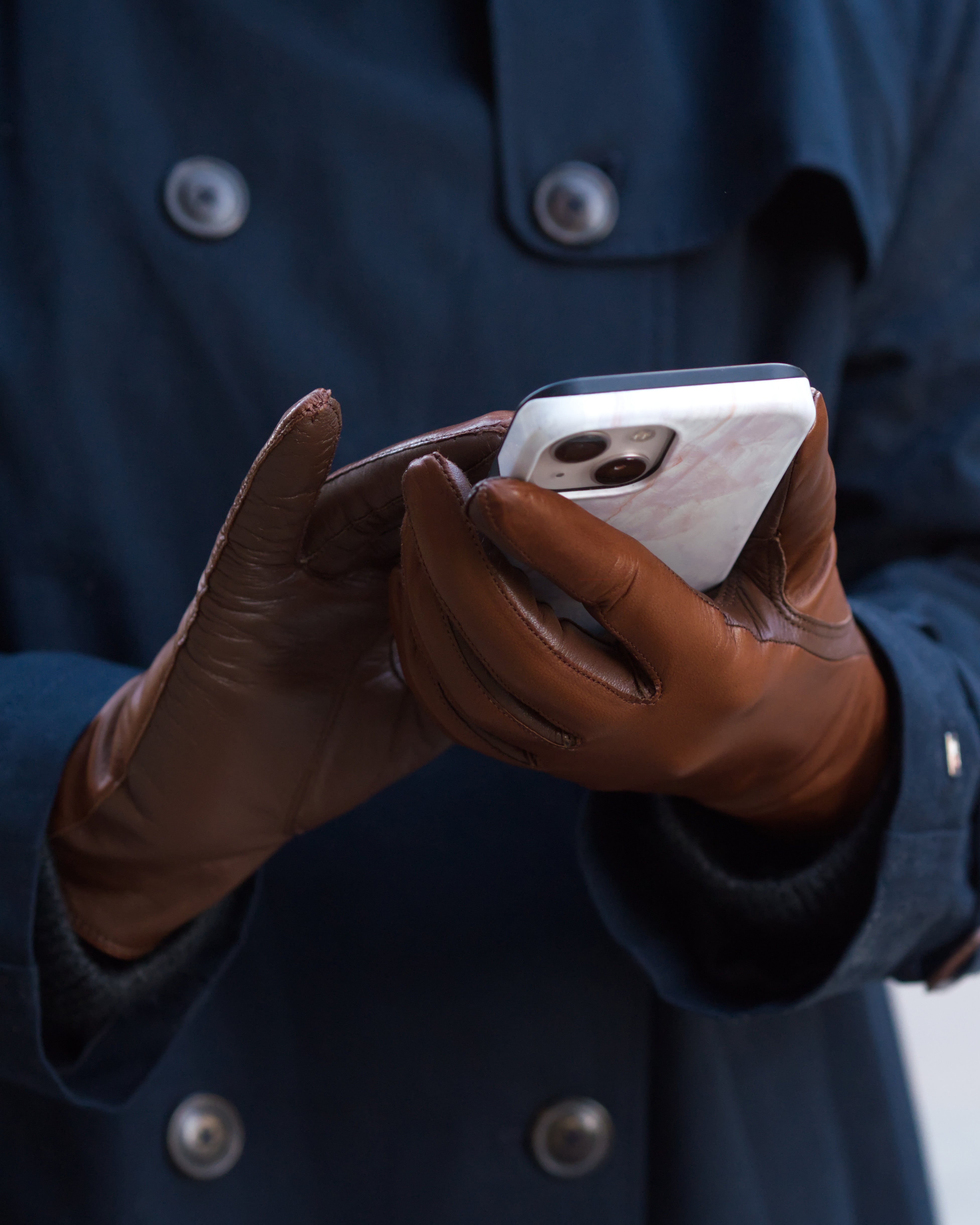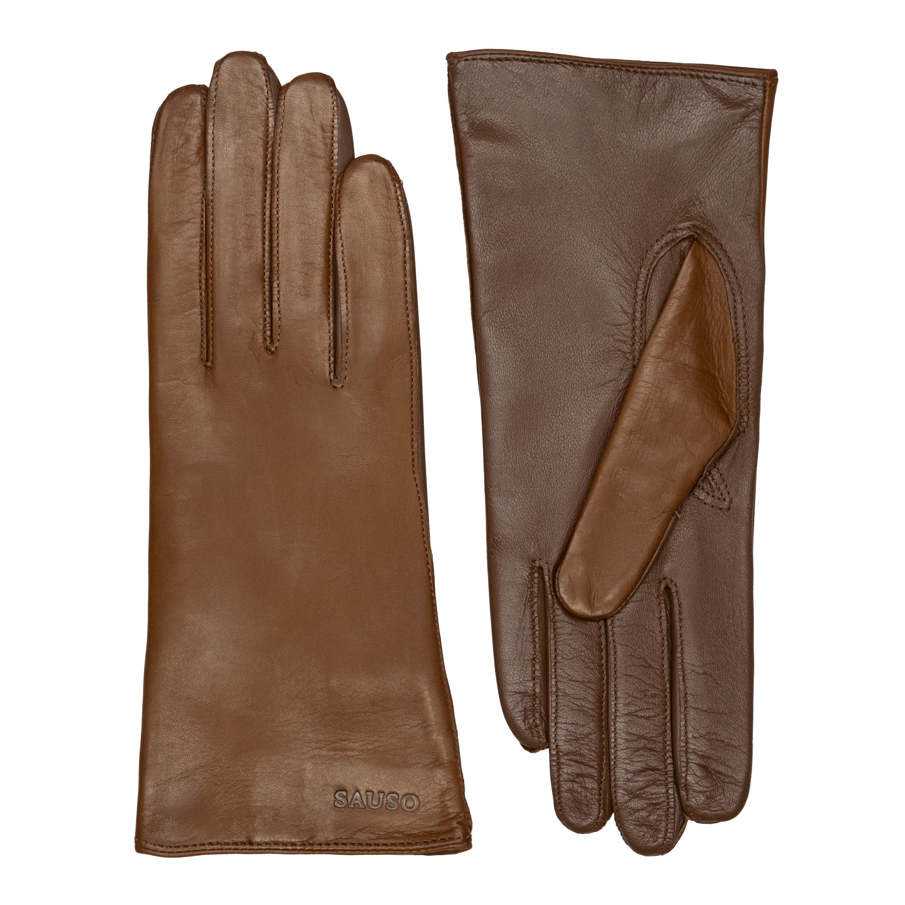 Kosketusnäytöllä toimivat naisten klassiset ruskeat nahkakäsineet, joissa ylellinen silkkivuori. Ohuet nahkakäsineet sopivat loistavasti läpi vuoden käytettäväksi, mutta parhaiten ne sopivat syksyn ja kevään lämpötiloihin, sekä ajokäsineeksi.