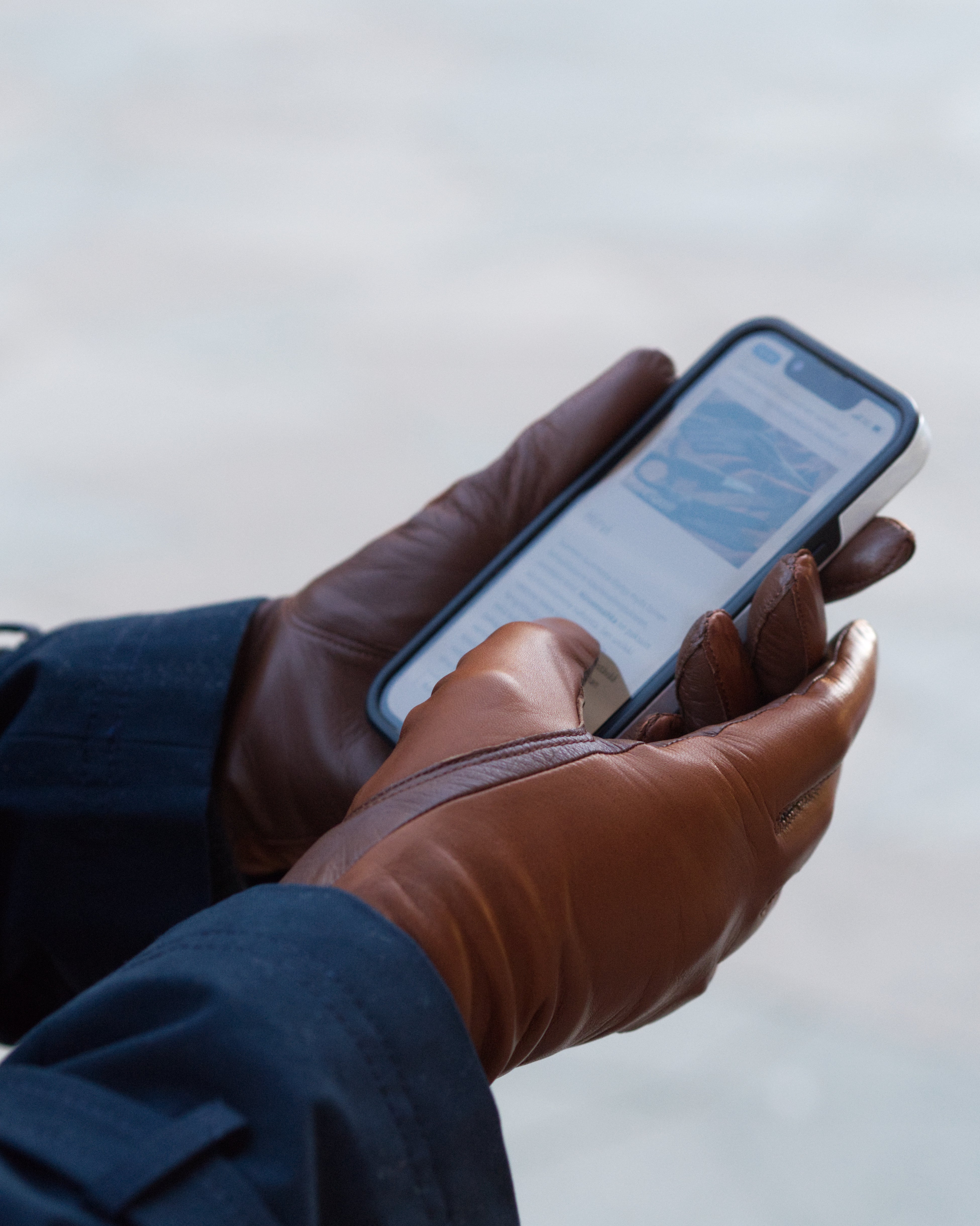 The touchscreen feature is based on the leather's electrical conductivity. The leather is treated so that the skin's electricity passes through it. The treatment makes the leather slightly matte. In this glove, touchscreen leather is used across the entire palm.