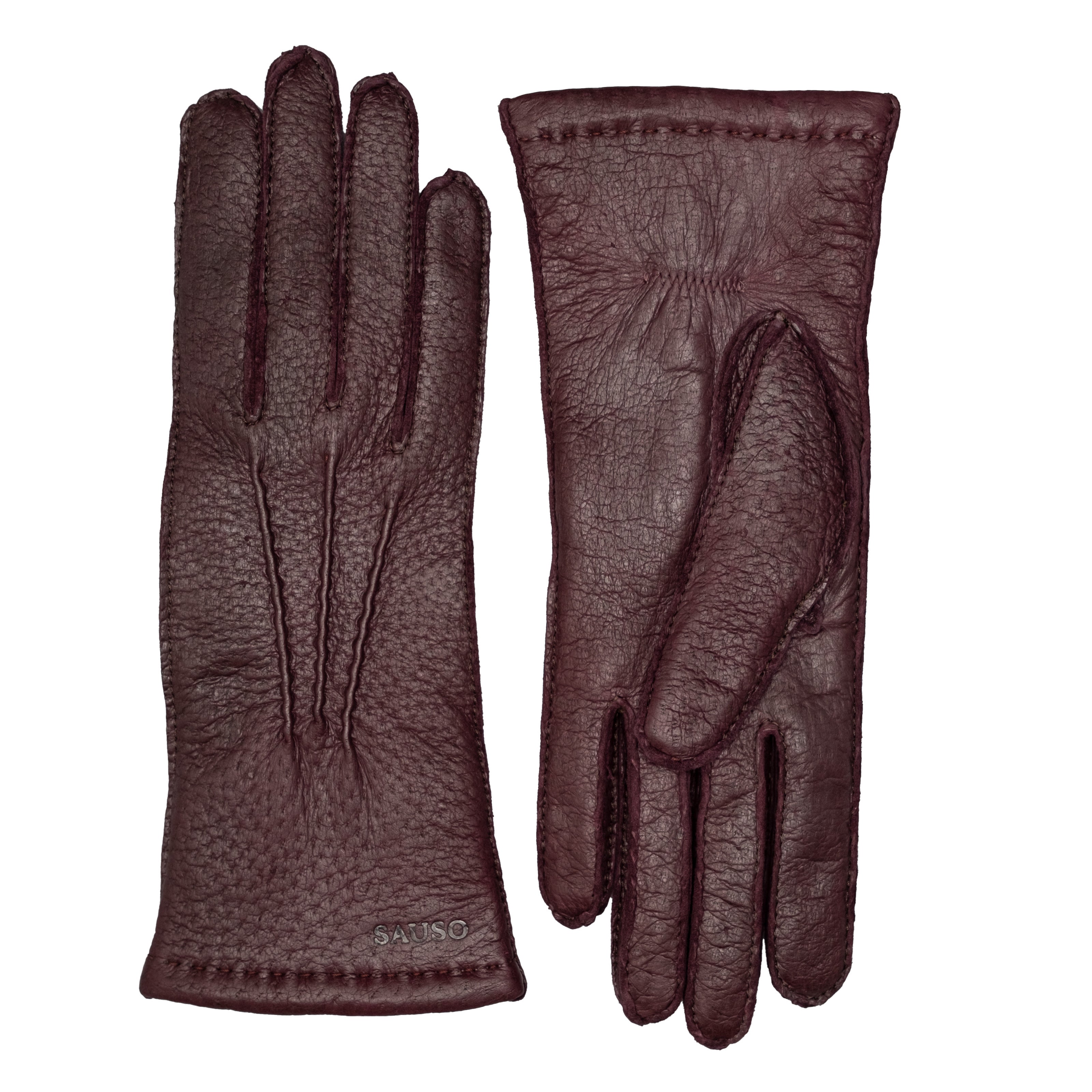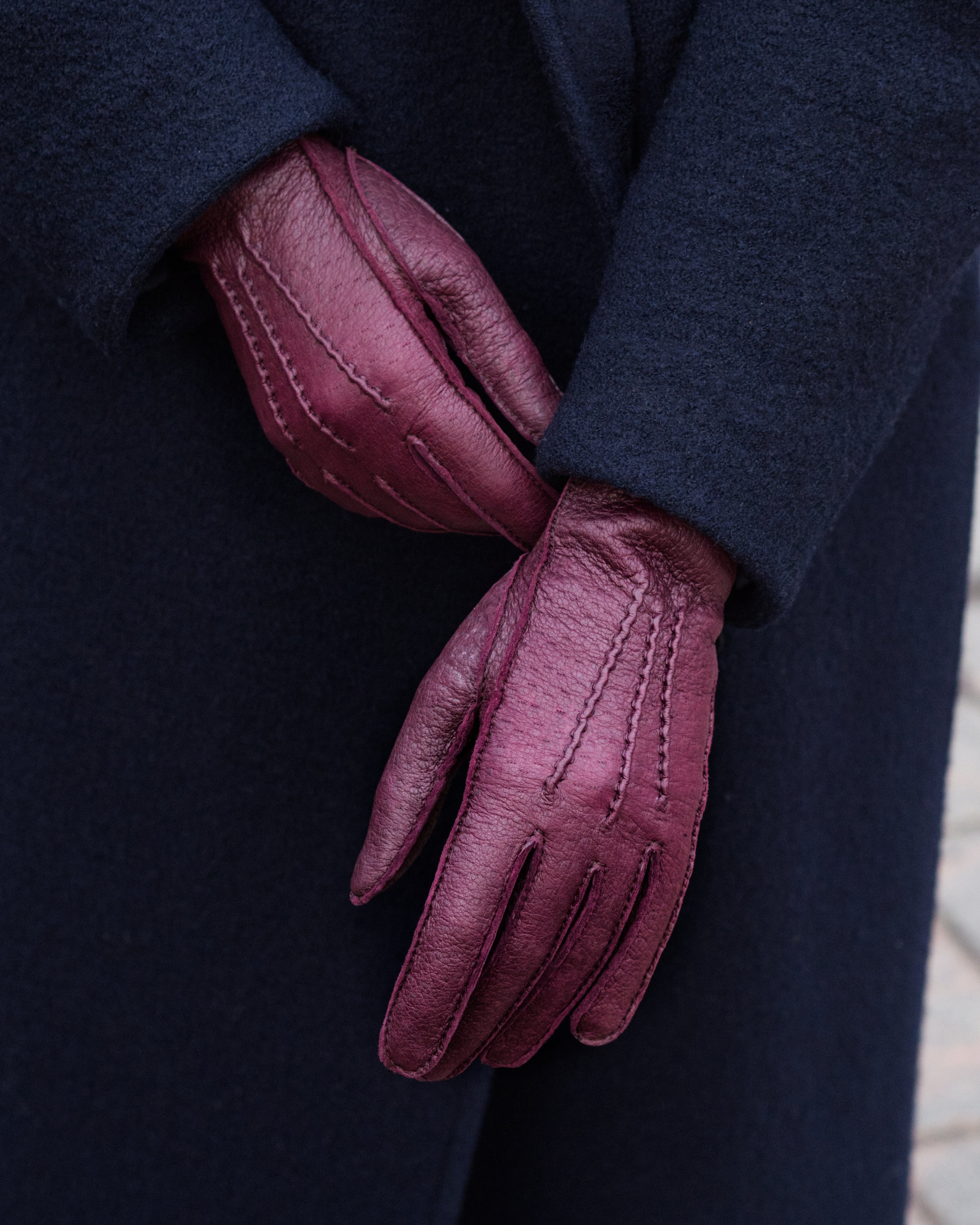Peccary- villisiasta käsityönä valmistetut viininpunaiset käsineet ovat todellinen klassikko. Ajattomissa käsineissä on samettisen pehmeä nahka, lämmin kashmir-villavuori ja klassinen malli. Loistava tuntuma ja kestävyys tekevät siitä käsineiden aatelia.