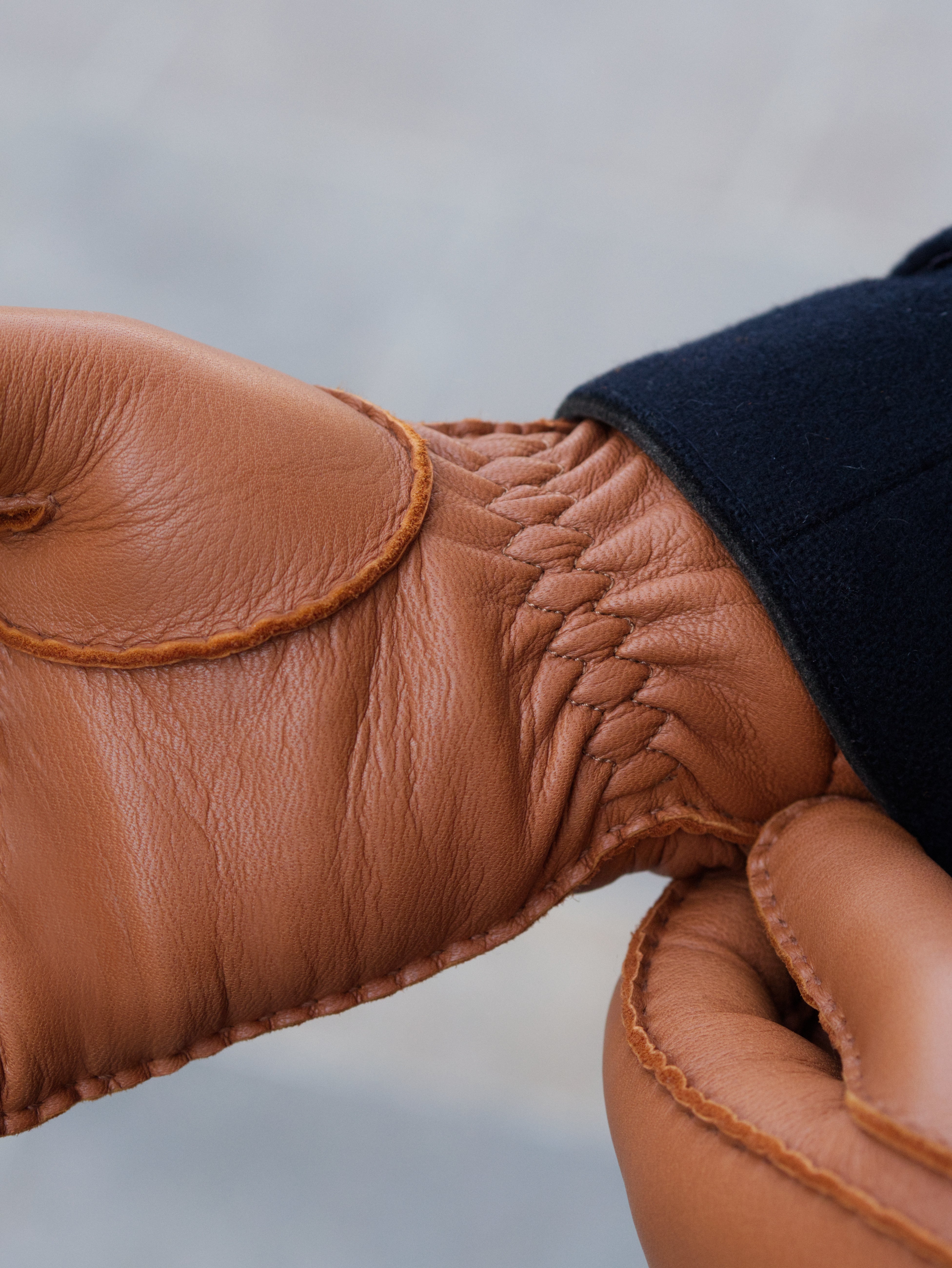Ranteessa oleva kuminauha auttaa pitämään viiman loitolla. Paksu peurannahka ja ainutlaatuinen vuorimateriaali yhdessä tekevät hansikkaista erittäin lämpimät.