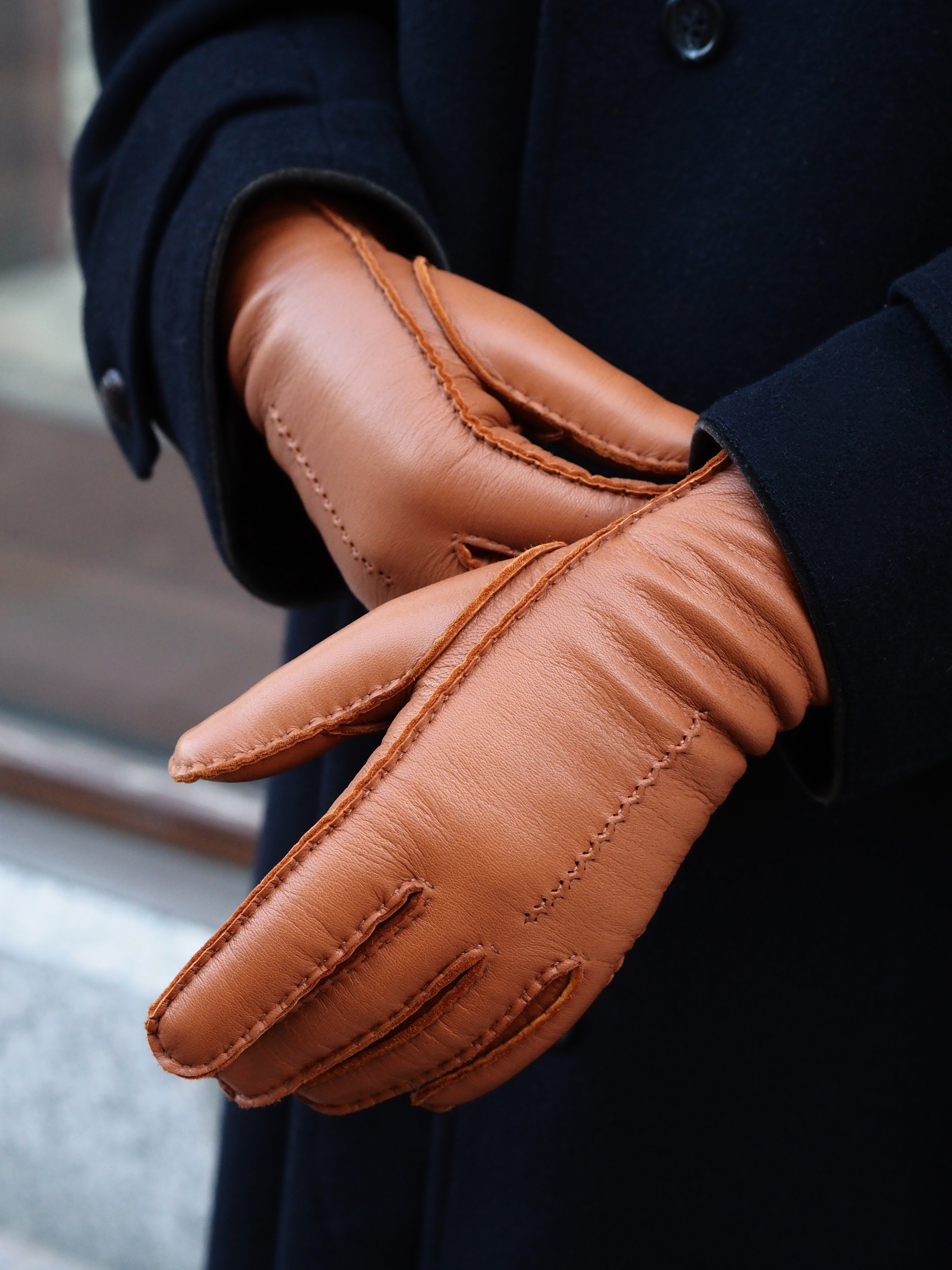 Using a centuries-old table cutting method, the gloves achieve a perfect fit. The skins are cut individually by hand. Excess stretch is manually removed from the leather, leaving only the adaptation allowance that ensures an excellent fit. This ensures that the gloves do not stretch with use but retain their fit. The skins are also utilized as precisely as possible to avoid material waste. Due to this purposeful shaping, the gloves should initially fit the hand very snugly.