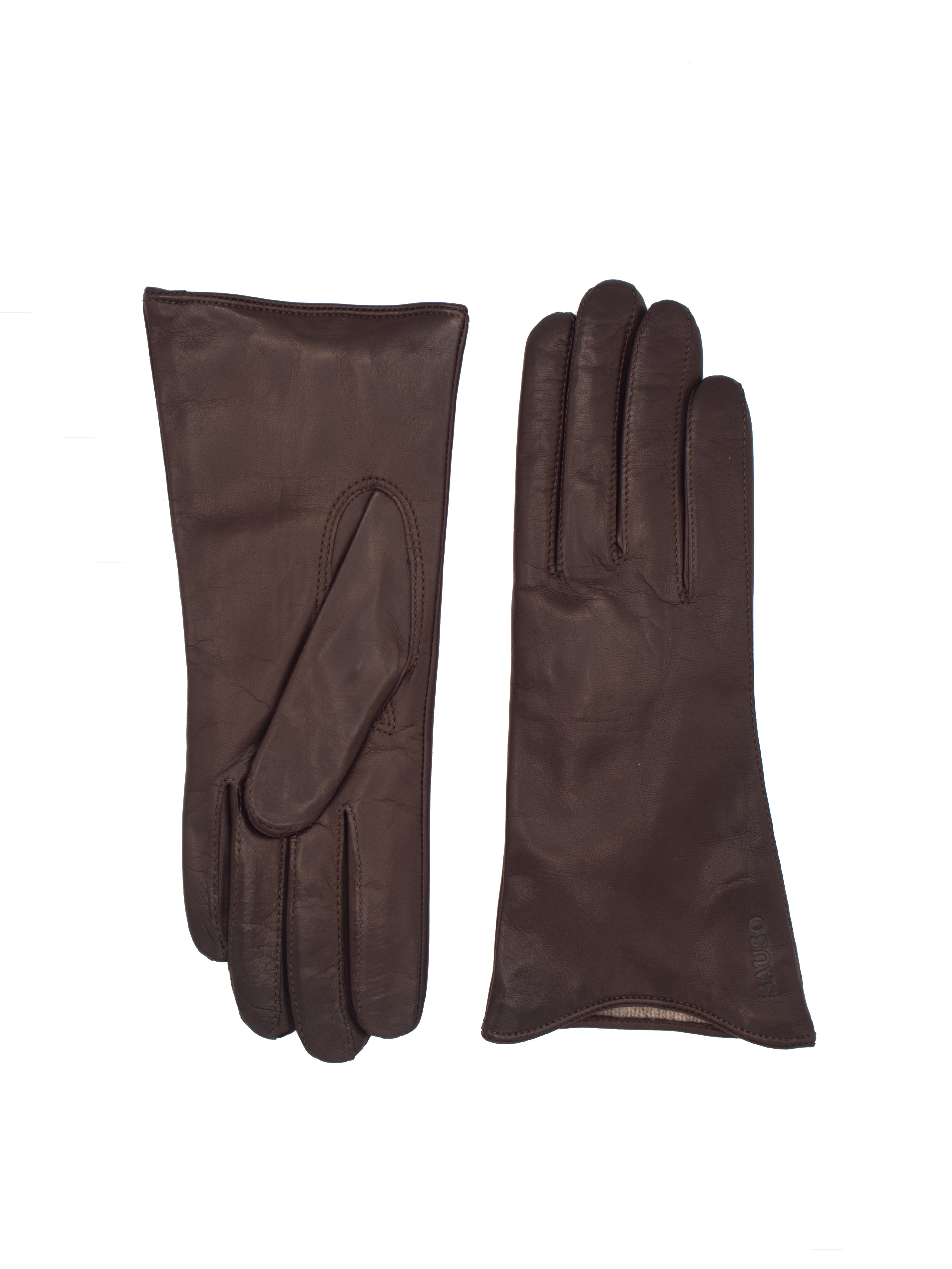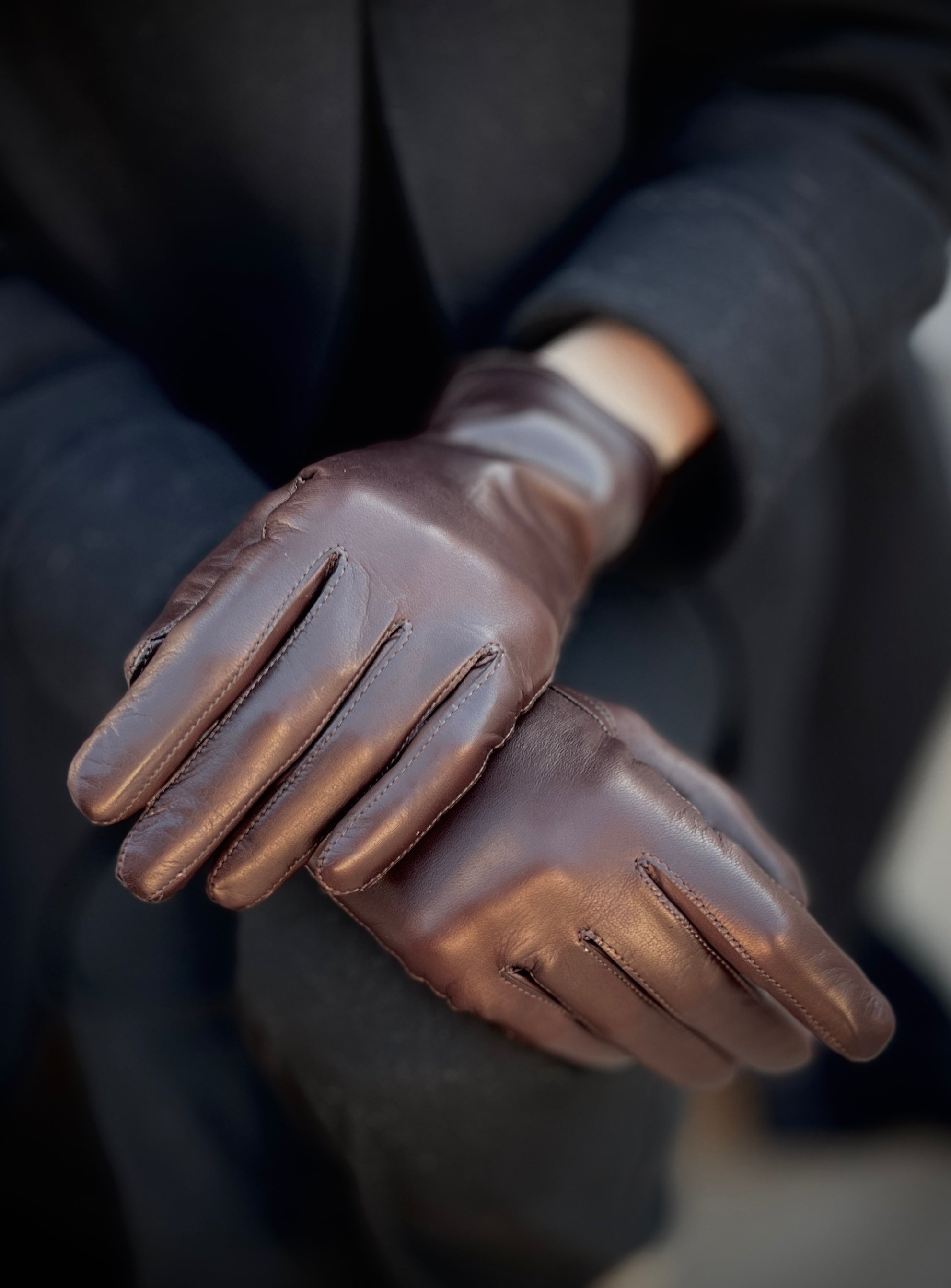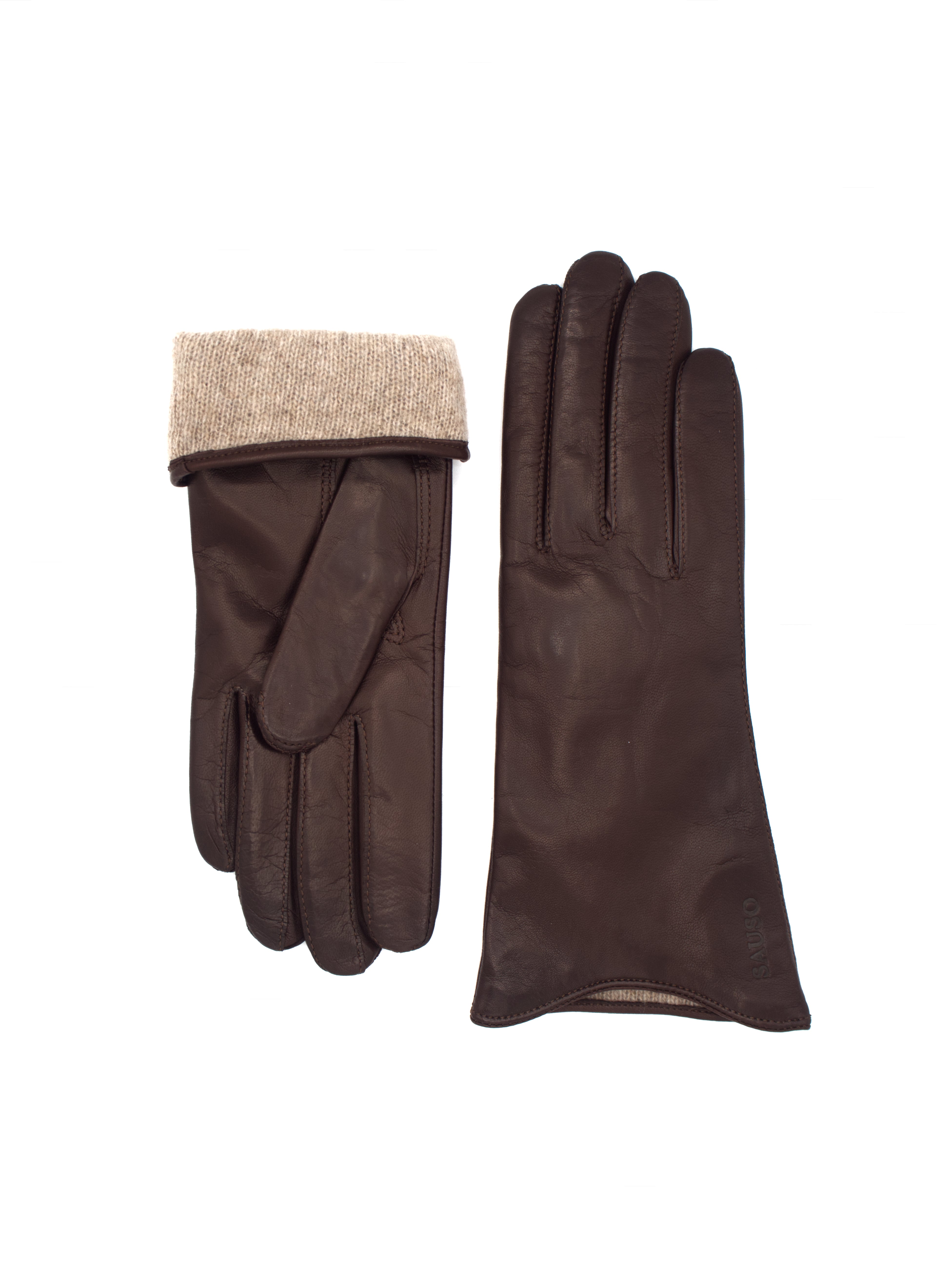- Tummanruskeat naisten nahkakäsineet kashmir-villavuorilla