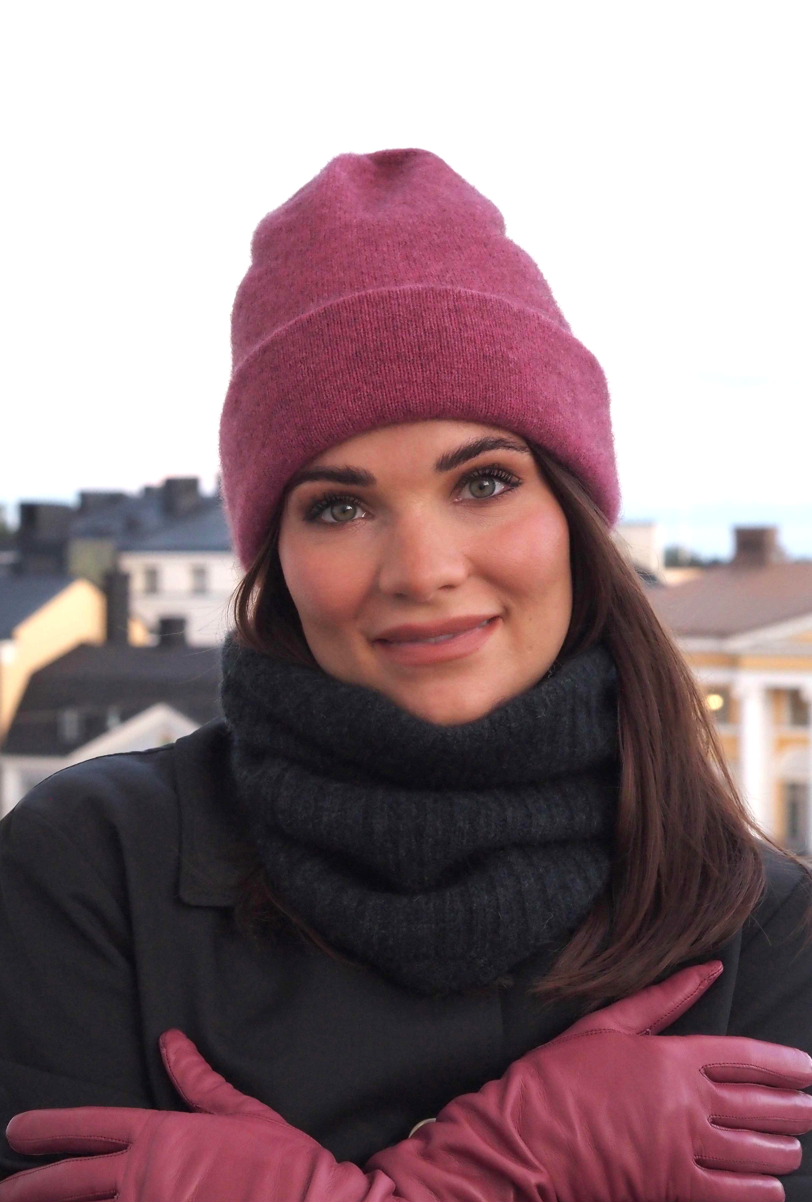 • Eine pinkfarbene Strickmütze aus Merino-Fuchsfell. Die elastische Mütze ist für die ganze Familie geeignet.