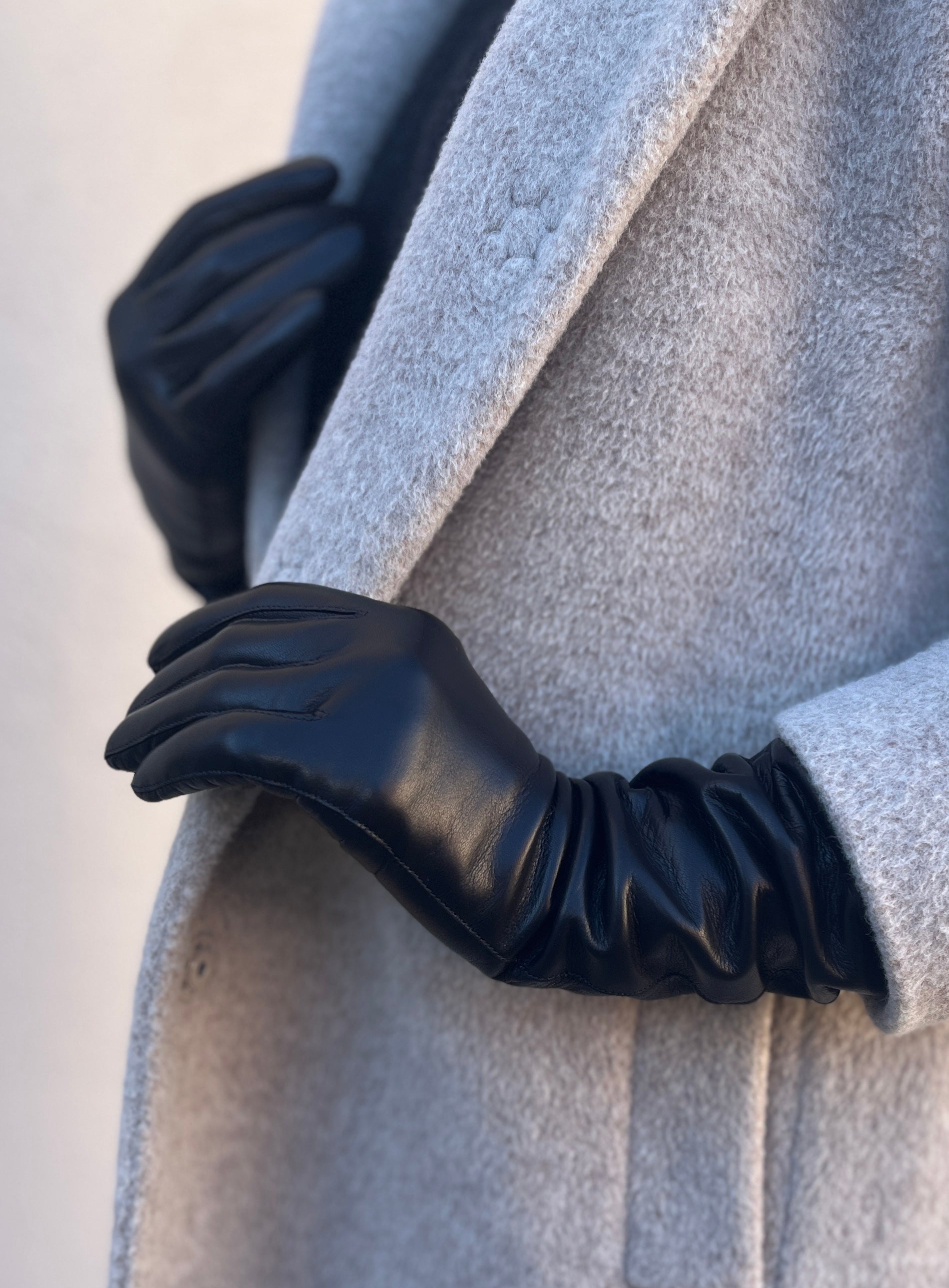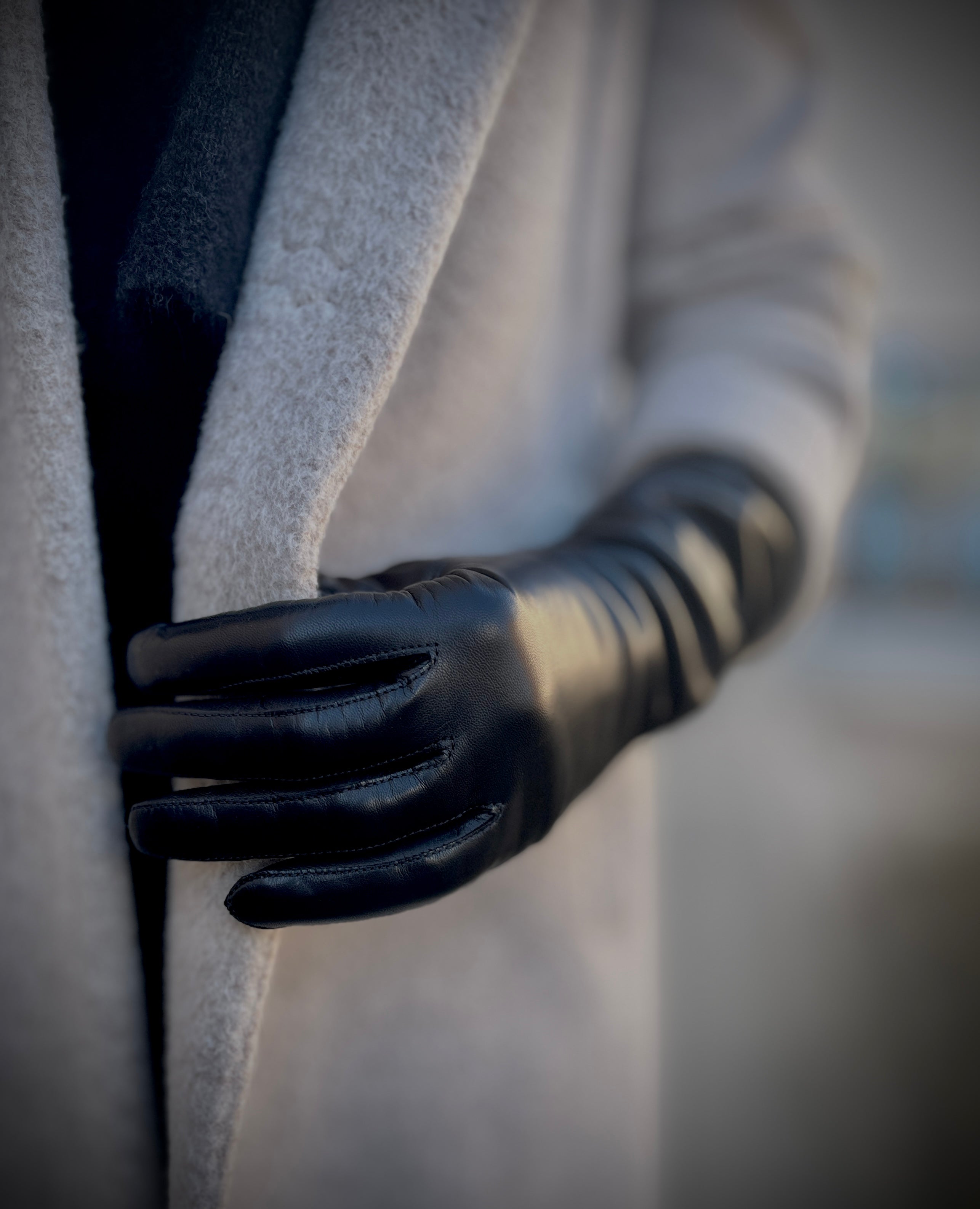 Enchanting long-handled gloves. My favorite gloves are suitable for both everyday life and parties. The length of the glove shaft is 8” (approx. 20cm) so it also works great as a showy party glove! The elegant long sleeve also goes well with short and/or wide-sleeved coats or capes. Because the leather and silk lining are so thin, the glove sleeve fits well under the jacket sleeve. The versatile gloves are also practical to warm the arm with short-sleeved tops under the jacket.